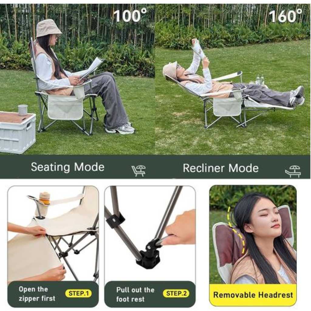 Key Features: [2-Level Reclining Backrest]This portable camp chair can be tilted to 100°/160° to satisfy different backrest positions, which allows you to sit or recline to enjoy a comfortable time.