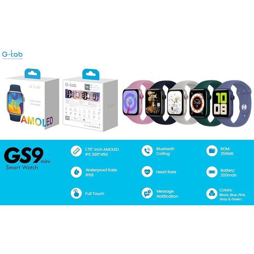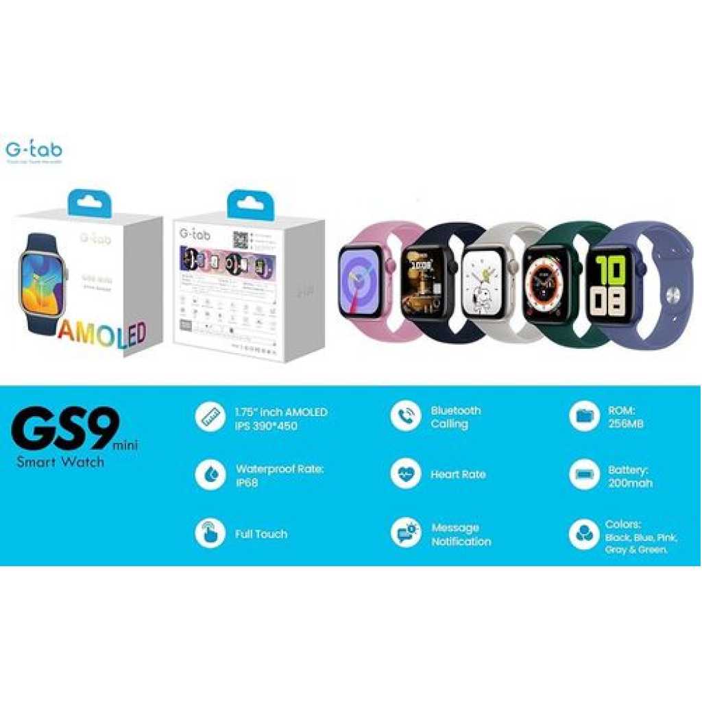 Key Features: G-Tab GS9 Mini 1.75 Inches Amoled Always Display On Raise to Awake Health Tracking Multi-Sport Mode1 GB Storage- Multicolor Display: 1.75 inches AMOLED screen. Always on display for quick access to information. Photo Album: Store and view your favorite photos directly on the smartwatch. Menstrual Cycle Tracking: Integrated menstrual cycle tracking for health and wellness monitoring. Raise-to-Wake: Convenient raise-to-wake feature for effortless activation. Social Media Integration: Stay connected with your social circle with seamless integration for popular social media platforms. Games: Enjoy entertainment on the go with pre-installed games for leisure. Business Card Management: Organize and manage business contacts with a dedicated business card feature. Health Tracking: Comprehensive health tracking features, including heart rate monitoring, sleep tracking, and step counting. Multi-Sport Mode: Engage in various sports activities with dedicated modes for accurate tracking and analysis. Storage: 1 GB internal storage for apps, photos, and other data.