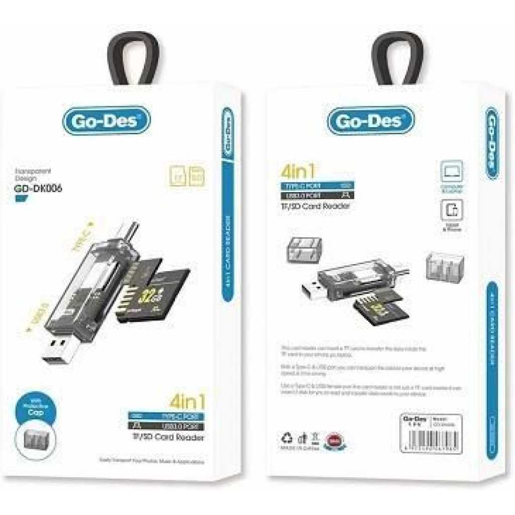 Go Des GD-DK006 Type-C & USB-A Output 4 in 1 OTG Memory Card Reade This product brings a brand new breath to the world of technology! Push your limits with Go-Des GD-DK006 Memory Card Reader and move to a new dimension in data transfer! Enjoy fast and secure data transfer thanks to Type-C and USB outputs! This OTG adapter, which you can use both on your mobile devices and on your computers, will make your life easier with its practicality and functionality. Our product makes your files instantly accessible with the ability to read Micro SD and SD memory cards. For example, shoot with your video camera and instantly transfer it to your phone or computer! Moreover, thanks to the USB 3.0 output port, you can easily connect external devices such as keyboard, mouse, flash disk. For unlimited connection experience, it’s for you! Go-Des GD-DK006 is dazzling with its stylish and compact design. Whether you are at work or on travel, this product will always be with you. Thanks to the easy-to-use plug-and-run feature, you can transfer your data without wasting time. You will draw attention to yourself with its transparent and modern appearance. Being portable and convenient, this product will make your favorite technology accessory. Exceed your limits, share your data quickly and make your life easier with Go-Dest GD-DK006 4 in 1 OTG Memory Card Reader. This product is a candidate to be indispensable for technology enthusiasts! Experience now and start a new era in the world of technology!
