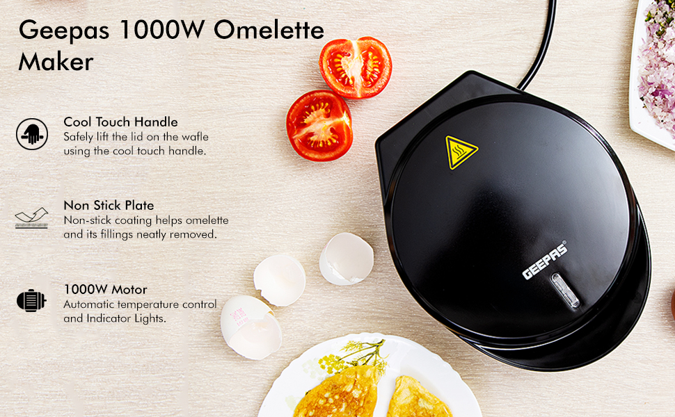 Key Features: Geepas 1000W Omelette Maker | Dual Electric Non-Stick Egg Cooker | Automatic Temperature Control & Power Light Multi Cooker for Omelettes, Fried, Poached & Scrambled Eggs | Cool Touch, 2 Year Warranty – GOM36535 HEALTHY OMELETTES, NON-STICK PLATES – With this egg cooker, you don’t need oil or butter for the cooking process. Non-stick surface allows you to lift your cooked omelettes from the cooking plates easily and with no mess. Create and enjoy delicious chef-quality omelettes without the need for flipping or turning with this electric, two-sided omelette pan. You can also enjoy delicious fried eggs and scrambled eggs for a hot breakfast or protein-packed snack. MAKES 2 OMELETTES AT ONCE, 14MM DEEP PLATES – Cook 2 omelettes at once without any flipping required, with different fillings (14mm Deep cooking plates) of choice & can also be used to cook fried & scrambled eggs or protein-packed snack. The machine is so easy to use with lights to indicate ‘pre-heating’ and ‘ready’. Make perfectly fluffy omelettes, cakes, pastries and much more with little or no oil. EXTRA ADDED FEATURES – The semi-circle moulds produce thick and perfectly formed omelettes whilst the dual heated plates ensure both sides are cooked to perfection! With the cool-touch handle, you can open your compact omelette cooker safely and remove your tasty creations without any hassle. The machine is so easy to use with light to indicate ‘ready’. Also features non-slip feet and cord storage along with Automatic temperature control and Indicator Lights. EASY TO CLEAN AND SAFE TO USE – The Omelette maker features non-stick plates making it an easy clean. Simply wipe down the plates and outer casing with a damp soft cloth and store away until you crave another delicious meal. The cool touch handle makes it easy to open and close the lid whilst the non-slip feet ensure it remains on your worktop throughout the process. 2 YEARS MANUFACTURER WARRANTY INCLUDED