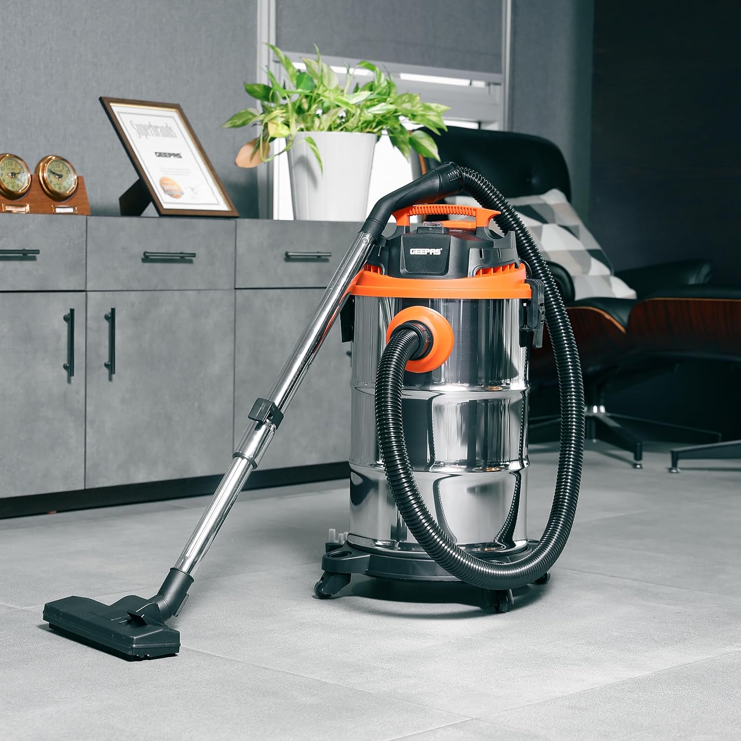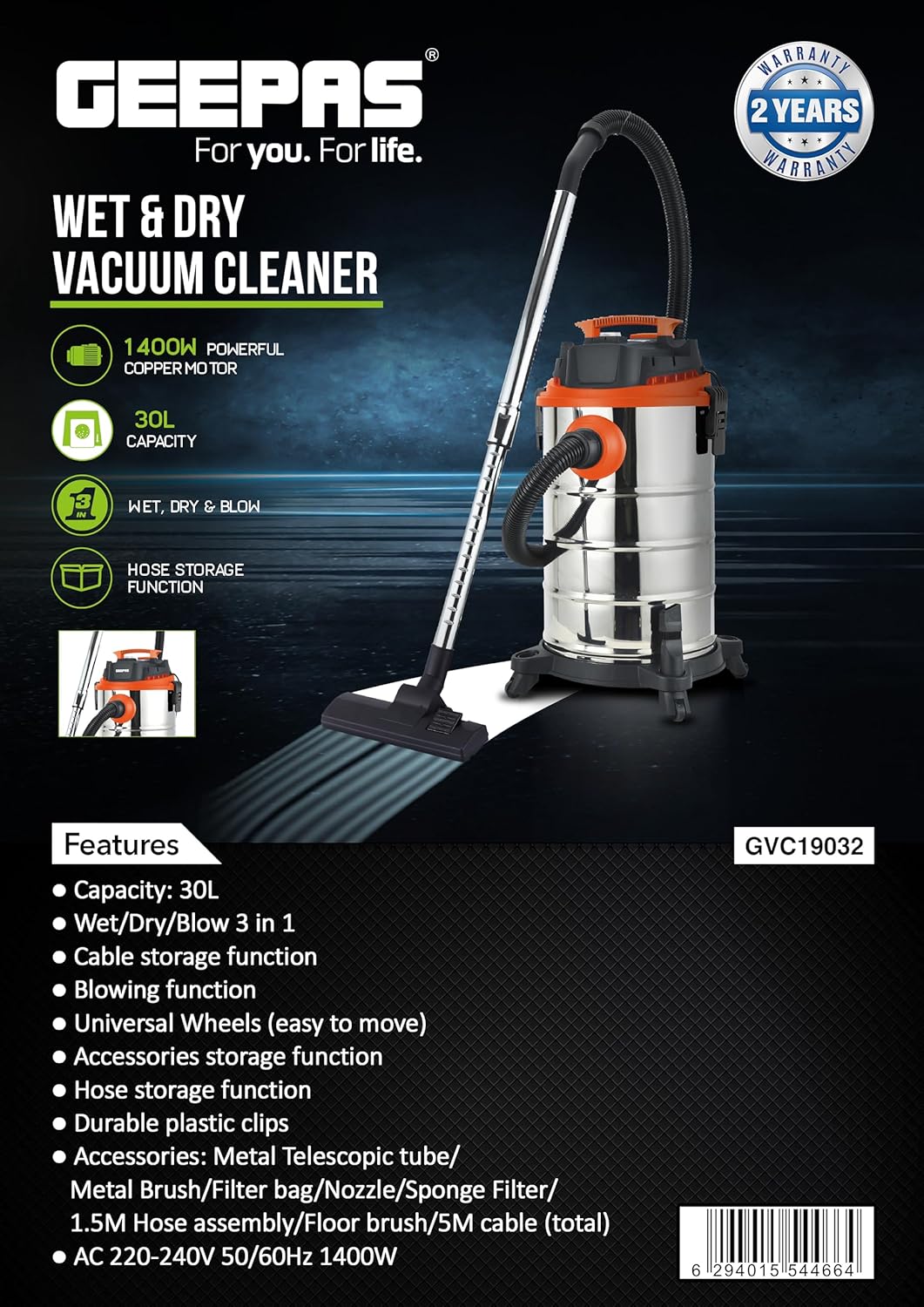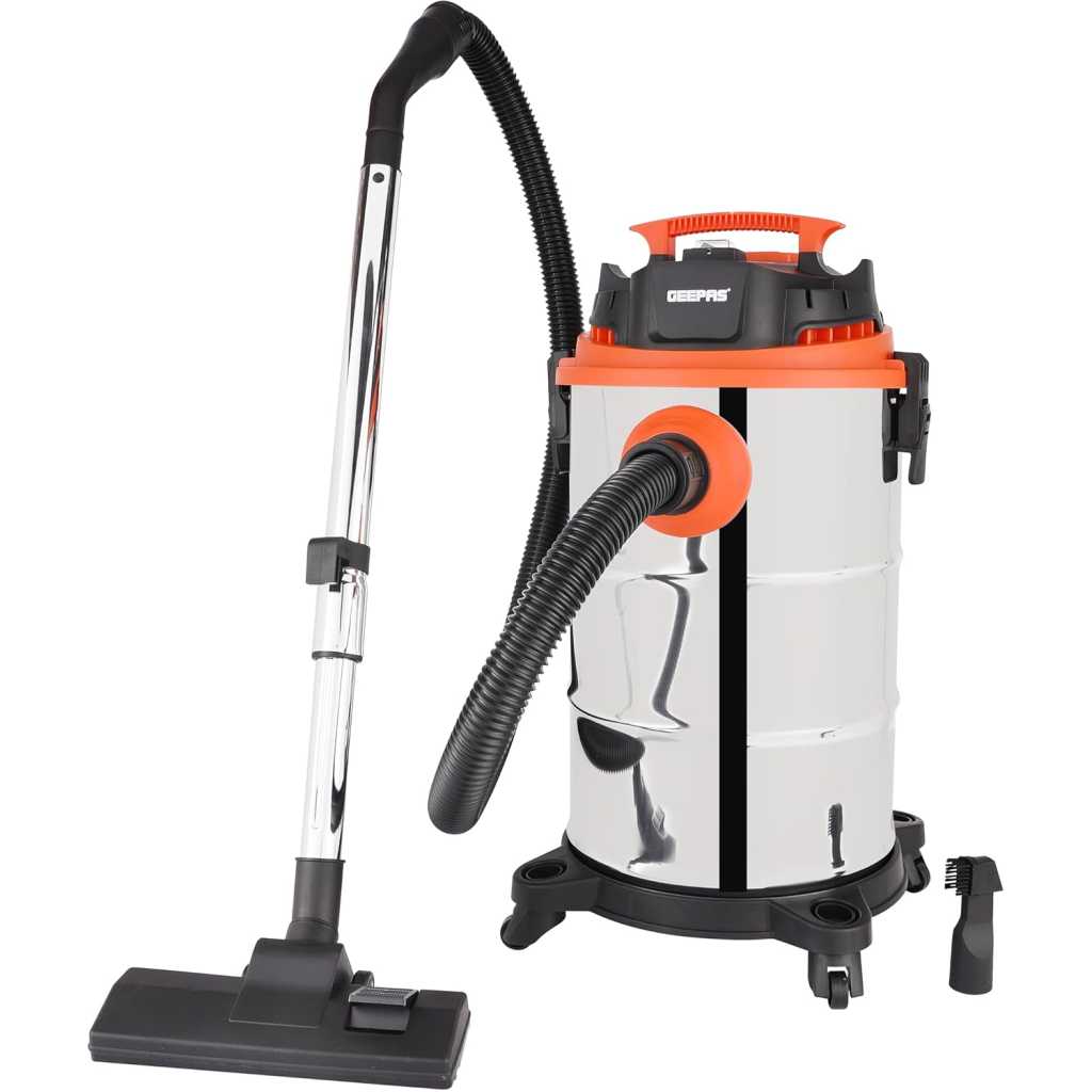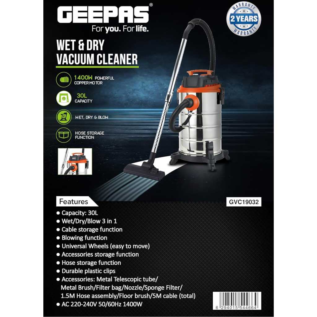 You deserve a sparkling floor. With the newly designed Geepas wet and dry vacuum cleaner, you can get clean, spotless floors and corners with ease. This 3-in-1 vacuum cleaner is designed and manufactured from the finest quality materials, along with a powerful 1400 W motor, making it highly resistant to corrosion, highly durable, and long-lasting. The compact, modern, and stylish design adds to the look of the vacuum cleaner. The portable design with universal wheels makes it easy to carry around the house. With a high-performance, 1400-watt motor and powerful suction, this appliance provides spotless cleaning in no time. The vacuum cleaner also has a 3-in-1 function: a wet vacuum, a dry vacuum, and a blower, allowing you to not only vacuum up wet and dry spaces but also blow them away if needed. You can easily pick up liquid spills and dry debris and even blow leaves and dirt out of tight spaces. The vacuum cleaner is ideal for cleaning tiled floors, carpets, walls, and other difficult-to-reach areas and provides a quick and effortless cleaning experience. The flexible hose allows you to reach all the nooks and crannies in your room. The vacuum cleaner also features a dust bag with a capacity of 35 liters that can hold a large amount of debris without needing to be emptied frequently. The wheels and 5-meter-long power cable let you move around freely when you’re cleaning, and the hose and accessories storage function makes it easy to keep things organized. It has a powerful suction that effectively removes deeply embedded dust and dirt from furniture, hair, cereal, paper bits, and other particles from other surfaces. Its stylish silver color, unique structure, and portable design make this vacuum cleaner an attractive choice for any home. A metal telescopic tube, a metal brush, a filter bag, a nozzle, a sponge filter, a 1.5-meter hose assembly, a floor brush, and a 5-meter total cable are also included in the package. The vacuum cleaner comes with a 2-year warranty. “