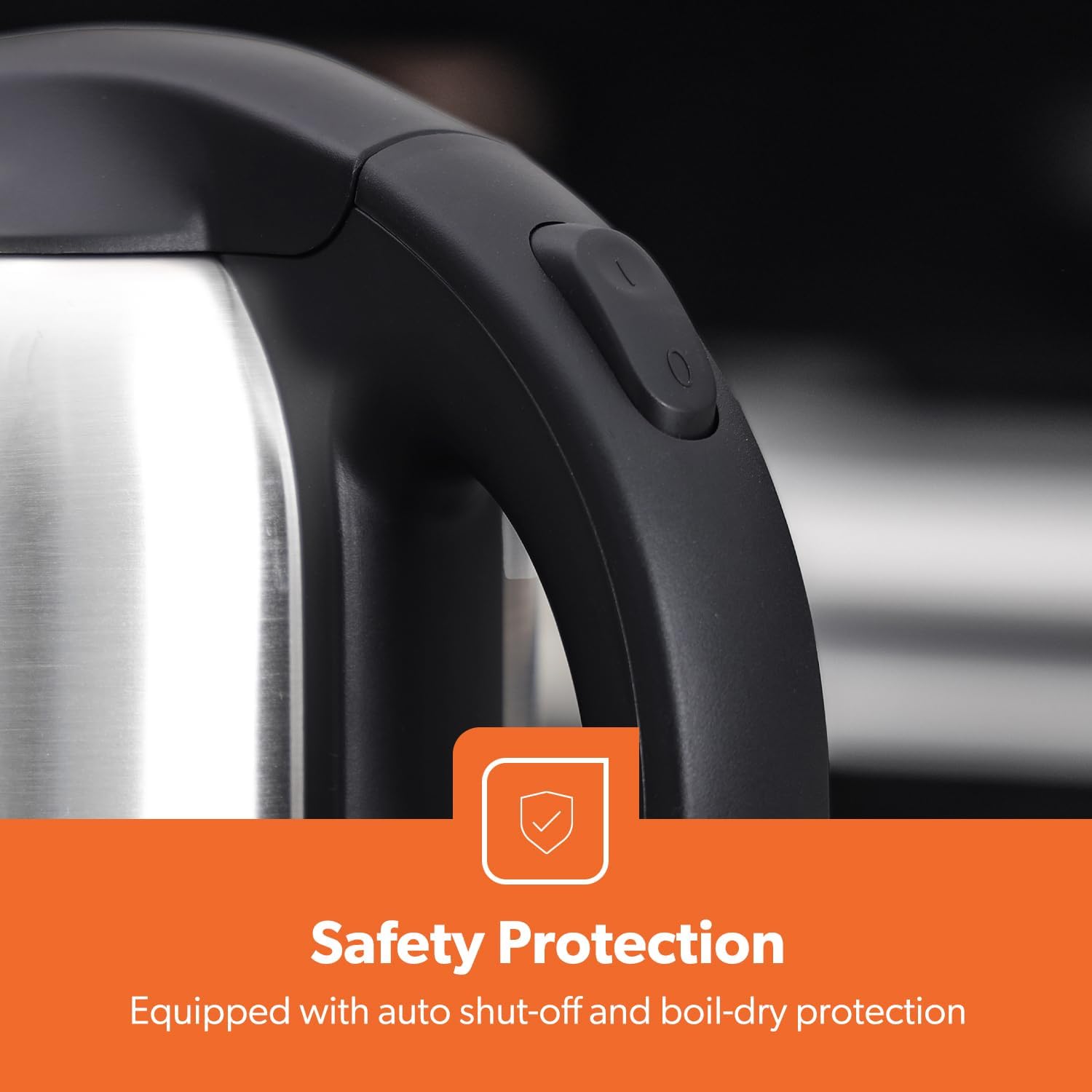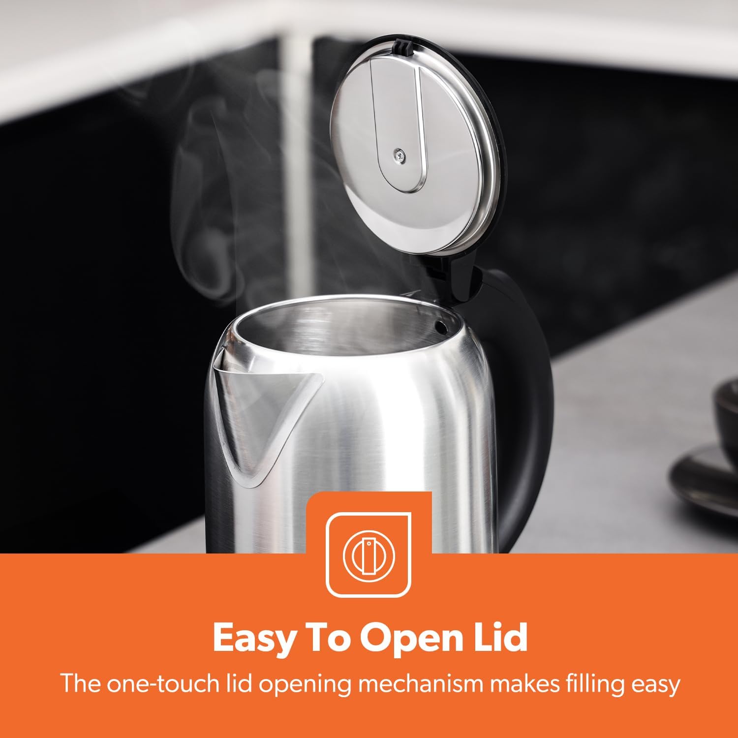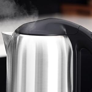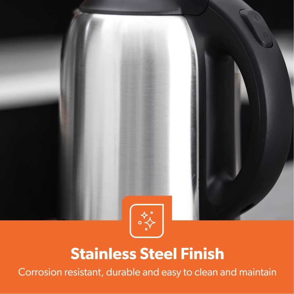 Key Features: AUTO SHUT-OFF & BOIL-DRY PROTECTION – Automatic shut off function upon boiling and the boil-dry protection prevents it from boiling if there is insufficient water present. CAPACITY 2.0L – The capacity of this Electric Kettle is 2.0 L. Large size helps to make multiple cups of tea or coffee. To make pouring comfortable and easy, the kettle features an ergonomic handle. SAFETY LOCK LID, 360° ROTATIONAL BASE – The lid fixes nicely into place and is locked by a safety lock. To keep the kitchen tidy, the base has integrated cord storage so it can be tidied away at your convenience & the handy 360° base means it can be comfortably used by right & left-handed people. STAINLESS STEEL – This Electric Kettle is made of stainless steel and is distinguished by their durability and makes a healthy kitchen appliance to heat up water. Comes With 2 Years Of Manufacturer Warranty. Easy-pour spout makes it easy to pour hot water without making a mess