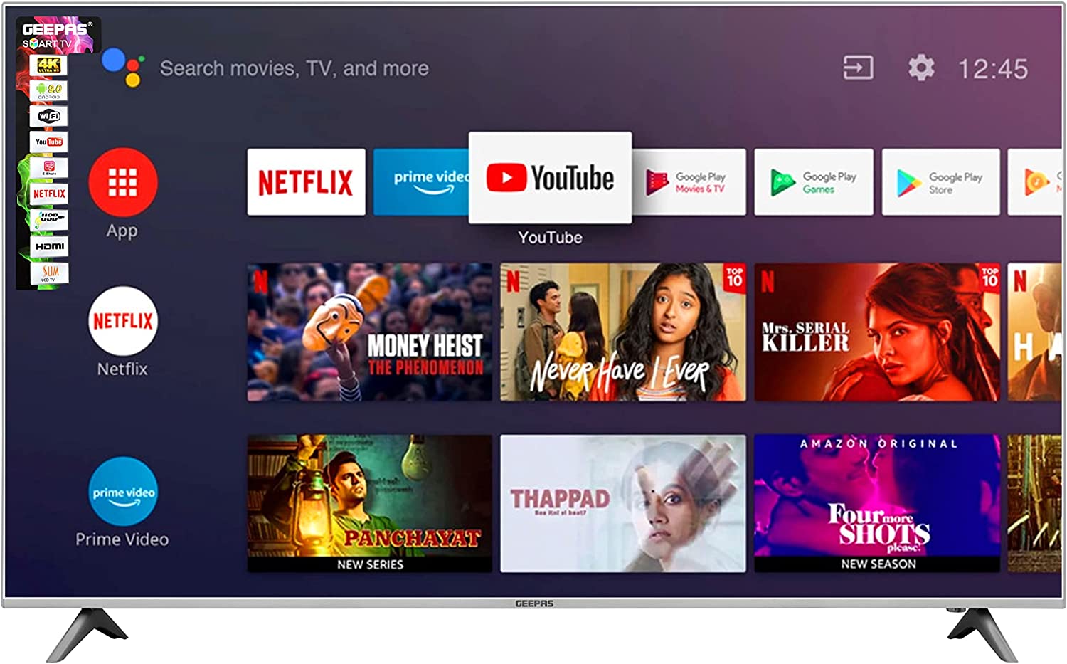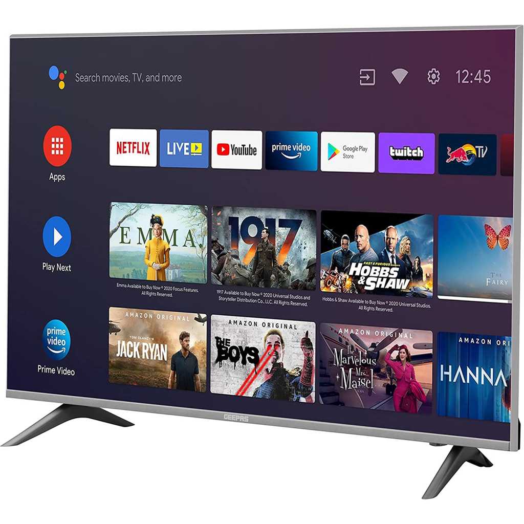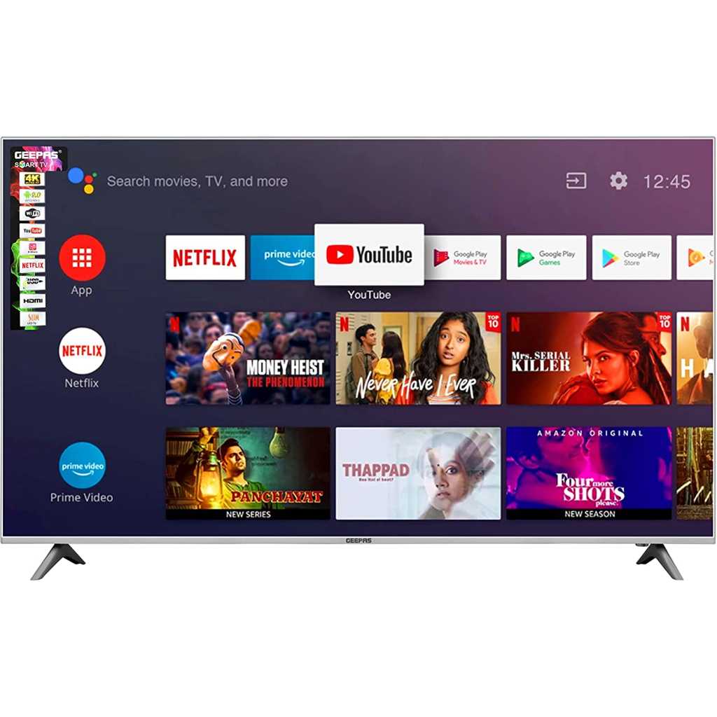 Geepas 50″ Android Smart UHD 4K LED TV – Slim Led, 3.5mm, 2 HDMI & 2 Hi-High USB Ports | Wi-Fi, Android 8.0 With E-Share & Mirror Cast | Comes Application Like YouTube, Netflix, Amazon Prime | 1 Year Warranty. 1. 1080P ULTRA HD VIDEO QUALITY – Explore every detail in brilliant clarity, along with lifelike colours and enhanced brightness. Advanced Full HD technology with a remarkable viewing experience bringing the picture quality to life. It optimizes every scene for a splendid expression. 2. MIRROR CAST – Easily mirror photos, videos, or games on your mobile phone to your TV screen. Enjoy all your phone content on your big screen. 3. SMART FEATURES – Built-in, enjoy thousands of apps in Android 8.0 and channels including Netflix, YouTube, Prime Video, BBC, ITV, Channel 4, Disney, and more (subscription fees may apply). 4. 8.0 Android TV – HD Ready display, cinematic HQ sound, multiple ports, leading performance, and mirror cast feature with an android 8.0 version. Android TV offers thousands of movies, shows, and games from Google Play, YouTube, and your favourite apps. You can easily cast movies, shows, and photos from your Android or iOS device. 5. Wide viewing angle – Enjoy the same consistency and clarity from almost any viewing angle 176”-176”. Sit at any corner of the room you will experience the same quality. 6. COMES WITH 1 YEAR OF MANUFACTURER WARRANTY.