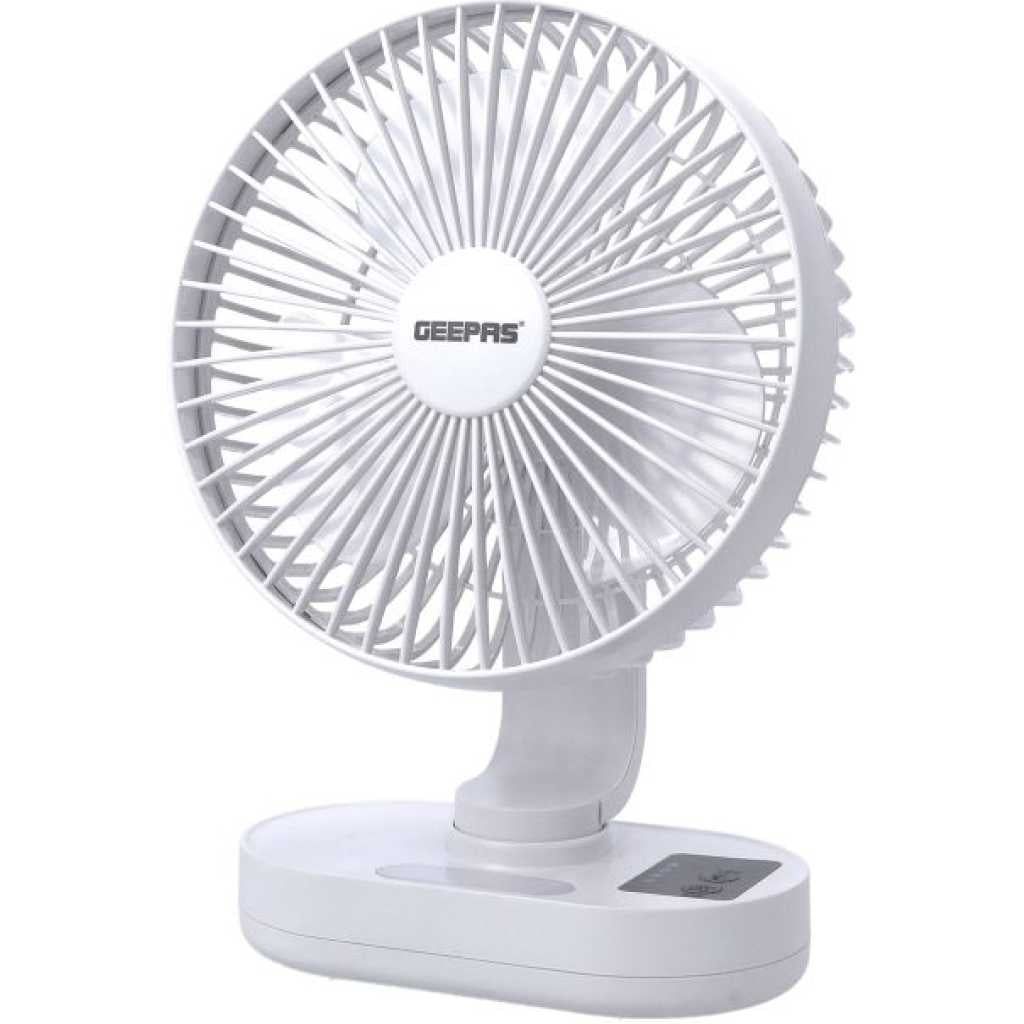 Key Features: Geepas 8-inch Rechargeable Fan with Night Light, GF21157. 8-inch Rechargeable Fan with LED Night Light 3 Speed Settings High-Capacity 2×3.7V Lithium Battery Up to 9 Hours of Continuous Operation Adjustable Fan Head Portable and Lightweight Design Quiet Operation Safety Grill