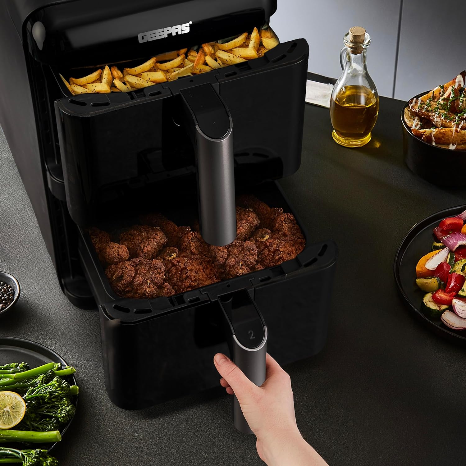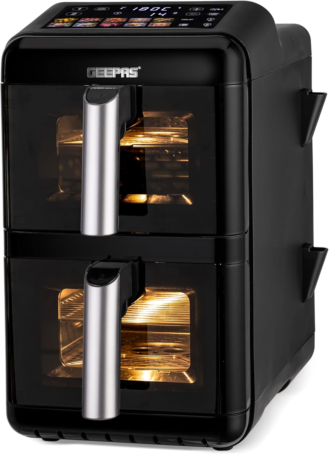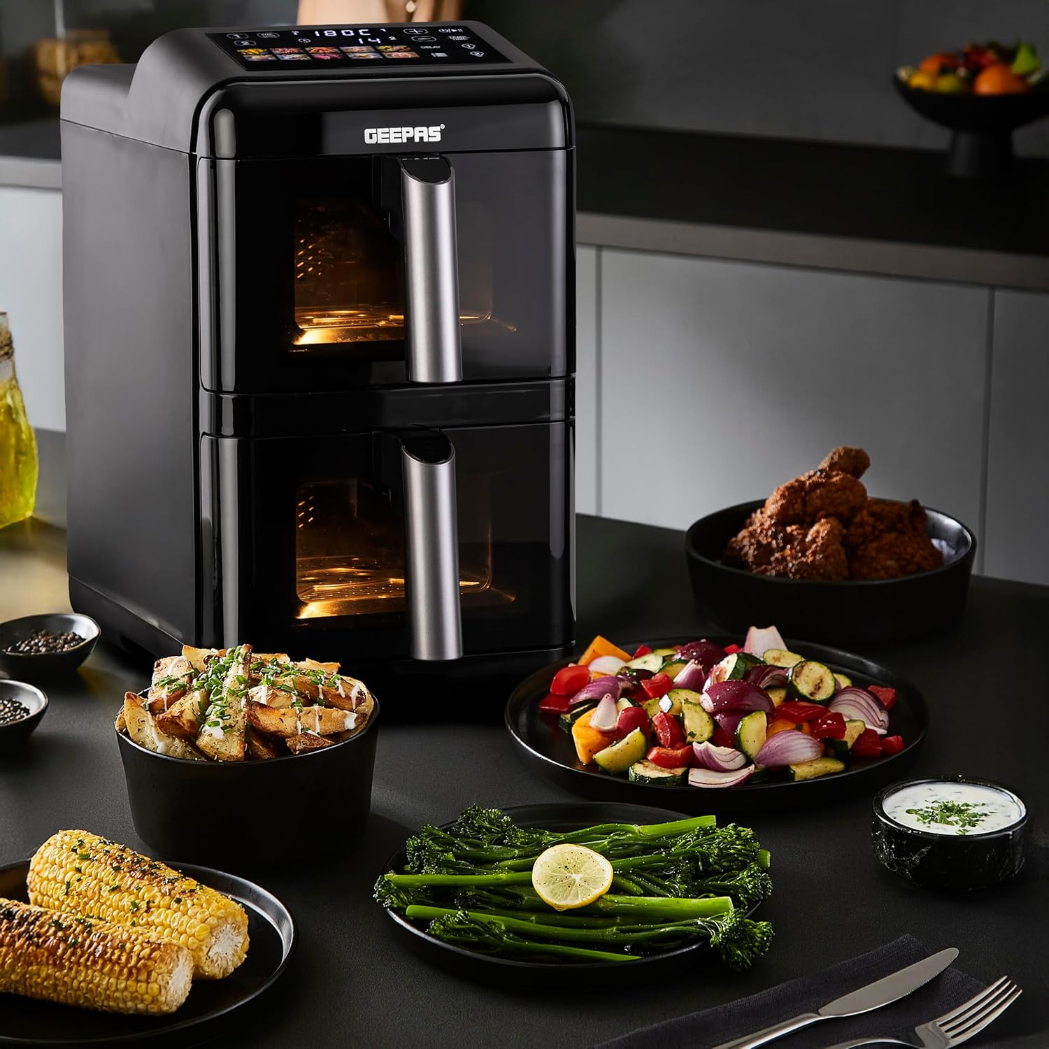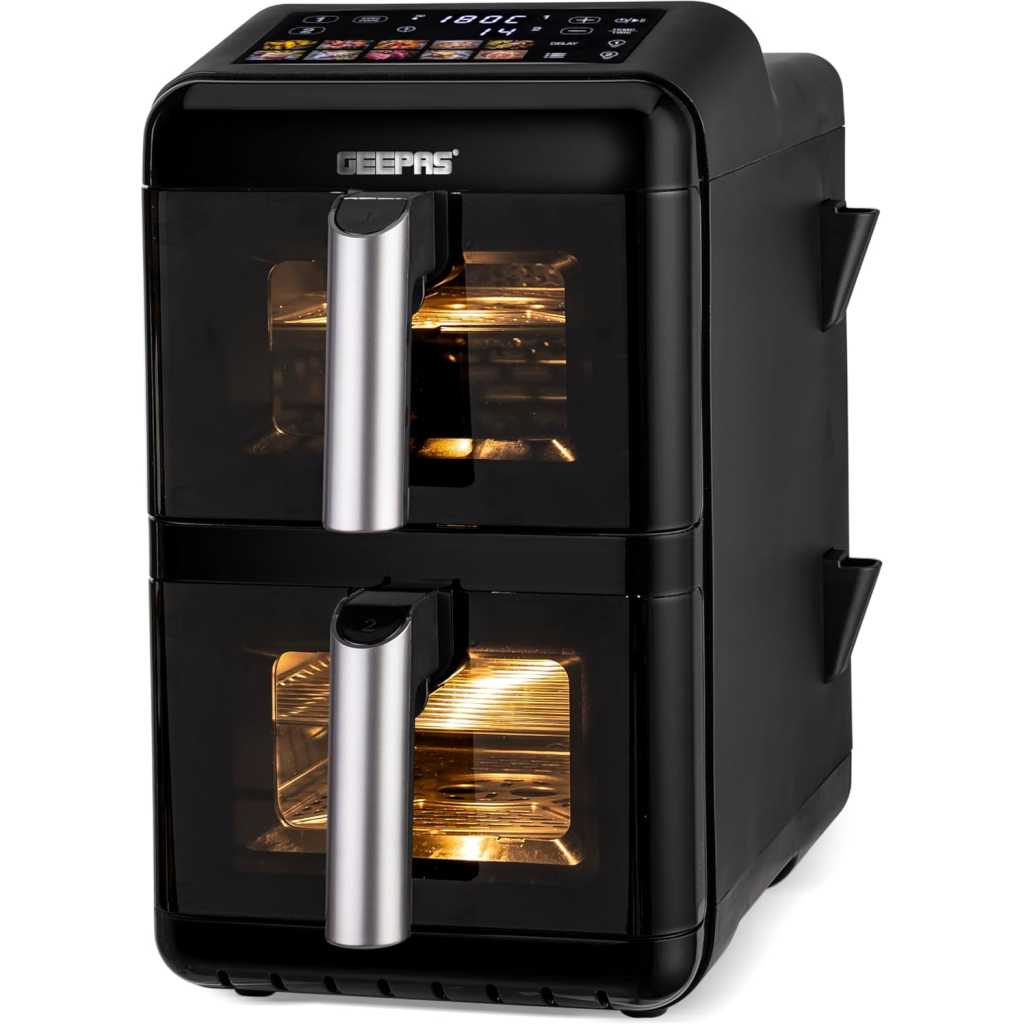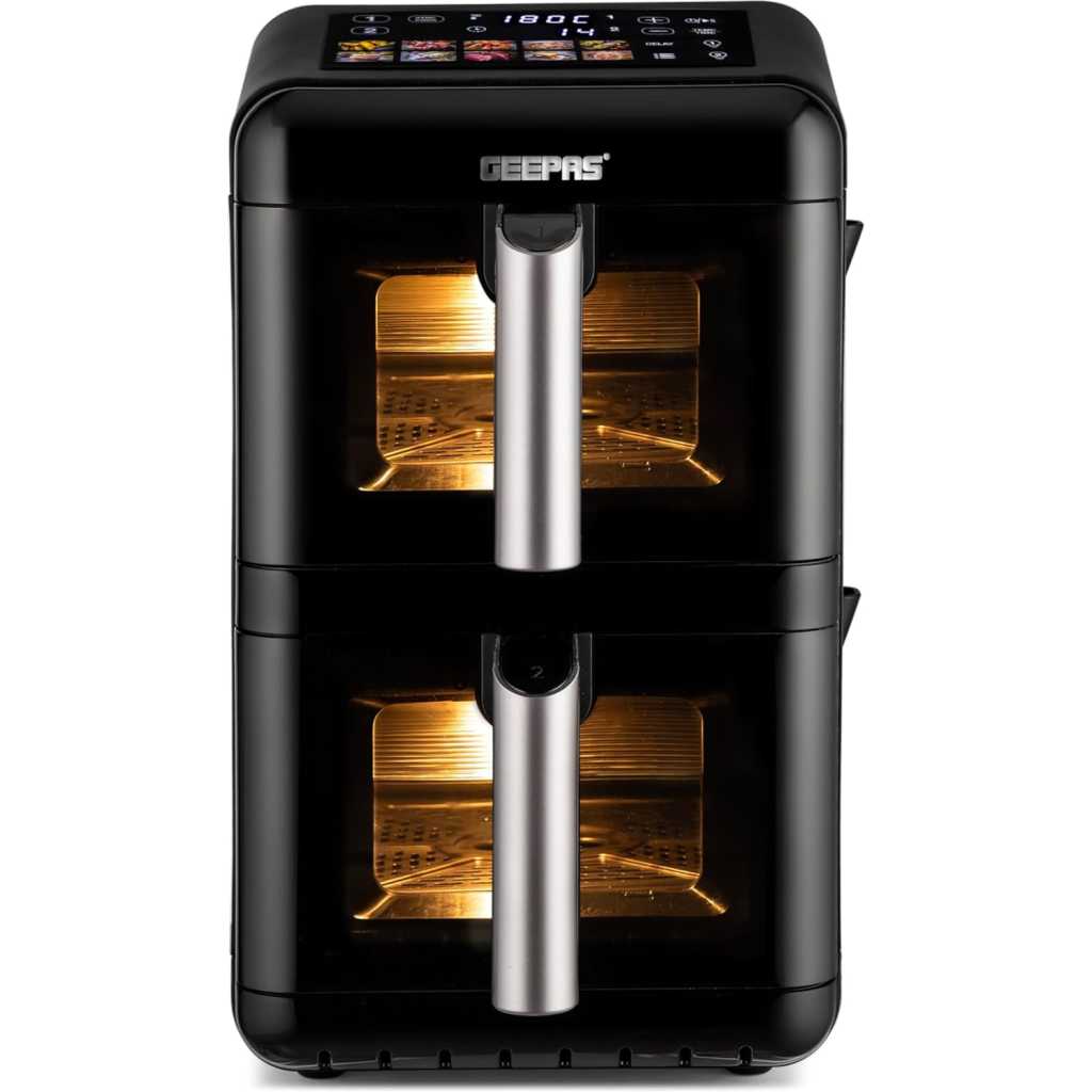 Experience smarter, faster, and healthier cooking with the Geepas 2800W Dual Basket Digital Air Fryer. Designed with innovation and convenience in mind, this advanced appliance features a 12-liter total capacity divided into two 6-liter vertically stacked baskets, allowing you to cook multiple dishes at once without mixing flavors. It is ideal for preparing perfectly fried, healthy, low-fat food without oil for the entire family. The air fryer uses VORTEX air frying technology, which cooks 50% faster with 70% less energy and ensures food is not greasy. It helps you prepare delicious foods that are crispy on the outside and tender on the inside with little to no added oil. The dual-layer nonstick coating offers quick food release and effortless cleaning, while the colorful touchscreen display provides intuitive control over 10 preset cooking modes. With customizable temperature settings (40C-200C) and a 1-60 minute timer, you can fine-tune your cooking preferences for perfect results, from crispy fries to tender grilled vegetables. You can cook various food items in it, including fries, chicken, sausages, bread, cake, and more. The strong and sturdy construction provides effortless cooking. The air fryer is also easy to clean and maintain. The genius design and utility features make it an ideal option for your kitchen, and it is also an excellent choice for gifting. Compact yet spacious, this vertical design saves counter space while doubling your efficiency. The Geepas digital air fryer comes with a 2-year warranty. The air fryer measures 51.2×27.8×44.7 cm and weighs 11 kg.