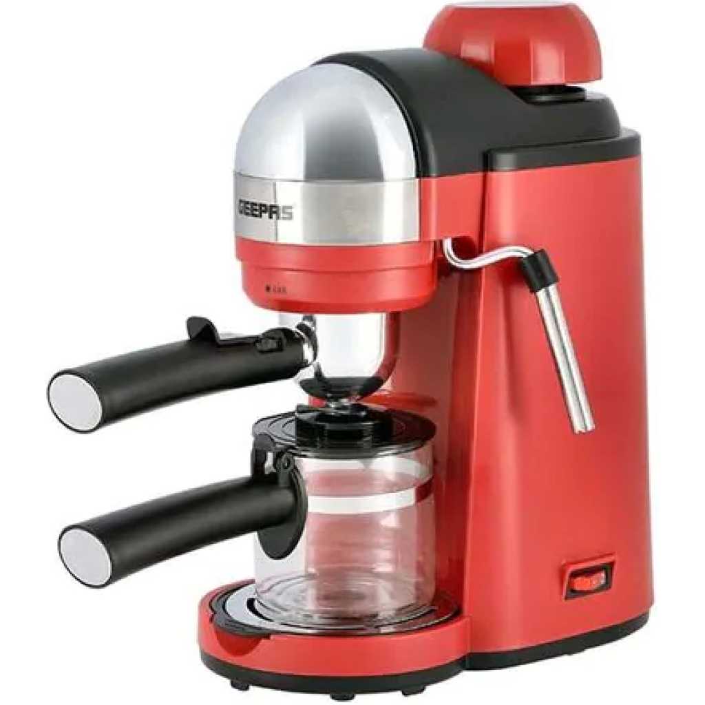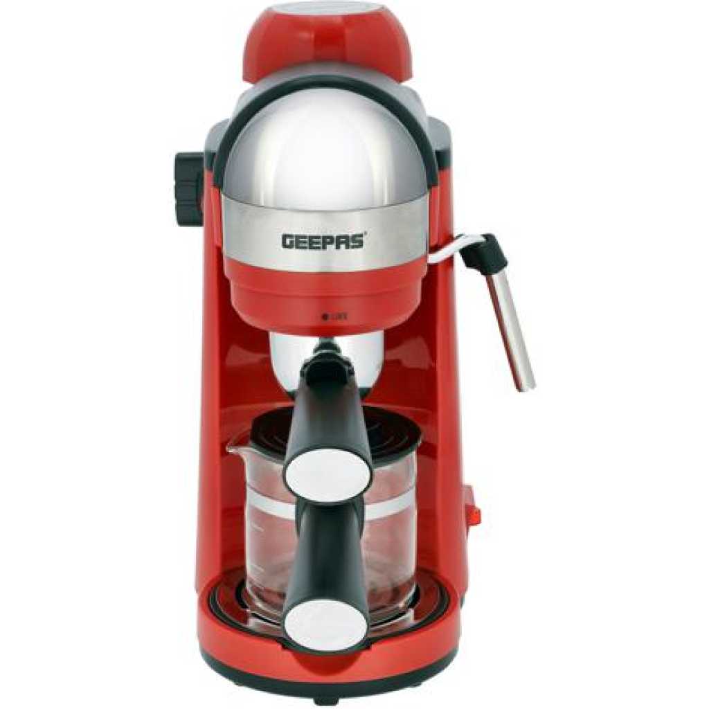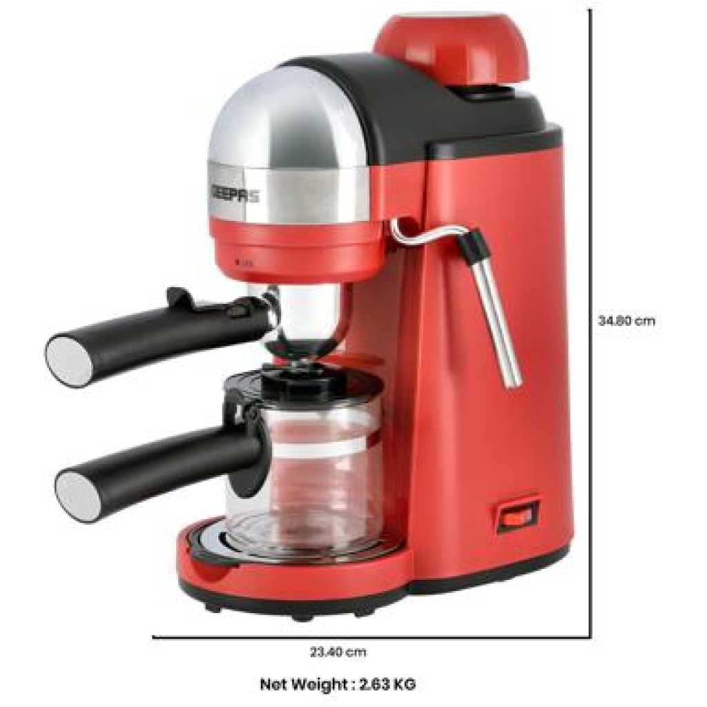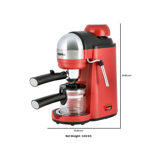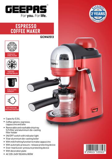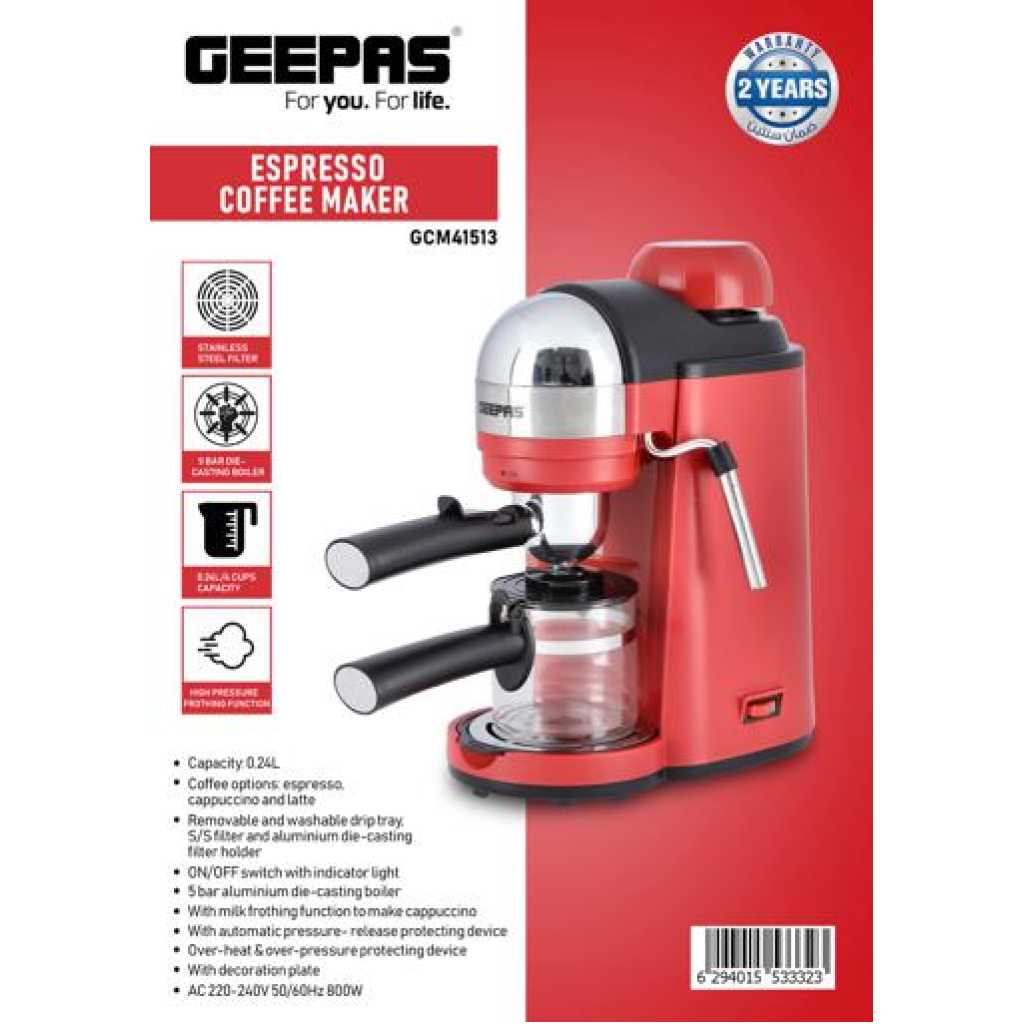 Geepas Espresso Coffee Maker, 240ml Capacity, SS Filter, GCM41513 | Stainless Steel Filter & Aluminum Die-Casting Filter Holder | 5 Bar High Pressure | On/Off Light Indicator. Capacity: 0.24LCoffee options: Espresso, Cappuccino, and LatteRemovable and washable drip tray. S/S filter and aluminium die-casting filter holderON/OFF switch with indicator light; 5 bar aluminum die-casting boilerWith milk frothing function to make cappuccino With automatic pressure release protecting deviceOver-heat & over-pressure protecting device; With decoration plateAC 220-240V 50/60Hz 800W3 IN ONE ESPRESSO MACHINE FOR CAPPUCCINO - With automatic built-in milk frothing. Can be used as an espresso coffee machine, Cappuccino machine, and latte machine. Customize milk-based espresso. It is compatible with Nespresso, Coffee Pod, and Coffee powder.DIE-CAST ALUMINIUM ALLOY BOILER WITH 0.24 L WATER CAPACITY – High-quality durable boiler will give perfect taste and aroma to your coffee and you can make up to 4 cups of coffee and enjoy it with your family, friends, or colleagues. Comes with a large 0.24L water tank.ADJUSTABLE MILK FROTHING - The adjustable steam set controls the built-in steam wand to steam or heat milk. With an articulating dual hot water and steam wand. It will help you to prepare your favorite Espresso based drink.5 BAR HIGH-PRESSURE SYSTEM - 5 Bar high-pressure pump is essential for well-brewed espresso with a thick layer of crema. Provide the right amount of pressure for flavor extraction. Force a small amount of nearly boiling water through finely-ground coffee to make true espresso.PERMANENT FILTER - This Coffee machine allows you to wake up to fresh coffee every morning. Eliminate the need to buy costly paper filters as this coffee machine has a permanent filter that can be removed and washed, however filter paper can still be used if you prefer. Fewer refills, more savouring!OVERHEAT AND OVER PRESSURE SAFE - Here this coffee maker is user-friendly and safe as it prevents overheating and overpressure of your hot drink and turns off automatically once the coffee is ready.