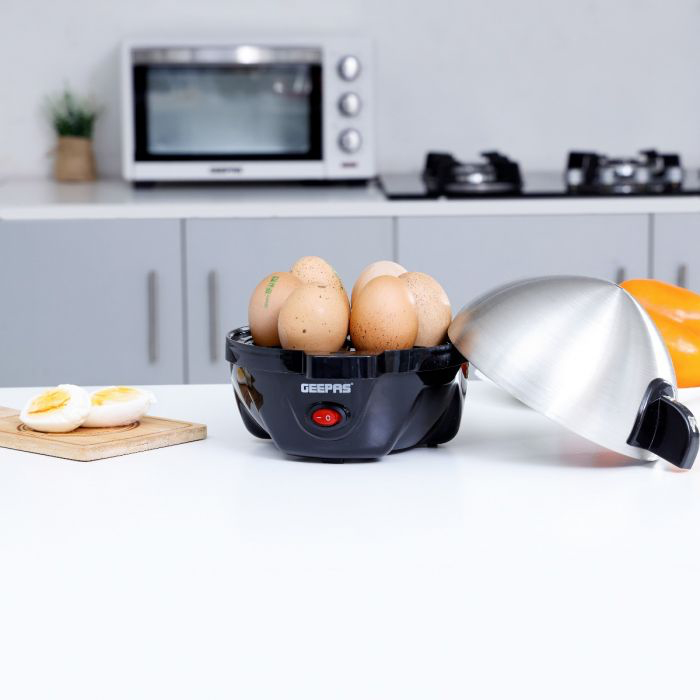 Geepas 350W Egg Boiler – Egg Cooker Whether you like yours hard, soft or medium-boiled, the Geepas Electric Egg Boiler will cater to your requirements and help to put a spring in your step as you head out of the door for the day! HEALTHY EATING: Lock the nutrients into your eggs by cooking your eggs with the Geepas Egg Boiler. Simply use the handy pin located at the bottom of the measuring cup to pierce a hole in eggs to allow them to cook thoroughly. LARGE 7 EGG CAPACITY: The egg cooker can boil up to seven eggs at one time whether you like your eggs soft, medium or hard just change the water volume and let the egg cooker do the rest QUICK, HEALTHY AND HASSLE FREE – The Geepas Egg Boiler maintains all the egg nutrients and keeps all the deliciousness and taste preserved. It saves you the trouble of having to look after the eggs. Get freshly cooked eggs for your breakfast with ease. It is also great for steamed foods. COOKS 7 EGGS AT ONCE – This boiler tray has the capacity of holding 7 eggs. It cooks soft, medium or hard eggs just change the water volume and let the egg cooker do the rest. MULTIPLE COOKING FEATURES – This egg boiler can do more than just boiling. Try out all of your egg creations on this multifunctional egg cooker. The measuring cup provided has to mark guidelines for the quantity of water to be used for cooking eggs according to your preference- soft, medium or hard. AUTOMATIC BUZZER, POWER LIGHT, SWITCH CONTROL (STOP & HEAT) – Comes equipped with all the important features for your safety. PERFECT AID FOR A NUTRITIOUS BREAKFAST.