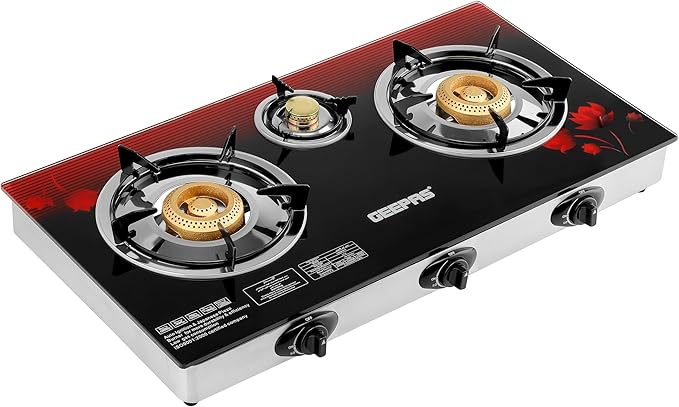 ATTRACTIVE & ERGONOMIC DESIGN, TEMPERED GLASS WORKTOP – This Geepas Stove Right away gives your kitchen a smooth, sharp look and feel with this top-notch Gas-on-Glass Hob and it benefits you with speed, flair, and responsiveness - as well as a stylish, easy to clean glass surface.AUTOMATIC IGNITION SYSTEM WITH 3 HEATING ZONES – Normally with such a modern hob, you would prefer not to utilize matches and burning your fingers, and gratitude to auto-Ignition you won't need to! Basically curve the rotary controls and the burner will ignite.BUILT WITH HIGH QUALITY & DURABLE MATERIALS – This 3 zone gas burner made of 100% stainless steel frame and tray with heavy cast iron support, durable bakelite knobs for easy cleaning and maintenance made easy, more appealing, and enjoyable while cooking.EXPERIENCE FAST & UNCOMPLICATED GRILLING – These hob rings are all independently controlled so you can change the temperature of each heating zone to suit your cooking. And cook 3 different dishes at a time completely hassle-free cooking.EASY TO USE AND OPERATE – Automatic ignition through turning control, adaptable, and exact gas adjustment. Top control, natural gas, and LPG use.COMES WITH 2 YEARS OF MANUFACTURE WARRANTY.
