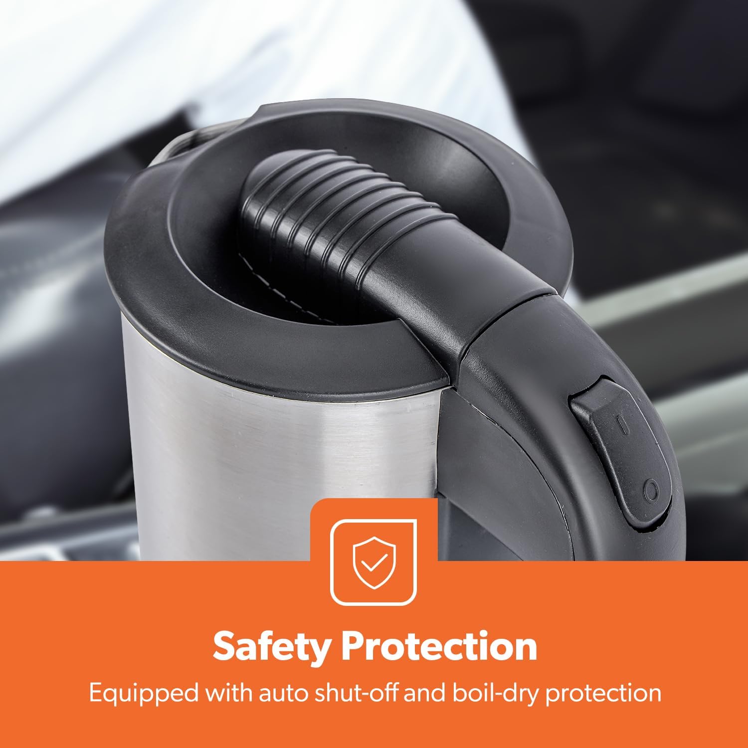 Geepas GK38041 12V Stainless Steel Car Kettle- Water Heater for Caravans- 500ml- Stainless-Steel Electric Car Kettle with Cigarette Lighter Charger | Quick Hot Water, Coffee, Tea. TRAVEL READY HOT WATER CAR KETTLE: 12V electric kettle is ideal for travel, and use when camping, caravanning, and in cars, vans, trucks, and boats. Whether it is covering long distances to reach the office or a vacation destination, a hot cup of tea/coffee is an on-the-go luxury. CAPACITY 500ML, THE PERFECT BREW – The capacity is 500ML, which will be a good size for making multiple cups of tea or coffee. To make pouring comfortable and easy, the kettle features an ergonomic handle. Make your perfect brew, for tea and coffee lovers. CONCEALED HEATING ELEMENT – The concealed heating element of this car kettle provides a more efficient boiling time and protects & preserves the interior of the kettle. Quick to heat perfect serve for 1 or 2 people. CIGARETTE LIGHTER DESIGN – The travel heating kettle plugs easily into standard cigarette lighter 12V sockets, which can be used comfortably in most cars, caravans, trailers, RVs, and motor homes
