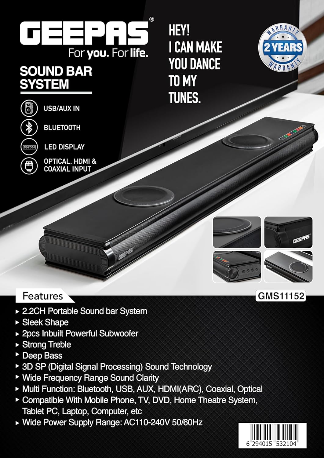 Geepas GMS11152 Portable Sound bar System 2.2CH 2 Inbuilt Sub Woofer with 3D Sound Technology USB/AUX/BT/HDMI/Remote Included Connect to TV, Mobile, Laptop & More, Black. Are You Looking For Advanced Soundbar with powerful subwoofer for TV Yet A Compact Size?With a slim and stylish design, the Geepas Soundbar can fit easily in any home, no worries about taking up a lot of room or blocking the view. Despite the mini size, the sound remains impressive. The 2.2 channel sound system produces immersive and well-balanced sounds, whether while hearing music or while watching movies or playing games.The soundbar is the stunning addition to any TV and gaming console with a modern aesthetic design that fits perfectly with your TV, whether it’s mounted on a wall or displayed on a stand.It has cable inputs and a wide range of connectivity options like (HDMI ARC, Optical, Bluetooth, USB, AUX), the soundbar is suitable for many applications. It can be easily connected to your TV to create a theatre-like sound quality experience. Enjoy surround sound while watching your favourite shows and movies minus the hassle of setting up a complicated speaker system.Enhance your entertainment experience via this Geepas soundbar for TV, laptop, mobile, tablet, pc. So get a more reliable and dynamic sound experience while playing games or listen to music.other Specification -AC 110-240V, 50/60Hz.