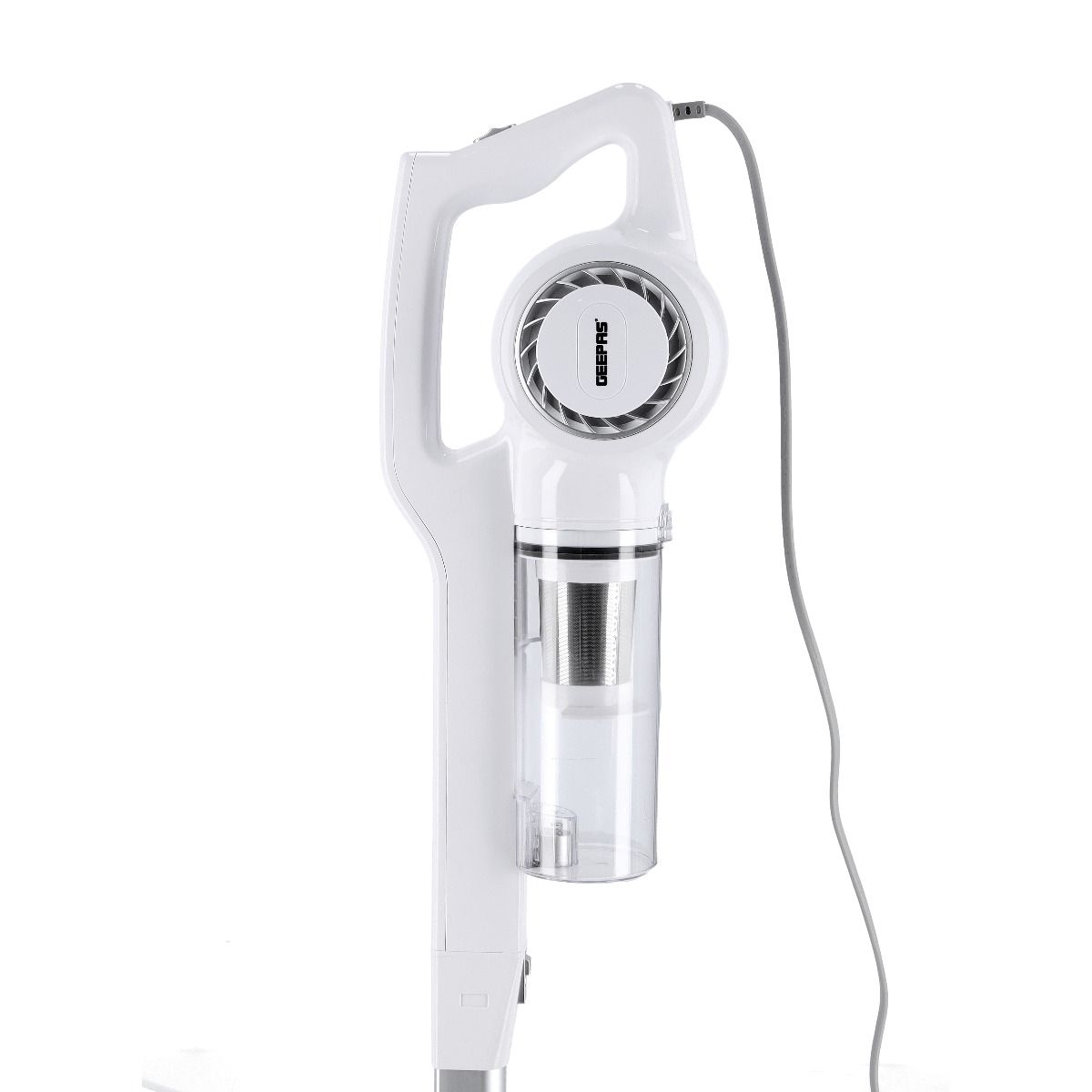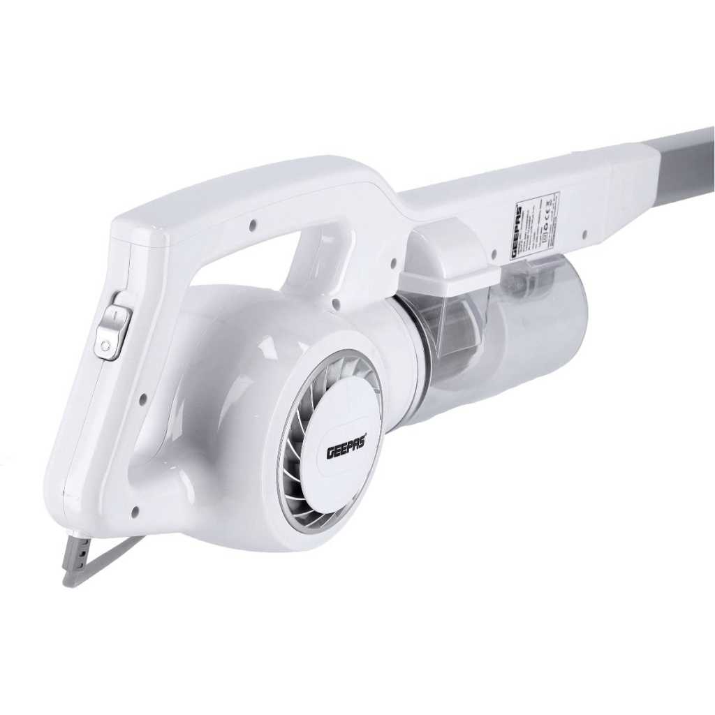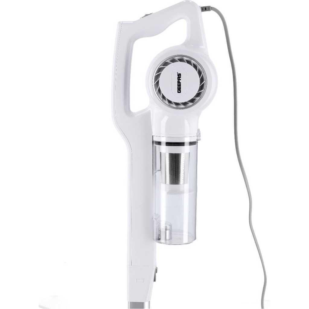 Key Features: Geepas GVC2596 Stick & Handheld Vacuum Cleaner | Hepa Filter | 0.9L Dust Bag. Brand : Geepas Color : White Energy consumption : 600 Watts Package weight in KGs : 3 Tank Capacity : 0.8 Liter.Bagged or Bagless : Bagless.Cordless or Corded : Corded.Model Number : GVC2596.Type : Stick Vacuum Cleaners.Surface Type : Hard Floors