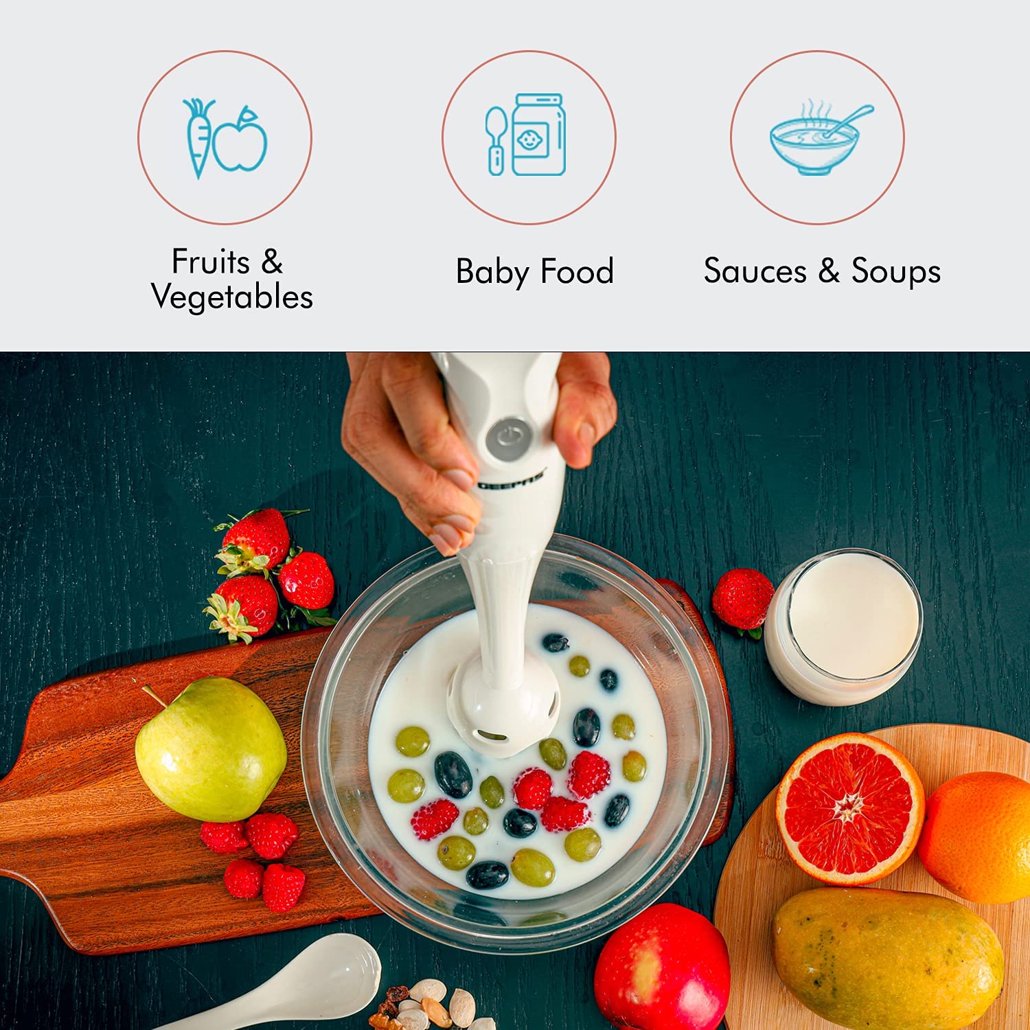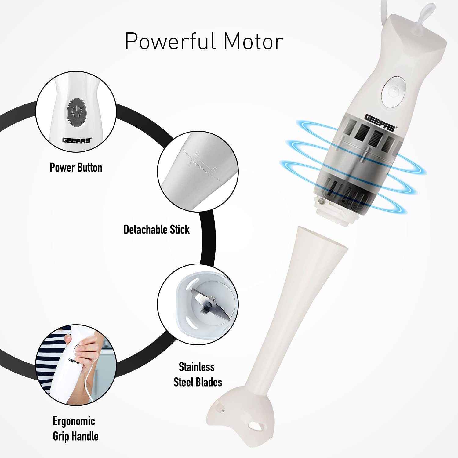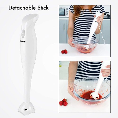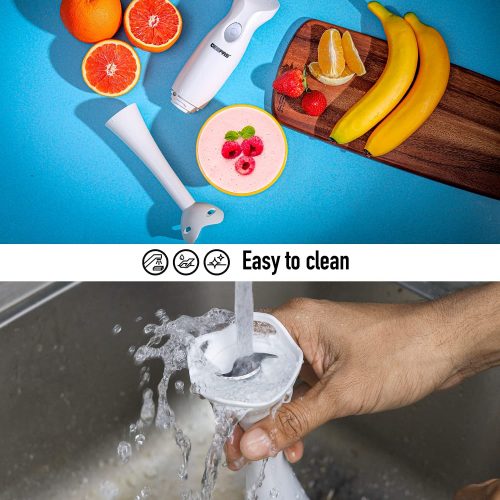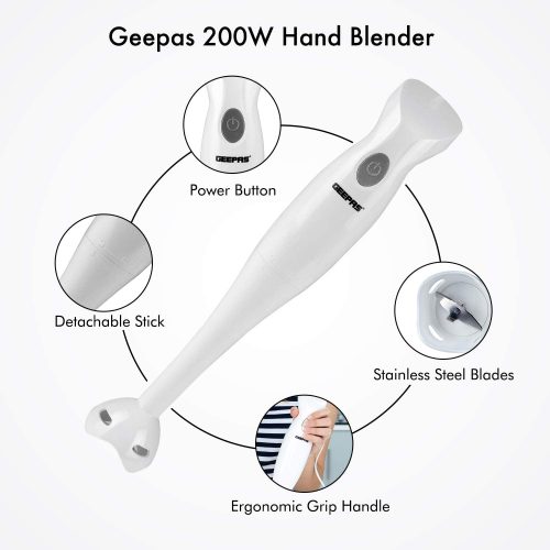 1. INJECTION SHELL AND BEAUTIFUL DESIGN – The hand blender blade is covered with a white injection shell. It prevents the contents from flying off while blending. The body is made of white plastic. It has a purple-colored button and an adornment circle in the middle. It gives your tool a lovely look. 2. BEAUTIFUL DESIGN – The body of the hand blender is made from plastic. It is white in color. The On/Off button is purple in color, and the middle also has an adornment circle. It has an elegant look and adds to the beauty of your kitchen. 3. TWO SPEED SETTINGS – The Geepas Hand Blender says goodbye to complicated displays and endless buttons and instead gives you two simple speed settings to choose from. With a slower speed perfect for making chunky dips like salsa and guacamole and a faster speed for making silky and creamy smoothies after a hard workout at the gym, there’s a speed for your every need. 4. DETACHABLE PLASTIC STICK – With detachable parts perfect for easy cleaning, you can now sit back, relax, and enjoy a feast of flavorsome food whilst the attachments soak in the sink. t clears all the hygiene issues and reduces the effort. And the best part is afterward the detachable parts can be neatly stored away into a spare cupboard or draw for a clutter-free kitchen. 5. COMFORTABLE GRIP – The handle is a significant part of this blender since you’ll be holding it the entire time while using it. Therefore, the grip has been kept very comfortable, and it fits your palm perfectly. It has an anti-slip design; therefore, you can relax while using it.