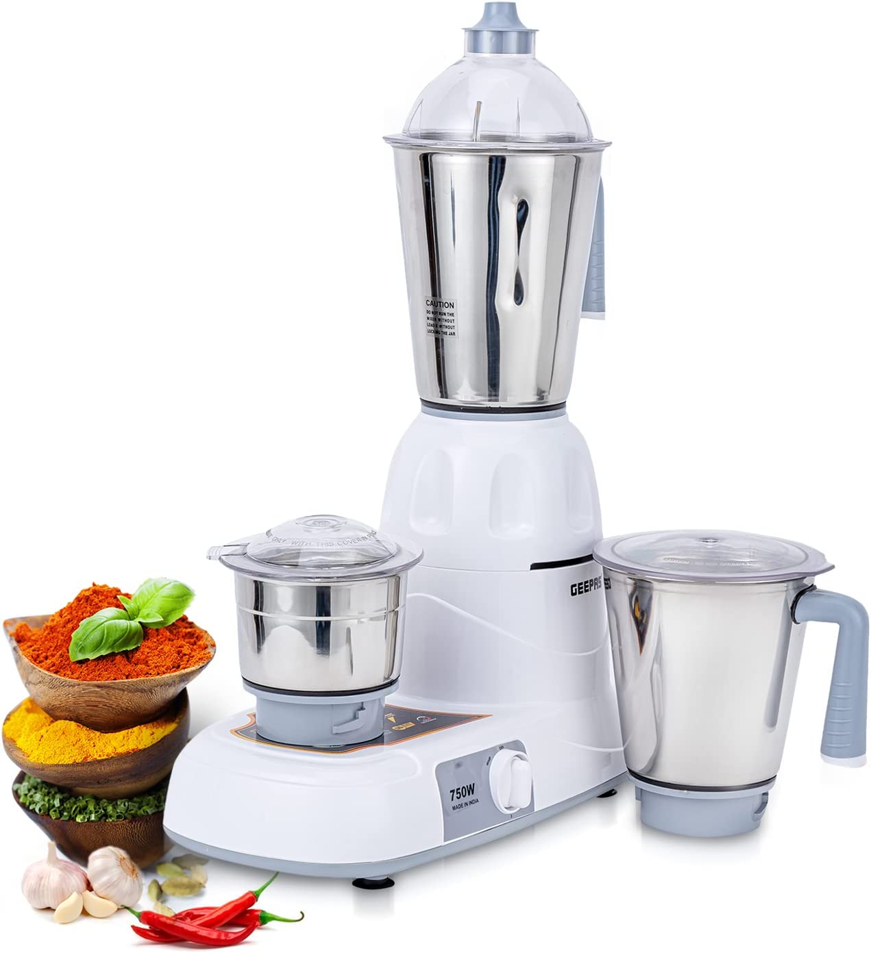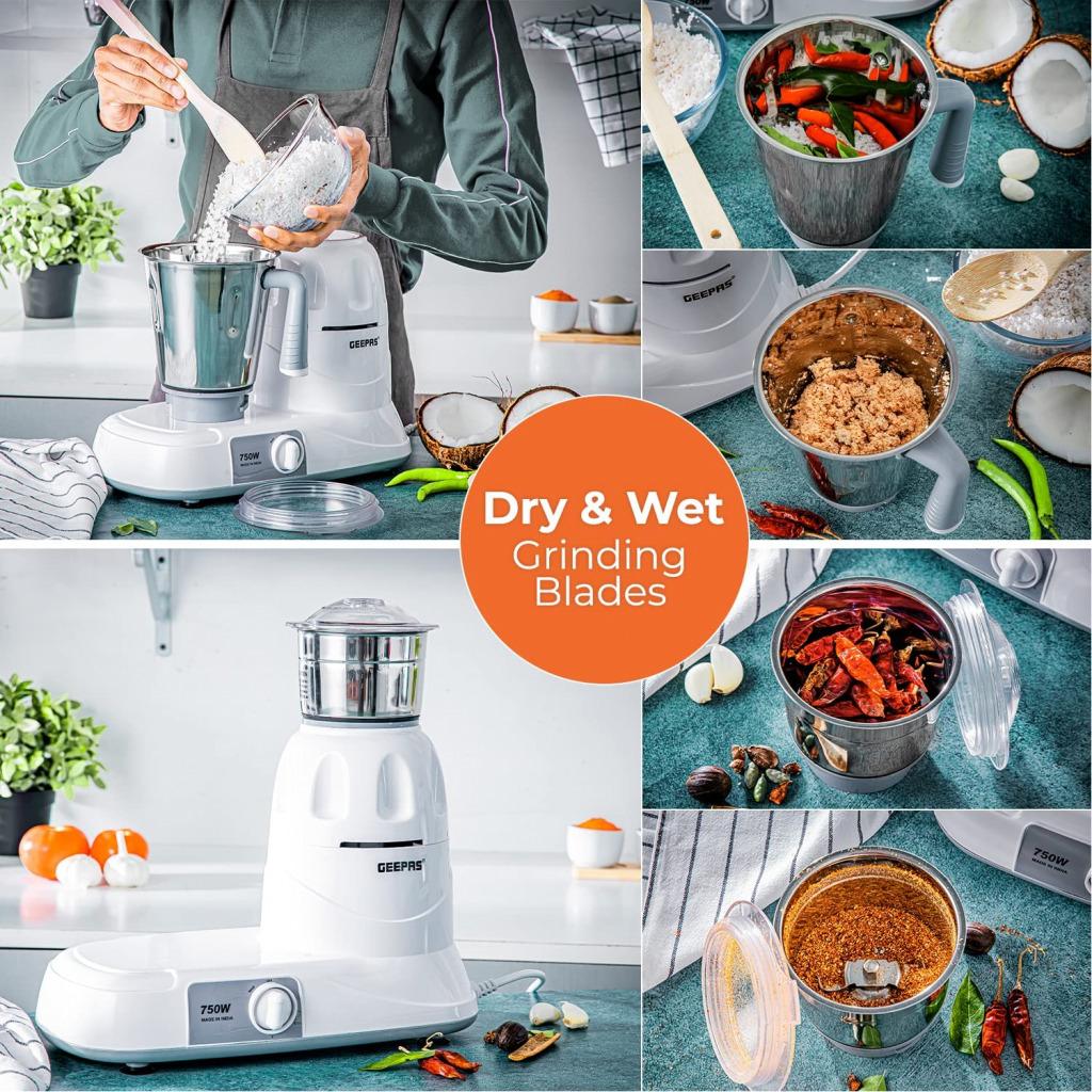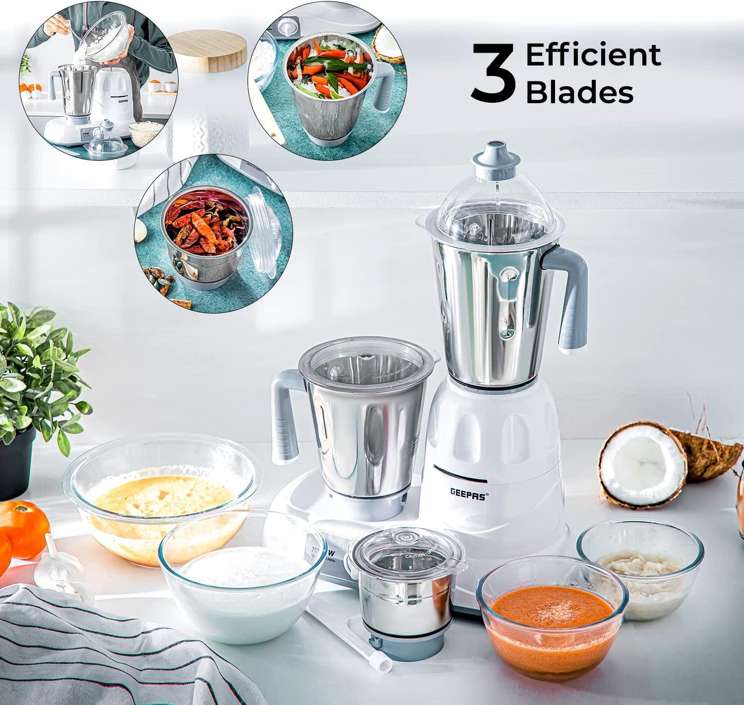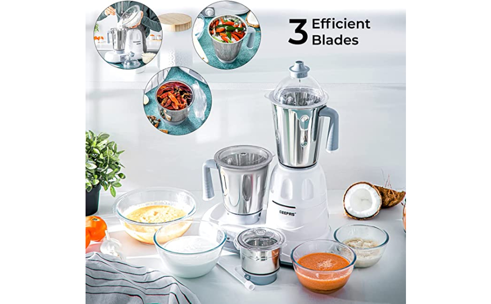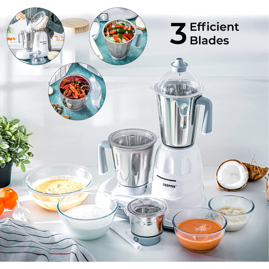 Geepas Mixer Grinder With 3 Jars, Multi Color – GSB5081, Plastic Material Making Grinding fast and simple with Geepas Mixer Grinder The grinder comes with 3 stainless steel jars with stainless steel blades for fast and fine grinding and blending, ideal for dry grinding, wet grinding and batter making. All jars come with unbreakable see through polycarbonate jar lids to prevent any leaks while operating. With its twist lock jar and motor unit with nylon couplings this grinder is really durable and sturdy. Use this appliance to prepare smooth gravies, chutneys, fine spice powders and a lot more. A stay cool base motor unit with vacuum rubber feet make it safe while operating and allow vibration free grinding. High Gloss Abs Body Made up of durable material yet light weight with glossy attractive look which is even easy to clean. It is well known for its sturdiness. 3 Speed Dial Switch the dial as you need the blending with the powerful motor gives you a fine grinding of the hard ingredients in just few minutes and saves time while your cooking. Note – Ensure all components are properly locked before switching on the machine.