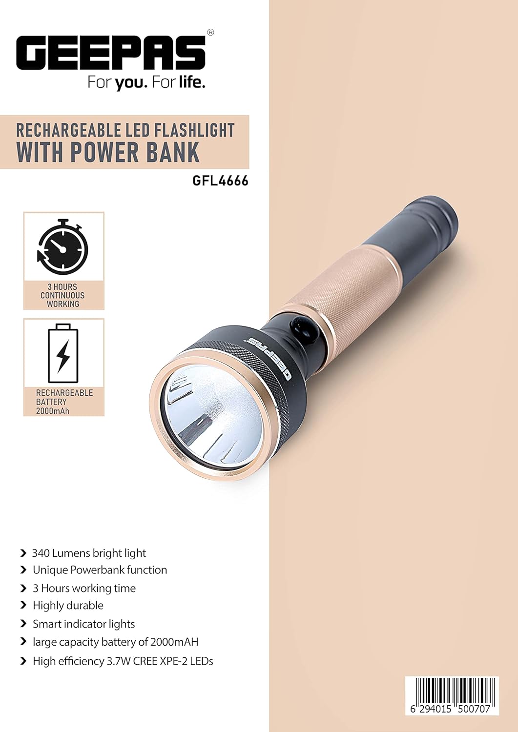 Key Features: 340 LUMENS BRIGHT LIGHT – Different from other torch lights, Geepas light is designed to enjoy a safe night riding, campaigning, power cut off, patrolling, and more with super bright lights, a nice companion at night. UNIQUE POWER BANK FUNCTION – Built-in rechargeable battery with USB port, serves as a convenient power bank portable charger output for fast charging your phone and other devices. The battery capacity of 2000 mAH has enough spare power to escort you when you are outdoors. 3 HOURS WORKING TIME – This torch has a huge battery of 2000mAh and it gets fully charged in 6 hours. It has 3 hours of continuous working time HIGHLY DURABLE – Made up of highly resistant aviation aluminum alloy, making them extra durable wherever you may be. Superior design and construction allow our lights to be super lightweight and compact. SMART INDICATOR LIGHTS -This torch has a charge indicator light to easily understand battery status. It will show red light while charging and turns to green when it’s fully charged.