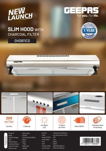 Geepas Slim Hood with Charcoal Filter- GHD611CS/ Sleek and Stylish Design, Powerful Suction, and Adjustable Speed Setting, Perfect for Kitchen, Apartment, etc., Stainless Steel Body, 1 Year Warranty SLEEK AND STYLISH DESIGN: The Geepas Hood has a slim design and stainless steel SS430 body that seamlessly blend into any kitchen décor. POWERFUL SUCTION: With a 200 m3/hour suction power, the hood efficiently removes smoke and odors and ensures a clean and healthy cooking environment. ADJUSTABLE SPEED SETTING: The hood has three speed settings, which allow you to customize the ventilation power. In addition, it also has a 2W LED light to provide better illumination while cooking. ADVANCED FILTRATION SYSTEM: The hood has 3-layer aluminum filtration that captures particles, and the charcoal filter further enhances filtration. HIGH PERFORMANCE MOTOR: With an 80-watt motor, the hood delivers exceptional performance and a noise level of ≤65 dB. A perfect blend of sleek design and performance. Geepas offers you a slim hood with a charcoal filter designed to elevate your kitchen experience. Made from the finest quality material with a stainless steel body and a 3-layer aluminum filter with a charcoal filter, the hood ensures effective removal of smoke and odors for a clean and fresh cooking environment. The hood has a slim design that perfectly blends with your kitchen dcor. The hood’s suction capability of 200 m3/hour efficiently eliminates smoke and aromas, ensuring a clean and healthy cooking environment. The hood’s three-speed control ensures optimal performance and proper ventilation. To adjust the speed, simply push the desired speed. The 1×2 watt light provides ample illumination while cooking for clear visibility and aesthetics. The hood contains 3-layer aluminum filtration that collects particles, and the charcoal filter improves filtering even more. The hood’s 80-watt motor provides great performance and a noise level of 65 dB. The slim hood measures only 595x495x100 mm and weighs 5.0 kg. Plus, it comes with a 1-year manufacturer’s warranty.
