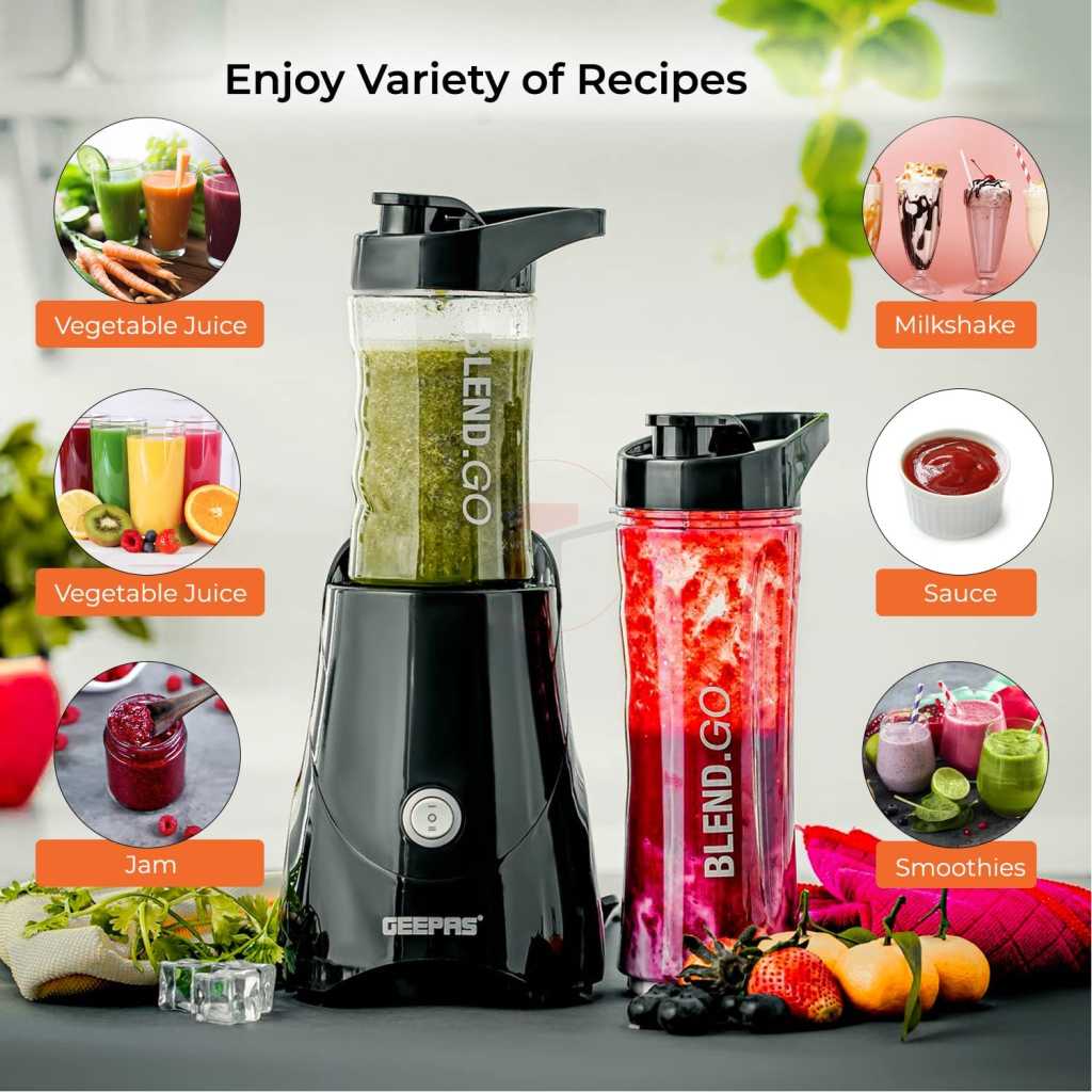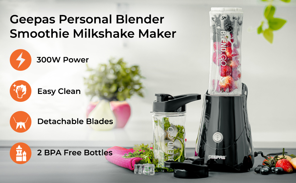 Key Features: Geepas Sports Smoothie Protein Milkshake Maker Blender, Stainless Steel Blades On/Off Control Personal Blender, 300 W, Black/Clear, GSB44075. POWERFUL & COMPACT BLENDER – 300W powerful copper motor, can blend a variety of fruit and vegetables, also can crush small ice cubes for a summer drink. Compact blender bottle makes blending smoothies much faster, and also saves space for your kitchen. ONE STEP TO A FRESH LIFE – It is easy and fast to get juicing. Just load your ingredients into the cup. Press or let go the bin to switch the juicer on or off. With the all sided design, the bottle can be placed perfectly without being examined and directed on the mixer. You can enjoy juice, milk shake, puree, fruit and vegetable drinks, complementary food and more immediately. 570 & 400 ML TRITAN BLENDER BOTTLES – Tritan is often used to make baby bottles, it’s BPA free, safety, no odour, non-discolouring. Provide you with healthy and delicious smoothie. 2pcs large capacity bottles, feature a lid with handle to double it as portable smoothie cup. you can make it easy to take on the go portability to the gym, office or class, in the car or in your bag. Enjoy tasty & healthy homemade beverages everywhere. EASY USE & SAFETY LOCK – One button operation, get a smoothie in seconds. Double safety lock, help you to confirm whether the cap is screwed correctly and whether the blender bottle is correctly installed on the base before start work. FAST AND EFFICIENT – 4 Stainless extra sharp extraction blades. Crush ice with 300 watts of power. Perfect for shakes, smoothies, food prep, frozen blending and more. Enjoy the healthy juice and smoothies with your loved ones.