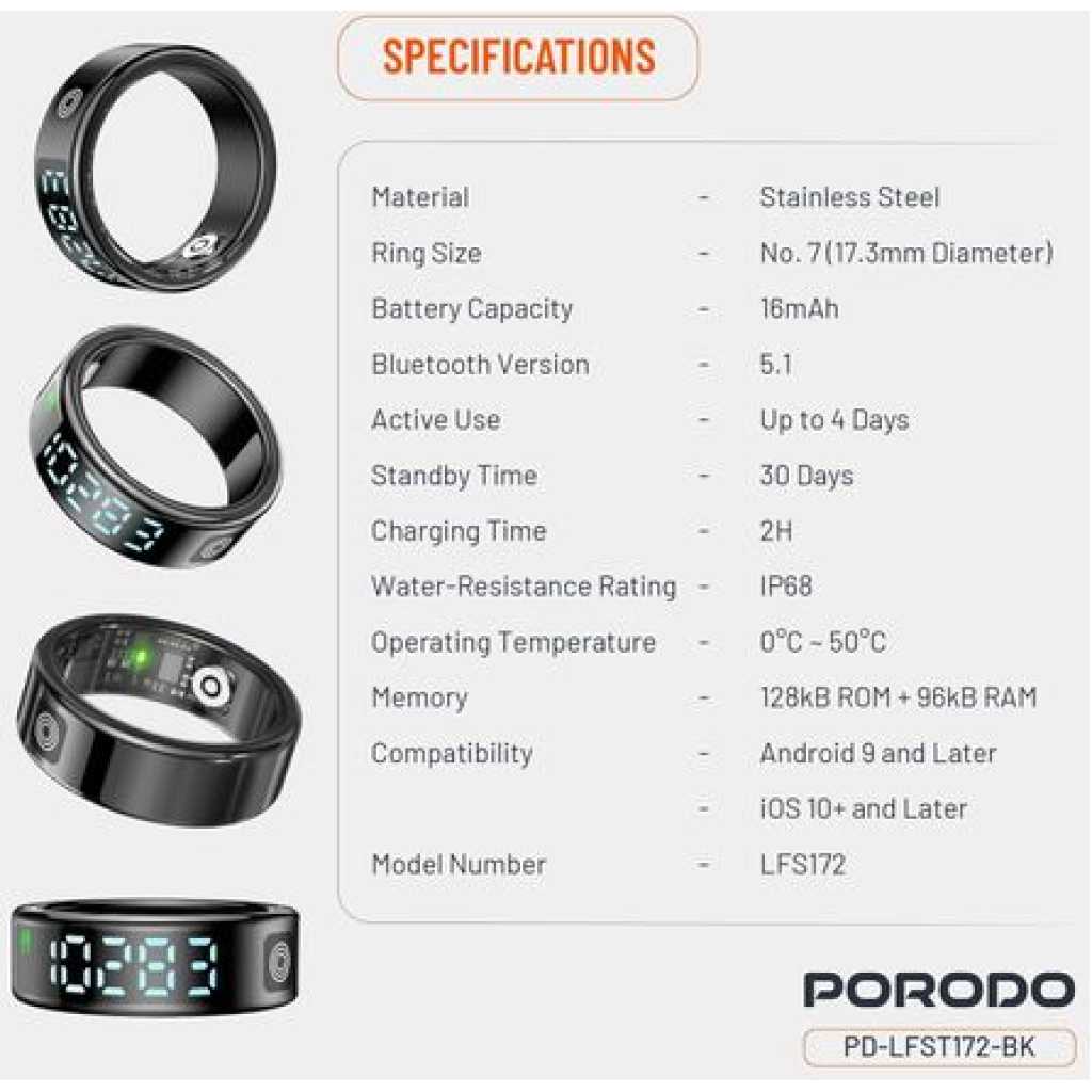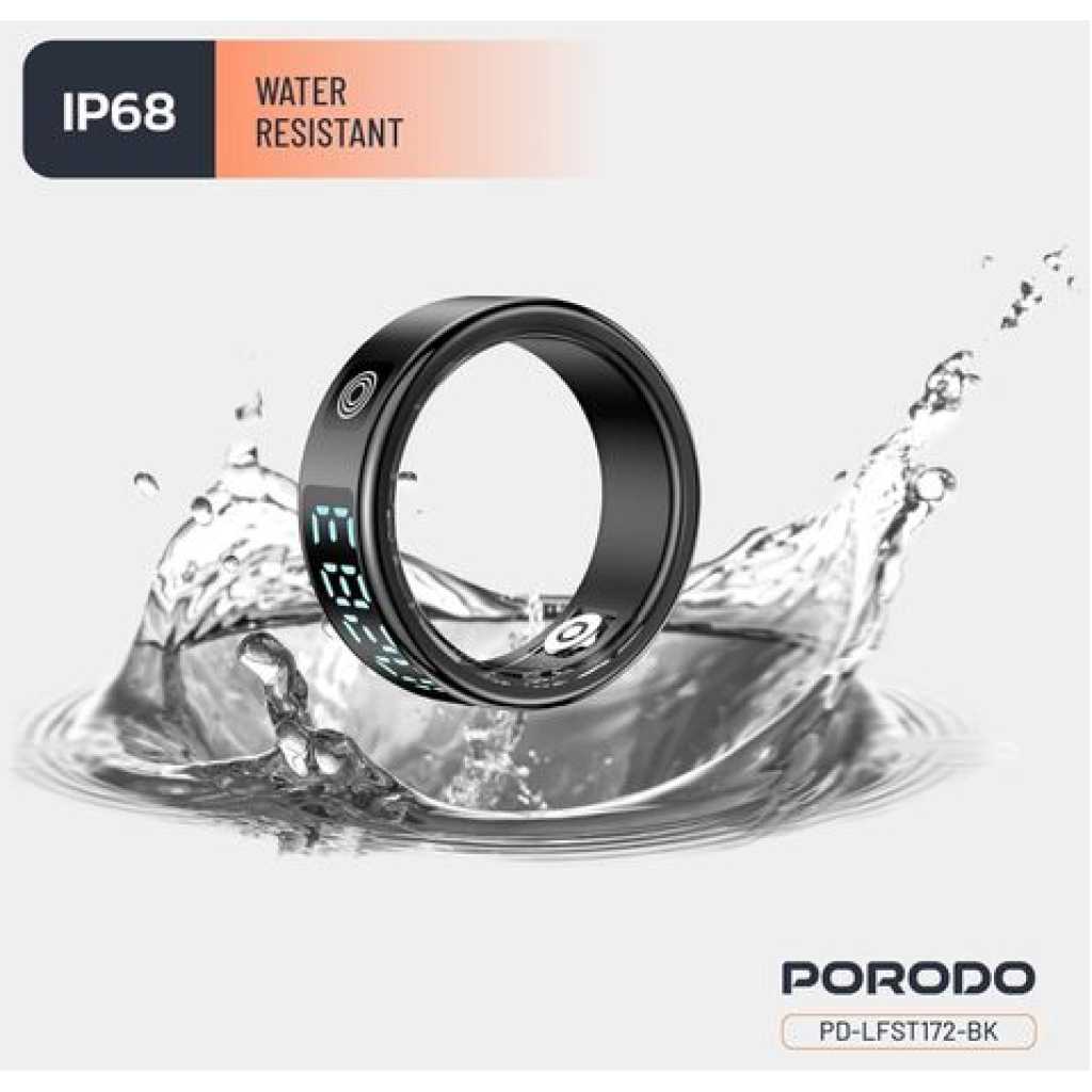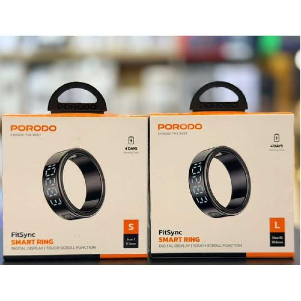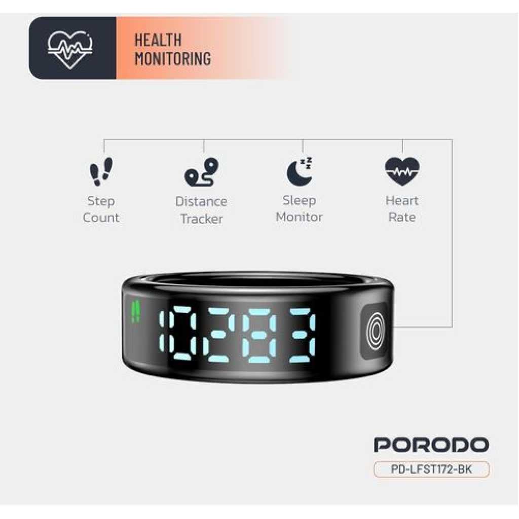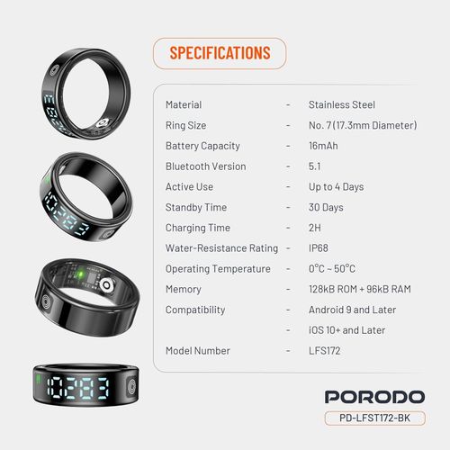 Genera Porodo FitSync Smart Ring, Digital Display And Touch Scroll Function with Health Monitoring, 128 Sport Modes, IP68 Water Resistance, Stainless Steel, Magnetic Charging, Compatible with Android