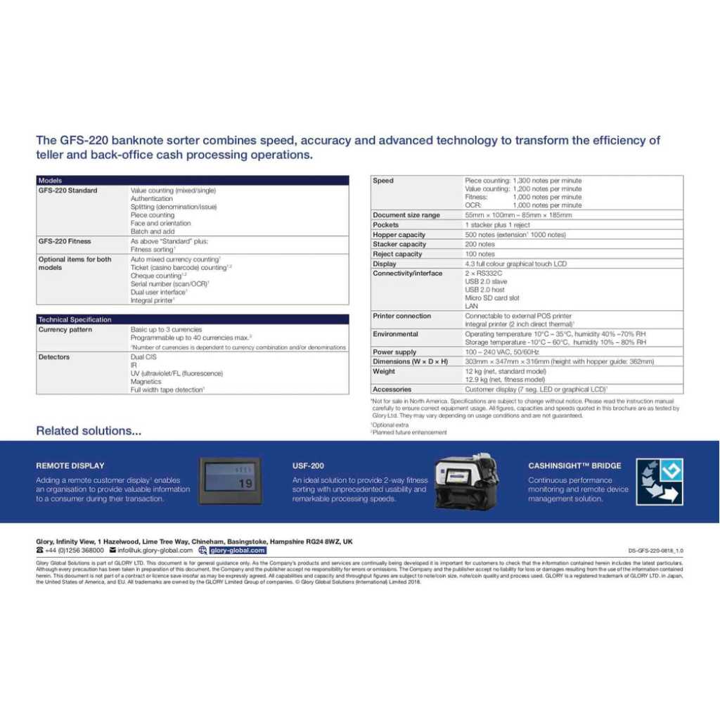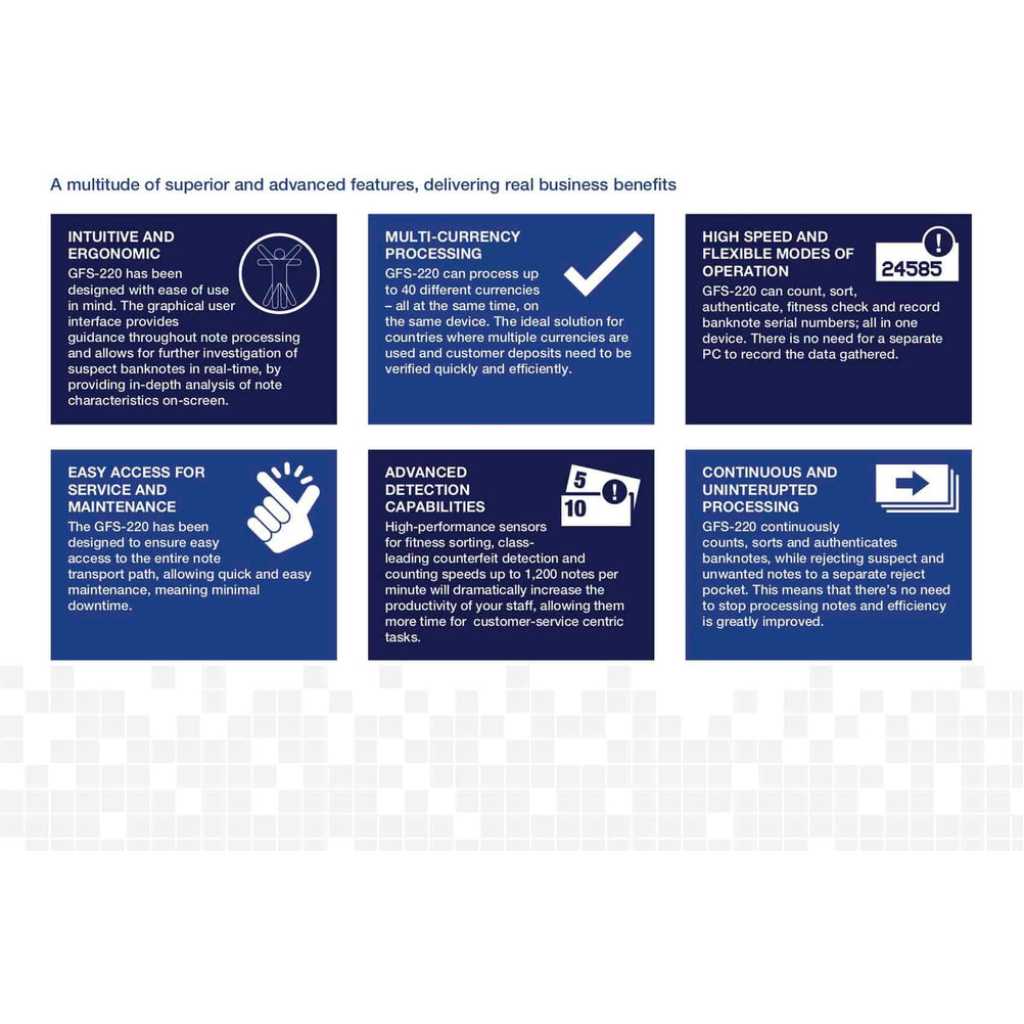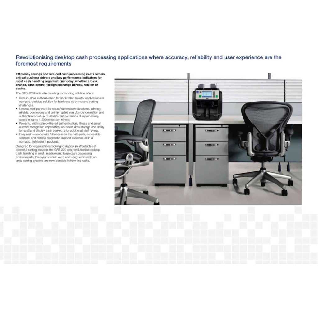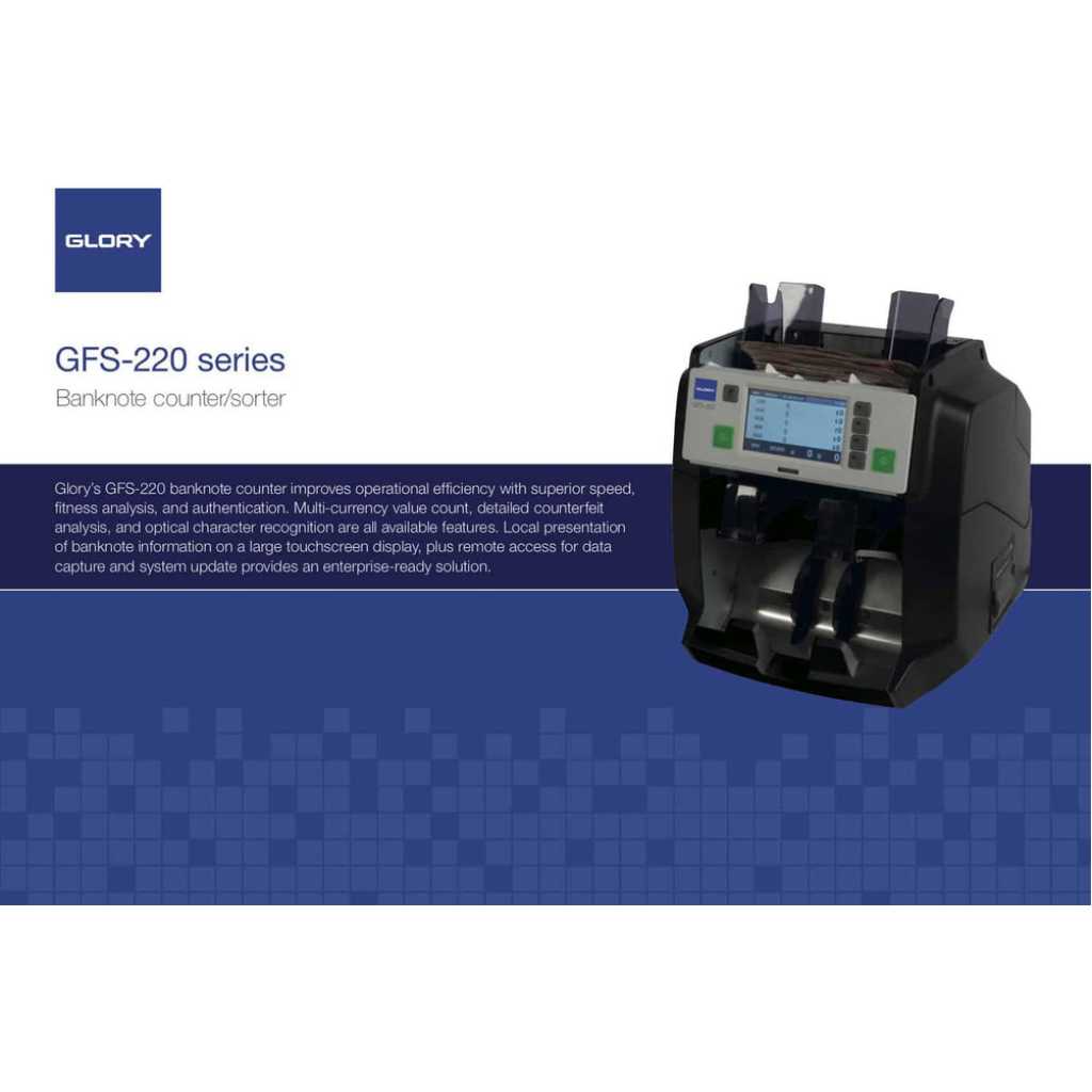 Glory GFS-220 Series – Banknote Counter And Sorter, Bank Bill Counter – Black. The Glory GFS220 is a dual pocket note counting machine and banknote sorter. The second pocket can be used to sort the notes or reject poor quality, damaged, and forged notes. The Glory GFS220 is designed to be a robust note counting machine for high volume environments. SUPER EFFICIENT Efficiency savings and reduced cash processing costs remain critical business drivers and key performance indicators for most cash handling organisations today, whether a bank branch, cash centre, foreign exchange bureau, retailer or casino. Glory’s GFS-220 banknote counter improves operational efficiency with superior speed, fitness analysis, and authentication. Multi-currency value count, detailed counterfeit analysis, and optical character recognition are all available features. Local presentation of banknote information on a large touchscreen display, plus remote access for data capture and system update provides an enterprise-ready solution. Designed for organisations looking to deploy an affordable yet powerful sorting solution, the GFS-220 can revolutionise desktop cash handling in small, medium, and large cash processing environments. Processes that were once only achievable on large sorting systems are now possible in front line tasks. ADVANCED FUNCTIONALITY The GFS-220 counts, sorts, does counterfeit checks and records serial numbers at high speed – a versatile machine at a single price. The enhanced GFS-220 also provides banknote fitness checking to help you comply with compliance requirements. Counterfeit checks include infrared (IR), Ultraviolet (UV), Magnetic (MG), Thickness Detection, and Dual CIS (Contact Image Sensor). The OCR image capture technology allows the GFS-220 to read and record the banknote serial numbers, which allows you to generate a comprehensive and historical report of processed banknotes in both text and image format to improve the security and accountability of each transaction. Data is extracted into CSV / Microsoft Excel format, which can be saved onto a USB memory stick. The multi-pocket design allows counts to proceed continuously, with rejected notes placed into the reject pocket while the machine continues counting. Avansa’s note countings solutions are trusted across Southern Africa, including South Africa, Namibia, Botswana, Zimbabwe, Mozambique, Eswatini, Lesotho, Angola, Zambia, and Malawi. Businesses in these regions face unique security challenges, and our robust anti-bandit and bulletproof doors provide reliable protection against threats, ensuring safety for both employees and assets. FEATURES Manual or Auto Start Customer set batch count facility Add feature allowing for consecutive cumulative counts Counts 1,200 notes per min Counts all Polymer banknotes Size detection Dual pocket Dual operator mode Easy access design for clearing jams Auto currency selection SPECIFICATIONS Hopper: 500 notes (extension 1000 notes) Stacker: 200 notes Reject: 100 notes DIMENSIONS: 303mm × 347mm × 316mm (height with hopper guide: 362mm) Piece counting: 1,300 notes per minute Value counting: 1,200 notes per minute Fitness: 1,000 notes per minute OCR: 1,000 notes per minute