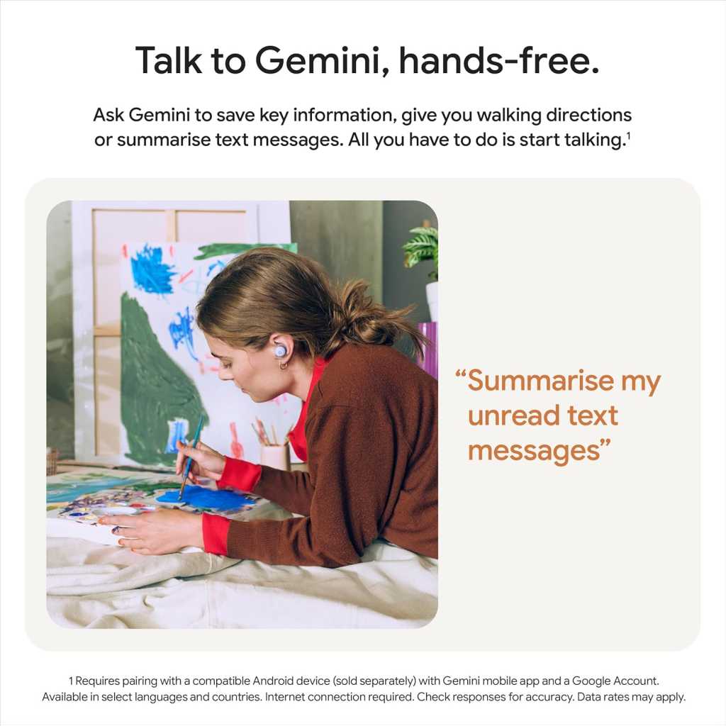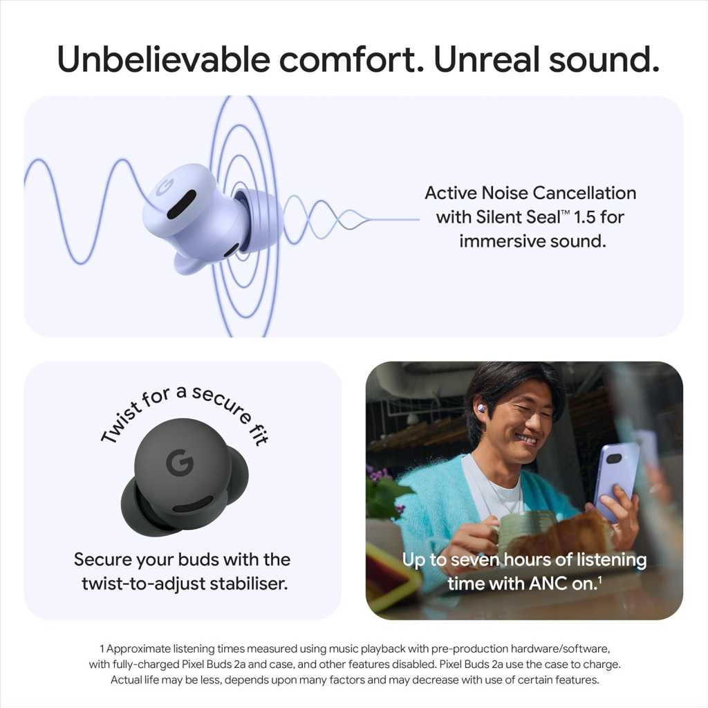 Key Features: Hear only what you want to hear. Active Noise Cancellation with Silent Seal 1.5 helps block external noise. Or, switch to Transparency mode to hear the world around you. Every sound, crystal clear. Immerse yourself in clear, crisp audio with the 11 mm dynamic speaker driver. And customise sound levels with the 5-band equaliser. Twist for a secure fit. Secure your Pixel Buds 2a during workouts or commutes with the twist-to-adjust stabiliser. Or twist the other direction for relaxed comfort. Ultra light. Ultra comfortable. Inspired by the industry-leading design of Pixel Buds Pro 2, Pixel Buds 2a are built for lightweight comfort and impeccable fit. Hear and be heard with Clear Calling. It helps block background noise – so wind, external chatter or other distractions in your environment won’t interrupt your conversations. A battery that lasts. Up to seven hours of listening time with Active Noise Cancellation on, or 20 hours with the charging case. Get one hour of listening time with a 5-minute charge. Talk to Gemini, hands-free. Gemini can find info from recent emails, give you walking directions or brainstorm in real time. All you have to do is start talking. Protection from sweat droplets to sudden drizzles. With IP54 sweat and water resistance, Pixel Buds 2a are built to last, so you can stay in your groove without moisture dampening the moment. Control settings with Gemini using your voice. Ask Gemini to adjust your settings without having to pull out your phone – turn on Active Noise Cancellation, pump up the bass and more. Google Tensor A1 powers every beat. With the Tensor A1 chip in Pixel Buds 2a, music is crisper, richer and more detailed, and calls are clearer than ever before.
