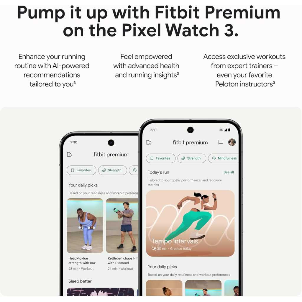 The Google Pixel Watch 3 is designed for performance, with advanced fitness from Fitbit[1,2]; the 41mm screen is twice as bright and 10% larger than before, making it easier to see your stats and info[1] Maximize your performance with advanced running features; build custom run workouts and get real-time guidance and advanced form tracking[3] Enhance your run routine with Fitbit Premium; Google AI uses your goals, past runs, and readiness to power personalized run recommendations[3] Know what your body is ready for each day with readiness; it uses sleep, resting heart rate, and heart rate variability to show if you’re ready to take on a workout or prioritize recovery[3] Cardio load measures how hard your heart works so you can see how hard you’ve pushed; compare trends to see if you’re under- or over-training[3]; and receive a daily target based on cardio load and readiness levels