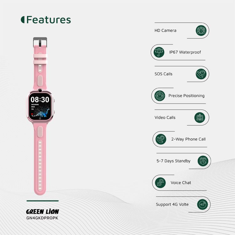 The Green Lion Kids 1.85″ Smart Watch is a full-featured device meant to keep children connected and safe. It guarantees that parents are always aware of their child’s location thanks to its GPS tracking and exact positioning features. For peace of mind, the smartwatch offers plenty of communication options, including voice chat , video calls , and SOS calling . Kids can use its HD camera to record entertaining moments or make visual connections during video conversations. The watch is dependable for daily use. Its 920mAh battery gives 3-4 days of work time and 5-7 days of standby . With a 240×280 resolution , its 1.85-inch IPS display provides a bright and clean user interface. The 1GB RAM and 8GB ROM provide fast performance and plenty of storage for apps and media. The smartwatch is for active kids. It’s IP67 waterproof . It can resist splashes and light water exposure. 4G VoLTE is also supported for dependable and quick connectivity. With a 2-hour charge time , the Green Lion Kids 1.85″ Smart Watch is prepared to keep up with kids’ everyday activities while maintaining constant communication and safety.