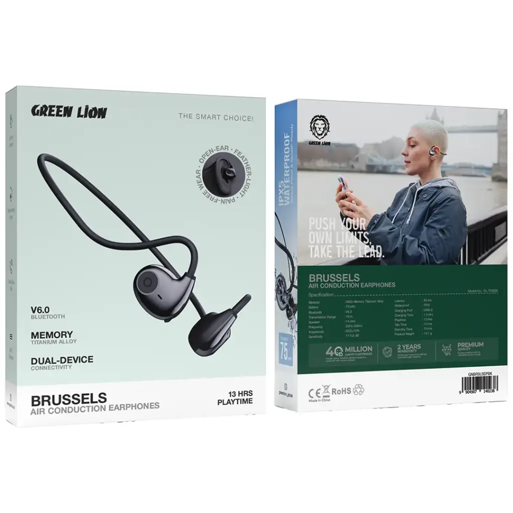 The Green Lion Brussels Air Conduction Earphones in Black offer exceptional sound quality and comfort for all-day listening. The earphones use memory titanium alloy materials, which enable them to create a shape-memory design that provides users with a comfortable ear fit that prevents pain. Bluetooth V6.0 provides stable and reliable connectivity, which enables users to move freely while listening to music or taking phone calls from a distance of 10 meters. The 14mm speaker delivers clear audio for phone calls, while IPX5 waterproofing protects the device from both sweat and light rainfall, which makes it suitable for outdoor activities. The earphones deliver extended usage through their 13 hours of playback time and 10 hours of talk time, which operate on a 75mAh battery. The USB-C charging port enables users to achieve fast charging within 1.5 hours, while the dual-device connectivity feature allows users to connect two devices at the same time. The Green Lion Brussels Air Conduction Earphones provide users with both high-quality sound and a comfortable listening experience.