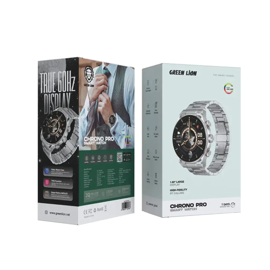 The Green Lion Chrono Pro Smart Watch is another premium wearable engineered for style and functionality. Equipped with a dynamic 1.6″ AMOLED display with a crisp resolution of 480 × 480 pixels, along with 1000-nit brightness, make sure viewability is never compromised, even in the sun. The 360mAh battery charges in less than 3 hours via magnetic pin charging, boasting 5-7 days of working time and as much as 25 days on standby. It shall be equipped with BLE 5.3 + BT 3.0 advanced connectivity and a BT call function, and it shall be able to make calls and notify social notifications in this fancy zinc alloy casing. Perfect for fitness enthusiasts: featuring over 100 sports modes, real-time heart rate, daily activities, and IP68 water-resistant. Additional highlights of the smartwatch include a rotary encoder button, voice recording, and a full-view touch display that makes this smartwatch quite an everyday thing. Specification Display: 1.6″ AMOLED Resolution: 480 × 480 Bluetooth: BLE 5.3 + BT 3.0 Battery Capacity: 360mAh Watch Case: Zinc Alloy Brightness: 1000 nit G-Sensor: SC7A20TR Charging Time: <3 Hours RAM + ROM: 960KB + 64Mb pRAM + 1Gb Charging Method: Magnetic Pin Charging Working Time: 5-7 Days Standby Time: 25 Days Water Resistance Level: IP68 Features Full View Touch Display BT Call Call/Social Notifications Voice Recording Heart Rate 100+ Sports Modes Rotary Encoder Button Activity Tracking Download App For Android Download App for iOS