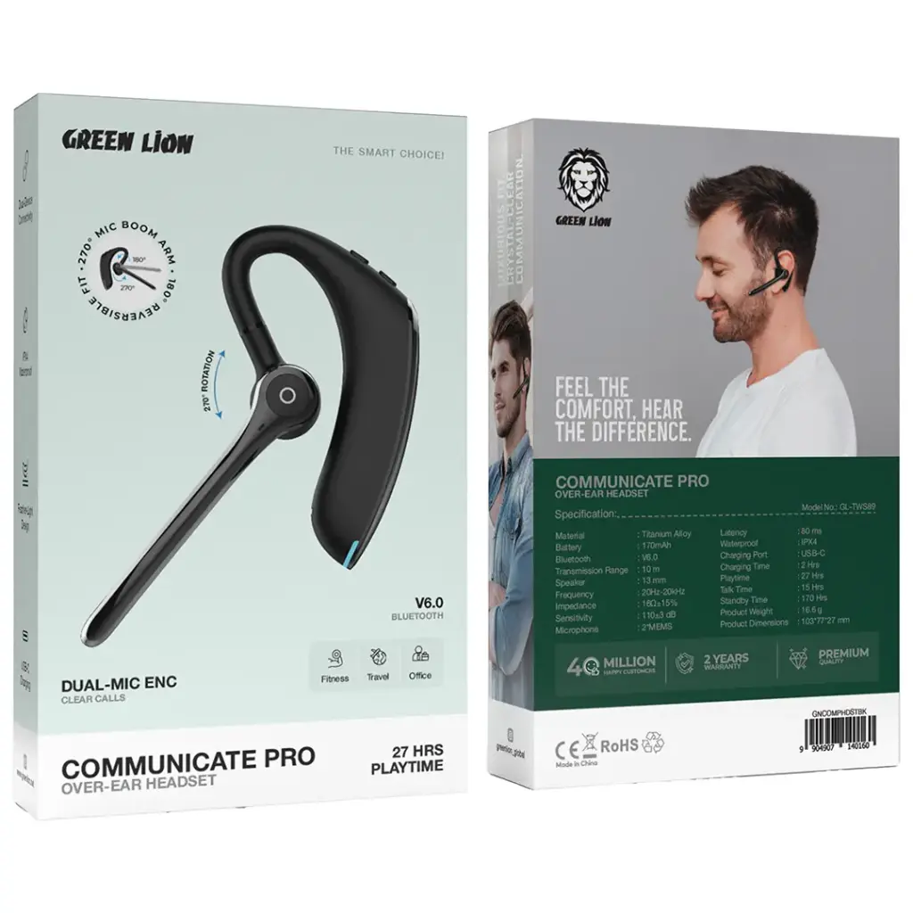 The Green Lion Communicator Pro Over-Ear Headset in Black delivers exceptional comfort and performance for all your communication requirements. The headset uses Titanium Alloy materials, which create a lightweight design that maintains exceptional durability throughout its use. The headset connects through Bluetooth V6.0, which provides a reliable wireless connection that enables users to move within a 10-meter range from their devices. The device supports dual-device connectivity, which enables users to switch between their connected devices without any interruptions. The dual-mic ENC (Environmental Noise Cancellation) system provides clear audio output while the user can adjust the microphone through the 270° mic boom arm. This headset enables users to participate in outdoor activities because it has IPX4 waterproofing protection. The 170mAh battery provides 27 hours of audio playback, 15 hours of talking time, and 170 hours of standby time, which ensures that you have power throughout your entire day. The device allows for fast and easy charging through its USB-C port, which charges the device in two hours to ensure constant communication readiness.