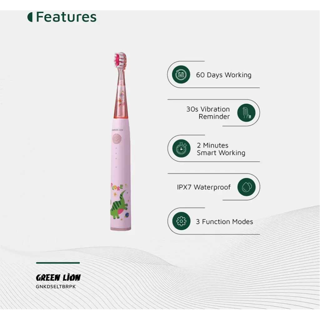 The Green Lion Kids Electric Toothbrush is specially designed for children aged 2 to 10 years, combining fun features with effective oral care. It offers 3 function modes and 2 intensity modes, allowing for a customizable brushing experience that adapts to the unique needs of young users. The brush features shining lights, making brushing more engaging and encouraging children to develop good oral hygiene habits. With a 2-minute smart timing function and a 30-second vibration reminder, this toothbrush ensures that children brush for the recommended amount of time and cover all areas of their mouths. The toothbrush provides 24,000 strokes per minute, delivering powerful yet gentle cleaning to help remove plaque and maintain healthy gums. Made with ABS material and nylon food-grade bristles, the Green Lion Kids Electric Toothbrush is safe and durable for everyday use. It comes with 2 brush heads, offering an extra replacement for continued hygiene. The 500mAh Li-ion battery offers up to 60 days of usage on a single charge, with a quick 3-hour charging time via a USB-DC port for easy recharging. The toothbrush is also IPX7 waterproof, allowing for use in the shower and easy cleaning. Weighing only 150g and measuring 22x22x110mm, the Green Lion Kids Electric Toothbrush is lightweight and perfectly sized for small hands, ensuring a comfortable and enjoyable brushing experience for kids.