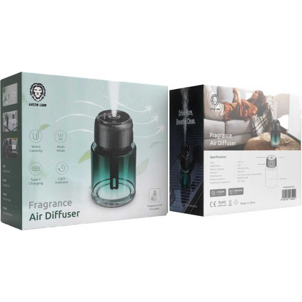 Have a more fresh and sweet smelling atmosphere with Green Lion Fragrance Air Diffuser. Featuring a 300mAh battery and a 4-5 hour working time, this elegant diffuser fills your home with delightful scents for an inviting and refreshing air. It’s constructed with high quality glass and PC materials, and offers a 160ml capacity and multiple modes to suit your preferences. You have Type-C charging port for fast and convenient charging, and the light indicator displays to notice the device’s status. Included with the Green Lion Fragrance Air Diffuser is a premium fragrance oil, allowing you to enjoy a pleasant scent right out of the box. Create an inviting and aromatic environment in any room with this stylish and functional fragrance diffuser. Specification Battery Capacity: 300mAh Material: Glass + PC Working Time: 4 To 5 Hours EAN: 6935100185200 | 6935100188997 Features 160ml Capacity Multi Mode Type-C Charging Light Indicator Fragrance Oil Included
