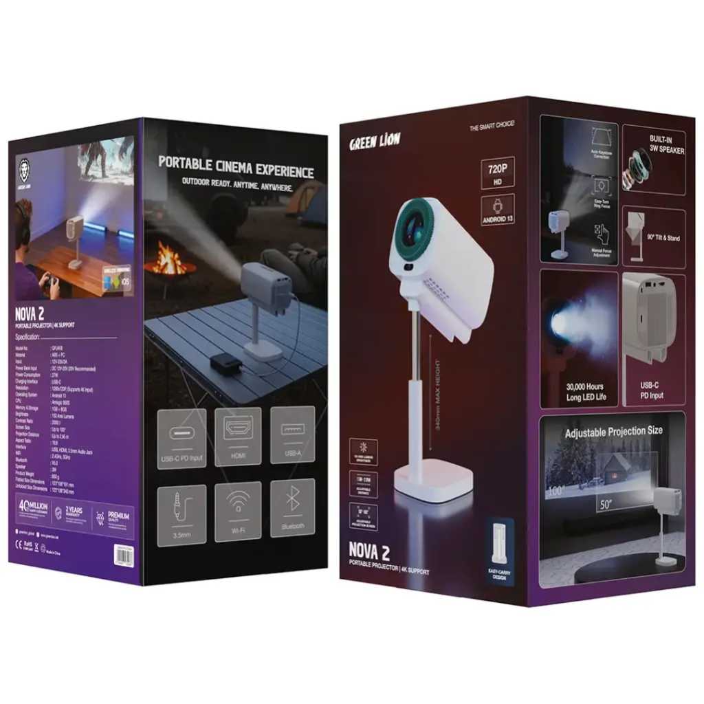 GREEN LION Green Lion Nova 2 Portable Projector, 720P HD, LED, Wi-Fi, Bluetooth, HDMI, USB-C PD Input, 30,000 Hours LED Life, Adjustable Focus, 90° Tilt and Stand