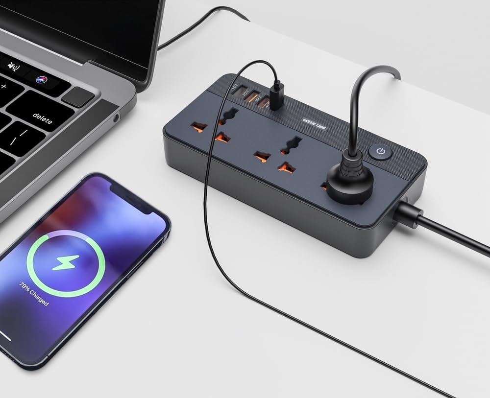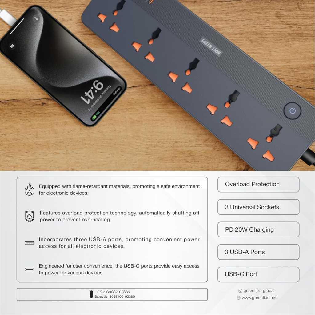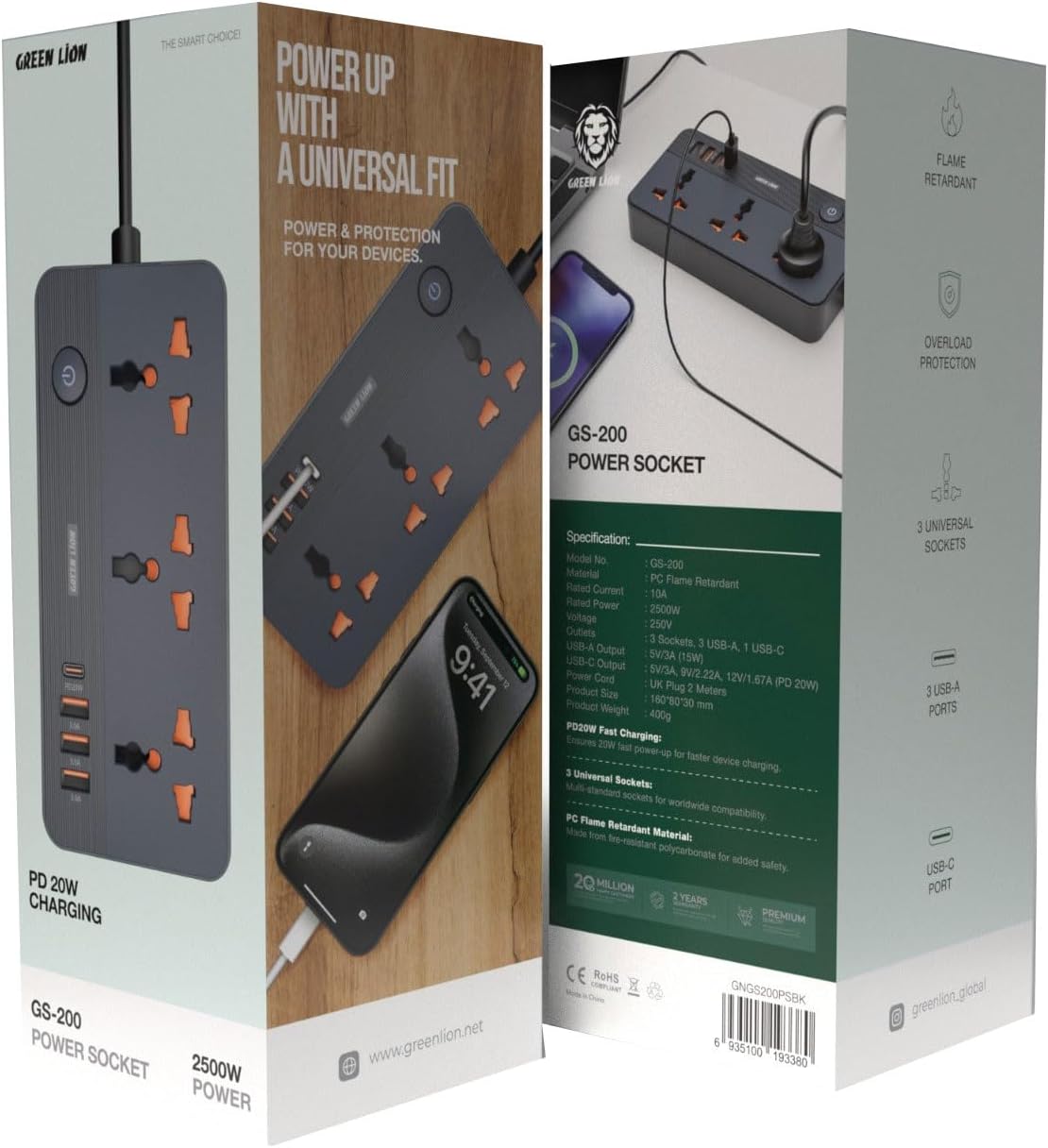 The Green Lion GS-200 Power Socket is a high-performance power solution designed to accommodate all your charging requirements. This power socket features three outlets, along with three USB A ports and one USB C port, allowing you to charge multiple devices simultaneously with ease. Equipped with a 2-meter power cord and a UK plug, the GS-200 offers flexibility in positioning, making it suitable for various setups in your home or office. It has a rated power of 2500W, ensuring it can handle a variety of devices without issue. Safety is a priority with the GS-200, featuring overload protection to prevent damage from excessive power draw. The rated current is 10A, and it operates at a voltage of 250V, making it compatible with standard electrical appliances. Additionally, the flame retardant design enhances safety by reducing the risk of fire hazards. The USB C port supports Power Delivery (PD) at 20W, enabling fast and efficient charging for compatible devices. Overall, the Green Lion GS-200 Power Socket combines convenience, safety, and efficiency, making it an essential addition to any charging setup.