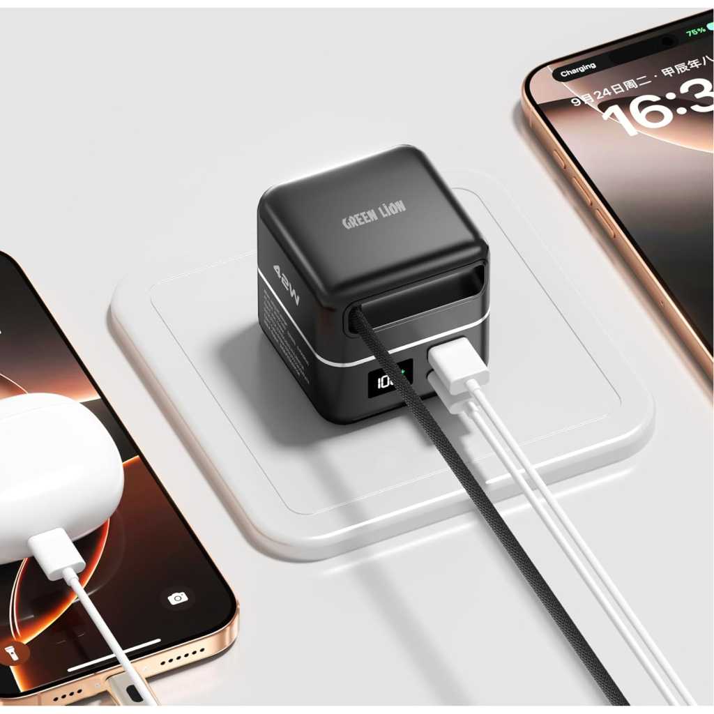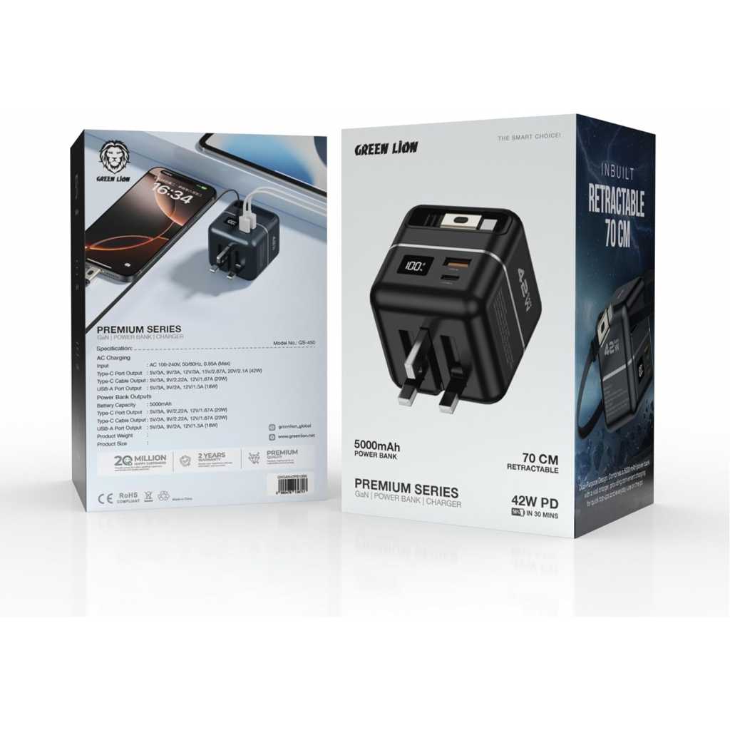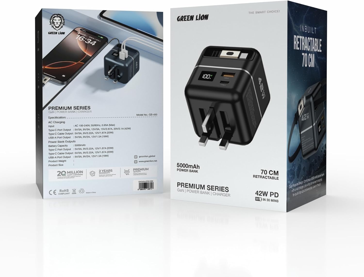 The Green Lion Multi-Functional Premium Series Charger and Power Bank offers a seamless charging experience with a 5000mAh battery capacity and versatile charging option. Equipped with GaN technology, this device features PD 42W fast charging, making it perfect for powering your devices on the go. It includes a 1M retractable Type-C cable, a Type-C port, and a USB-A port, ensuring that you can charge multiple devices simultaneously. The charger also supports a wide range of output options for both AC and power bank modes, delivering up to 45W from the Type-C cable output, 22.5W from the USB-A port, and 20W from the Type-C port. Additionally, the Green Lion Multi-Functional Charger and Power Bank is designed for convenience with a built-in digital display that allows you to monitor the charging status at a glance. The AC input supports a broad voltage range (100-240V), while the power bank features fast charging capabilities with 22.5W from USB-A and 20W from Type-C output, ensuring your devices are powered up quickly. Whether you’re at home or on the move, this compact and powerful charging solution ensures reliable performance, making it a must-have for any tech enthusiast.
