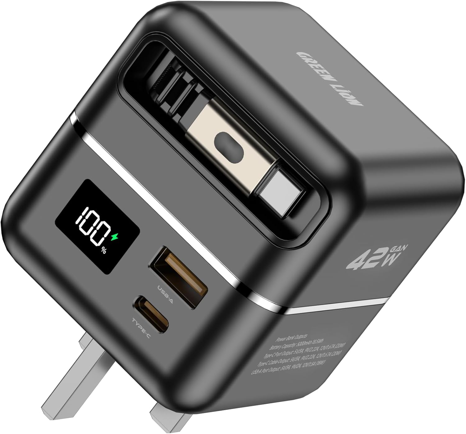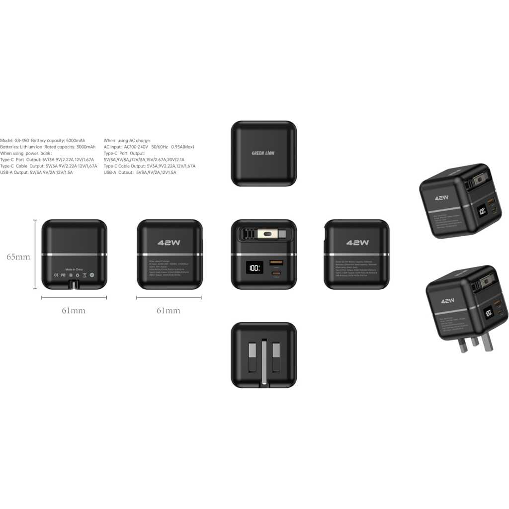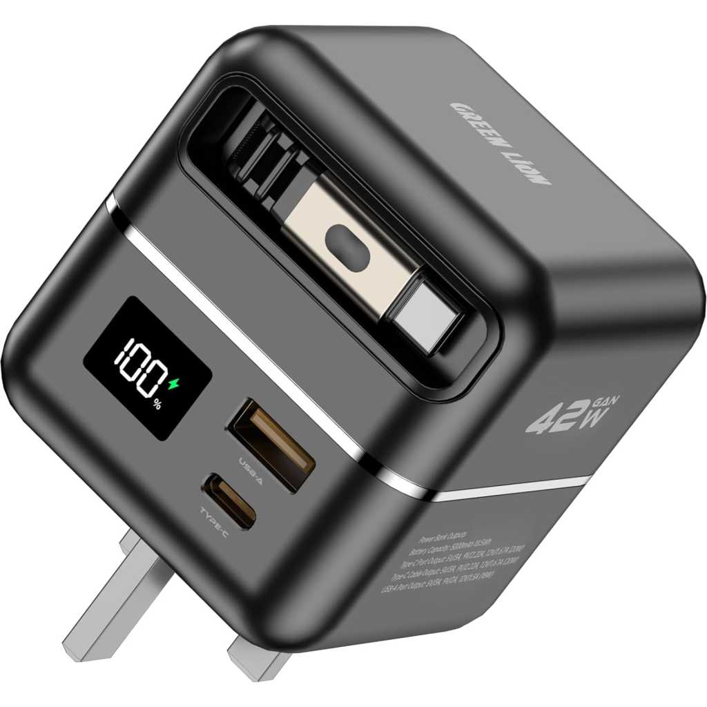 The Green Lion Multi-Functional Premium Series Charger and Power Bank offers a seamless charging experience with a 5000mAh battery capacity and versatile charging option. Equipped with GaN technology, this device features PD 42W fast charging, making it perfect for powering your devices on the go. It includes a 1M retractable Type-C cable, a Type-C port, and a USB-A port, ensuring that you can charge multiple devices simultaneously. The charger also supports a wide range of output options for both AC and power bank modes, delivering up to 45W from the Type-C cable output, 22.5W from the USB-A port, and 20W from the Type-C port. Additionally, the Green Lion Multi-Functional Charger and Power Bank is designed for convenience with a built-in digital display that allows you to monitor the charging status at a glance. The AC input supports a broad voltage range (100-240V), while the power bank features fast charging capabilities with 22.5W from USB-A and 20W from Type-C output, ensuring your devices are powered up quickly. Whether you’re at home or on the move, this compact and powerful charging solution ensures reliable performance, making it a must-have for any tech enthusiast.