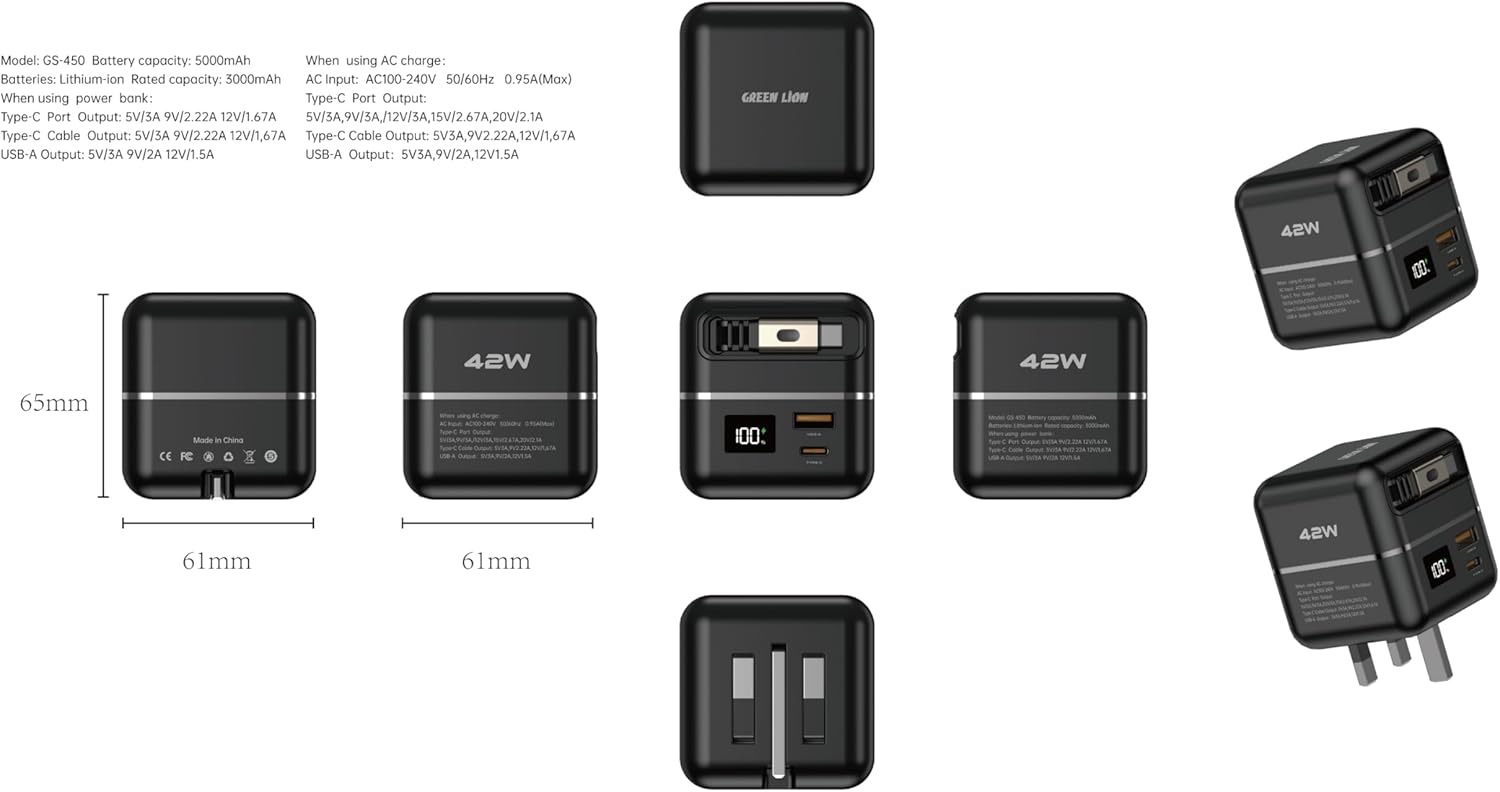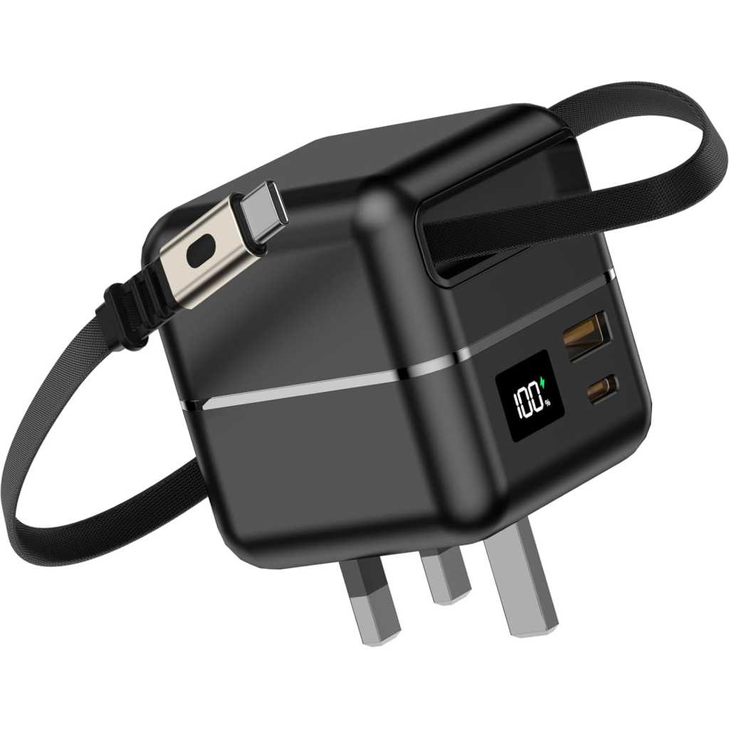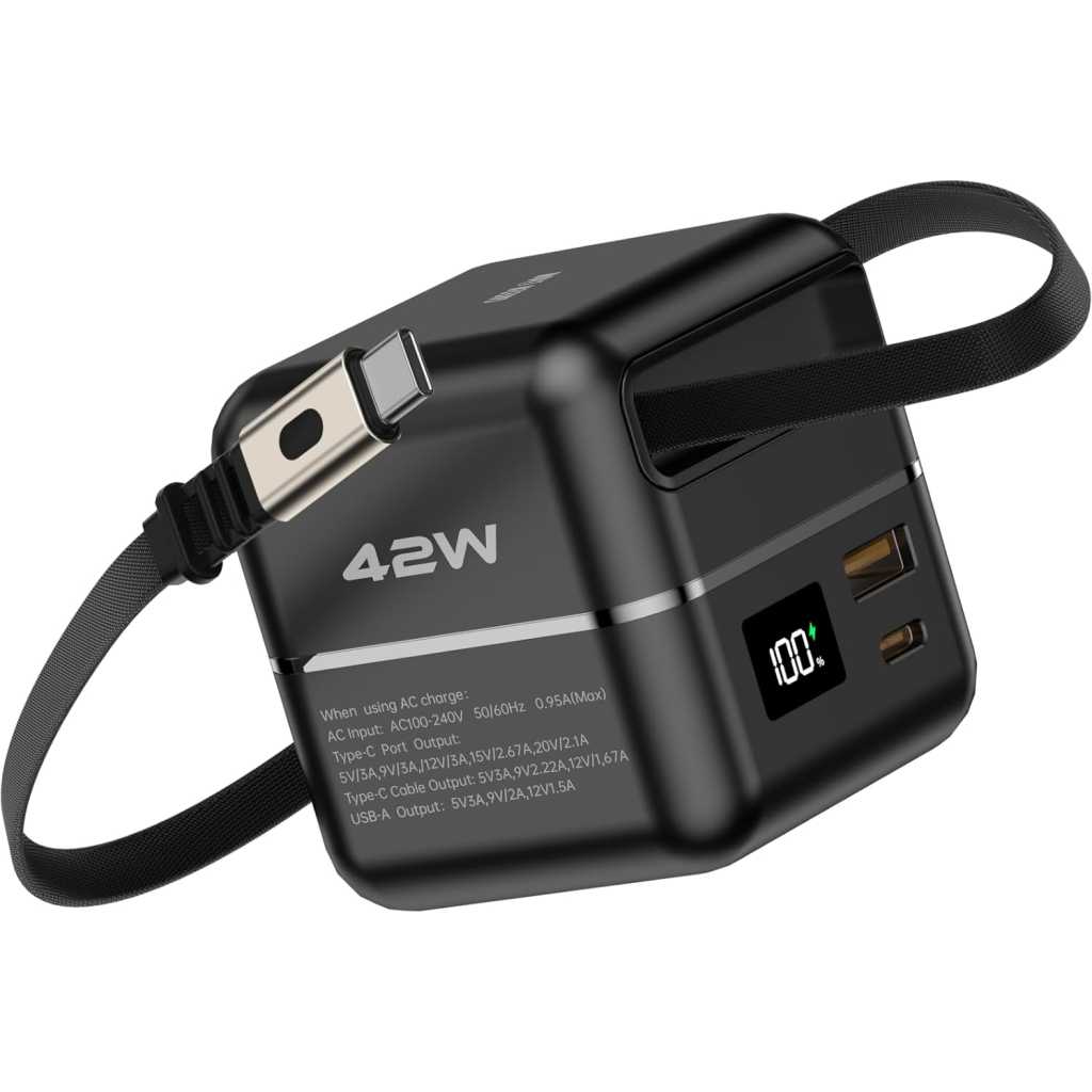 Key Features: 1M Retractable Cable / Digital Display / Type-C Cable Type-C Port / USB-A Port / PD 45W : Type-C Cable Output: 5V/3A, 9V/3A, 12V/3A, 15V/3A, 20V/2.25A (45W) USB-A Port Output: 5V/3A, 9V/2A, 10V/2.25A, 12V/1.5A (22.5W) Type-C Port Output: 5V/3A, 9V/2.22A, 12V/1.67A (20W) Input: AC 100-240V, 50/60Hz, 0.95A (Max) : USB-A Port Output: 5V/3A, 9V/2A, 10V/2.25A, 12V/1.5A (22.5W) Type-C Port Output: 5V/3A, 9V/2.22A, 12V/1.67A (20W) Type-C Port Input: 5V/3A, 9V/2A, 12V/1.5A (18W) Battery Capacity: 5000mAh