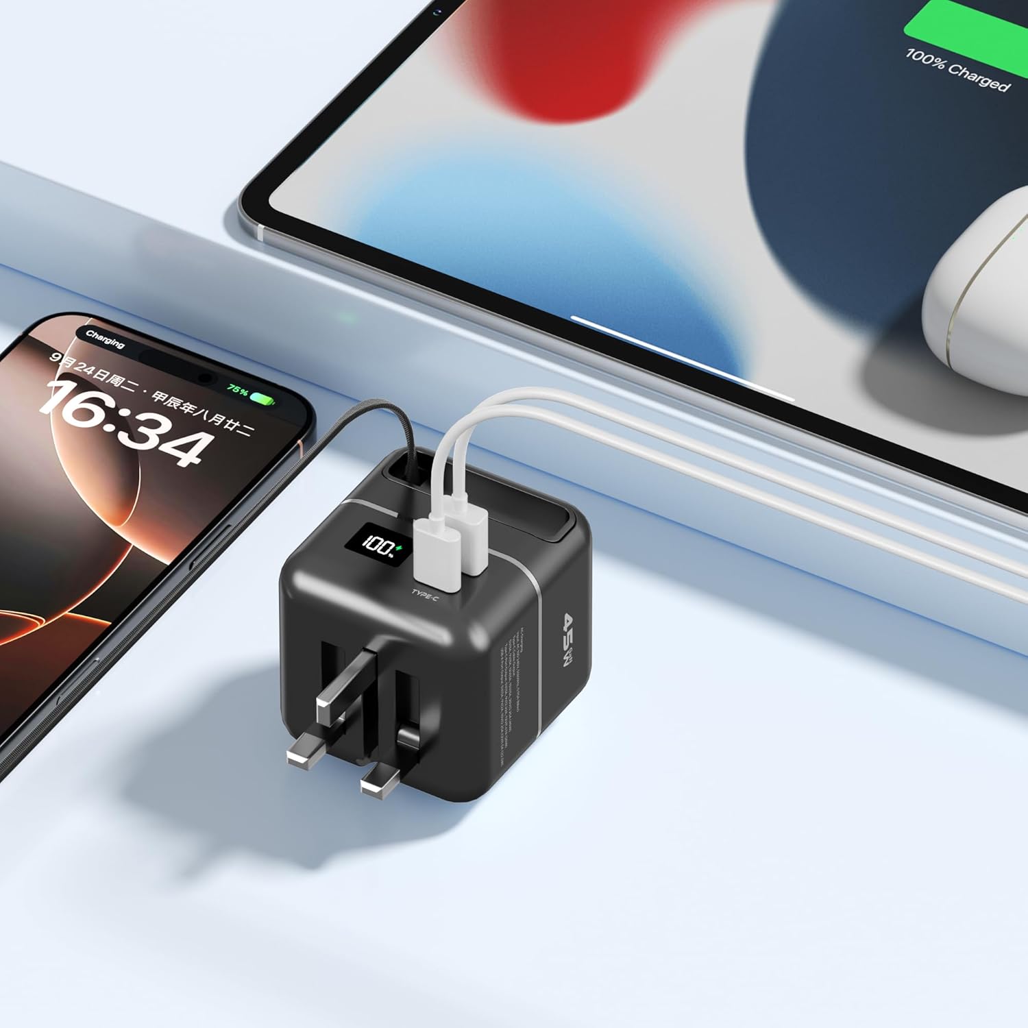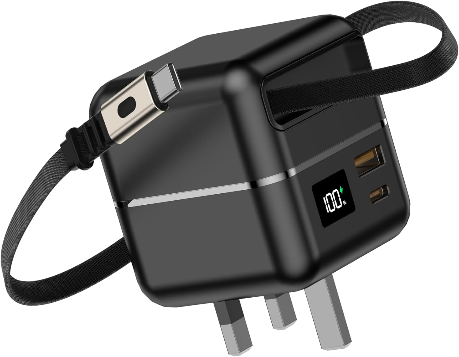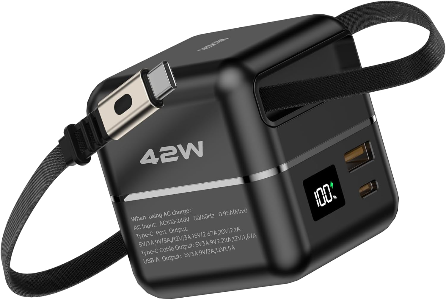 Key Features: 1M Retractable Cable / Digital Display / Type-C Cable Type-C Port / USB-A Port / PD 45W : Type-C Cable Output: 5V/3A, 9V/3A, 12V/3A, 15V/3A, 20V/2.25A (45W) USB-A Port Output: 5V/3A, 9V/2A, 10V/2.25A, 12V/1.5A (22.5W) Type-C Port Output: 5V/3A, 9V/2.22A, 12V/1.67A (20W) Input: AC 100-240V, 50/60Hz, 0.95A (Max) : USB-A Port Output: 5V/3A, 9V/2A, 10V/2.25A, 12V/1.5A (22.5W) Type-C Port Output: 5V/3A, 9V/2.22A, 12V/1.67A (20W) Type-C Port Input: 5V/3A, 9V/2A, 12V/1.5A (18W) Battery Capacity: 5000mAh