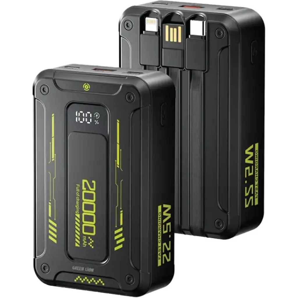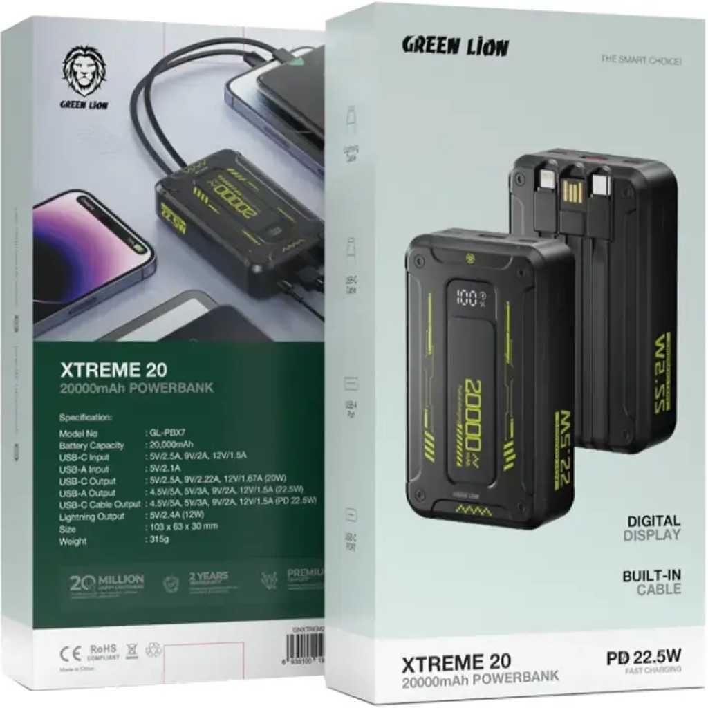 The Green Lion Xtreme 20 Power Bank is an ultra-efficient, ultra-fast, and ultra-modern portable battery charger with 20,000mAh of sheer capacity. Its capable PD 22.5W output ensures that many devices charge quickly. It has USB-C and USB-A inputs, while its many outputs include USB-C, USB-A, and a built-in Lightning cable. The LEDs display real-time battery levels. This power bank, designed with portability and it has the feature of an ultra-slim casing with built-in cables. It is the complete answer to mobile phones, tablets, and other gadgets requiring a reliable and super-fast charging solution for traveling or daily use. Specification Battery Capacity: 20,000mAh USB-C Input: 5V/2.5A, 9V/2A, 12V/1.5A USB-A Input: 5V/2.1A USB-C Output: 5V/2.5A, 9V/2.22A, 12V/1.67A (20W) USB-A Output: 4.5V/5A, 5V/3A, 9V/2A, 12V/1.5A (22.5W) USB-C Cable Output: 4.5V/5A, 5V/3A, 9V/2A, 12V/1.5A (PD 22.5W) Lightning Output: 5V/2.4A (12W) Features Lightning Cable USB-C Cable USB-A Port USB-C Port Digital Display Built-In Cable