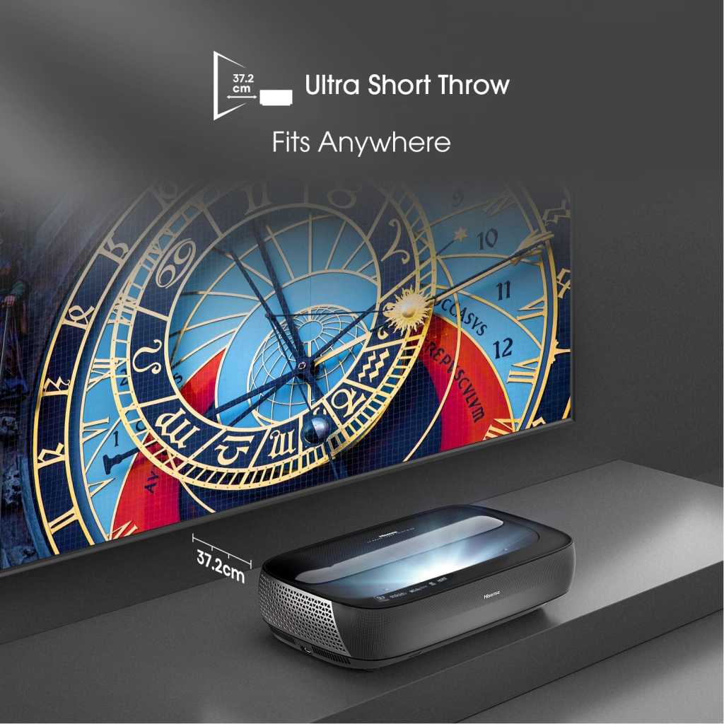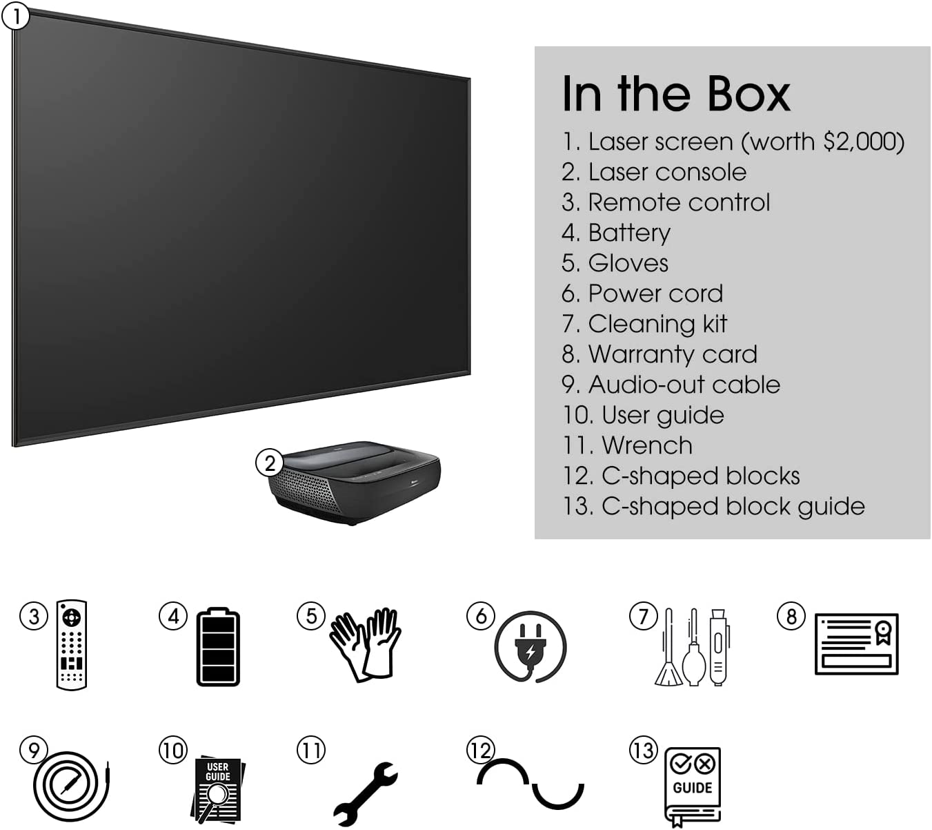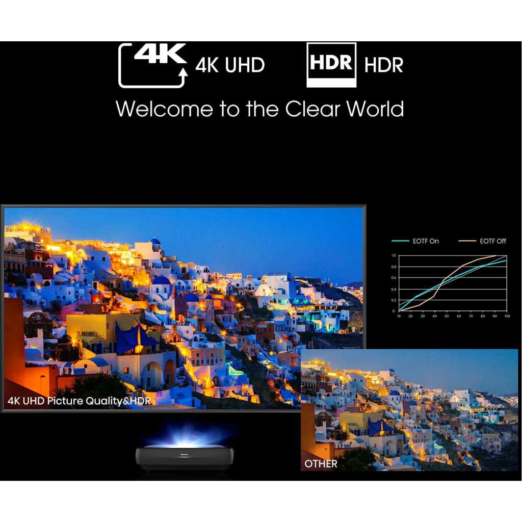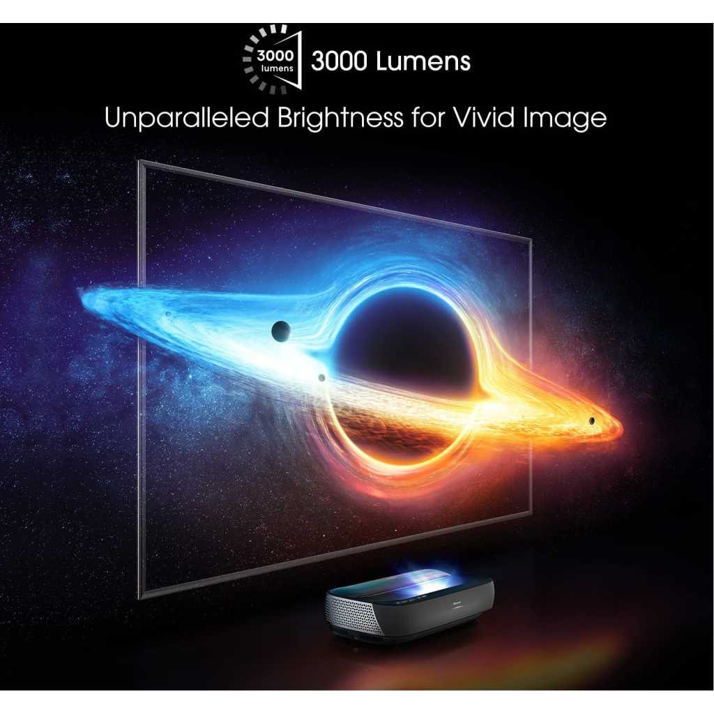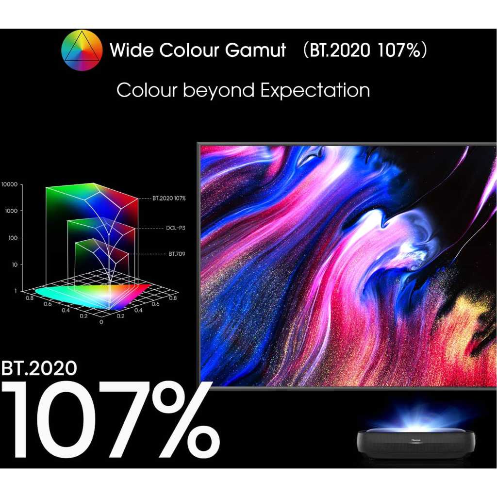 Hisense 100-Inch 4K UHD Laser TV 100L9GE, Triple-Laser UST Ultra Short Throw Projector with 100″ ALR Screen, 3000 Lumens, Android TV, HDR10, 40W Dolby Atmos, Built-in Alexa, and Google Assistant. Here at Hisense, we believe that everything we do should make your life simpler, better and more entertaining. That’s why, it is our aim to make the latest technologies accessible to everyone through thoughtfully designed and expertly built products. For 5 decades Hisense have been committed to developing innovations in consumer electronics. Today, we are world’s leading electronic manufacturers. Hisense has built 54 overseas companies and offices, and we also utilise 5 high-end international production facilities in Europe, Central America and South Africa, as well as boasting 18 research and development centres worldwide. Hisense is selling products in 160+ countries. All of which have the sole aim of delivering high quality, cutting-edge and affordable products that improve the life of our consumers 3 Pure Color Lasers: TriChroma really is R, G, Beautiful. The L9G uses pure red, green, and blue lasers to achieve new levels of color performance, reaching 107% of the BT.2020 color space – that’s more color than you’ve ever seen on a TV. Big Screen Experience: Get that child-like grin of excitement as you re-experience all your favorites at a scale that makes everything feel brand new. The massive 120-inch Ambient Light Rejecting (ALR) screen produces incredible picture clarity. A Bright Picture in Any Room: 3000 Lumens. That’s right, the L9G shines with brilliance so all your 4K HDR content hits those shimmering highlights, vibrant colors, and voluminous blacks that make everything pop off the screen. Powerful Sound: With built-in 40W Dolby Atmos sound, L9G is a big soundstage upgrade over those tinny speakers in your last TV. Get clear speech, titillating highs, and booming lows without having to invest in any extra gear. Buttery Smooth Motion: MEMC technology gives the L9G microsecond-level processor response and a motion rate 10 times faster than OLED so you never miss a moment of the action. Fast-moving images are buttery smooth and crystal clear.
