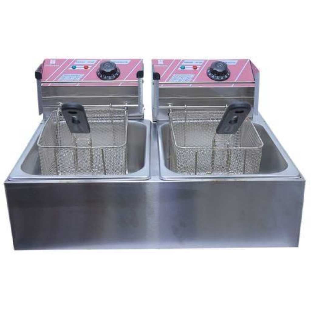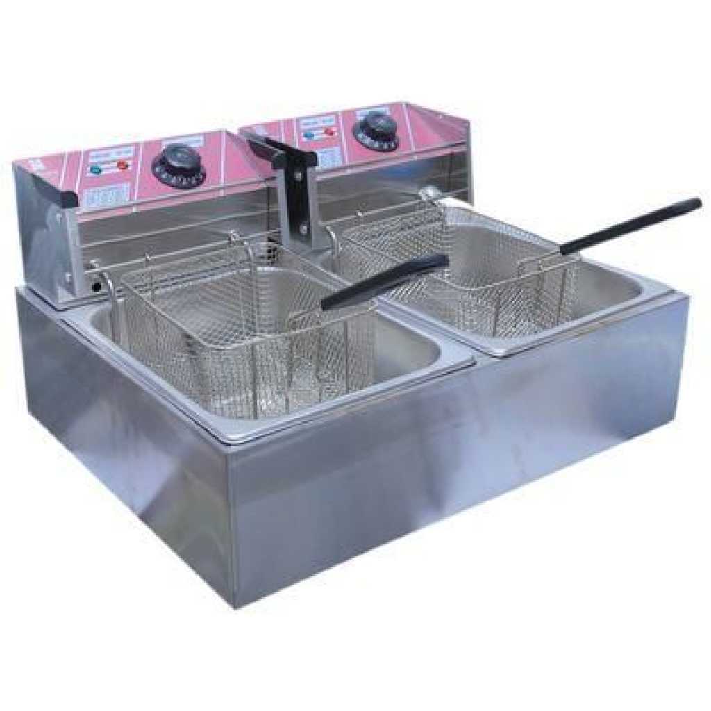 This double deep fryer is the best for commercial use in hotels, restaurants, takeaway kiosks and home also . The product is made of a strong board that can resist any kind of heat and with stand working for longer hours, it also has a strong heater that is made capable to work for longer hours and also fast heating to safe power and time. The fryer comes with two stainless steel oil bowls that helps not to mix up food of different cooking heat percentages, or not to mix spices with non spiced foods, like chicken can be put in one bowl and french fries in another bowl. This also saves time since you cook two different foods at the same time. The fryer has two removable stainless steel colanders which make removing easy, it also has heat control nods on each heater which help in heat regulation,the fryer colanders are all insulated with black handles which keeps the user safe from any accidental burns during frying.