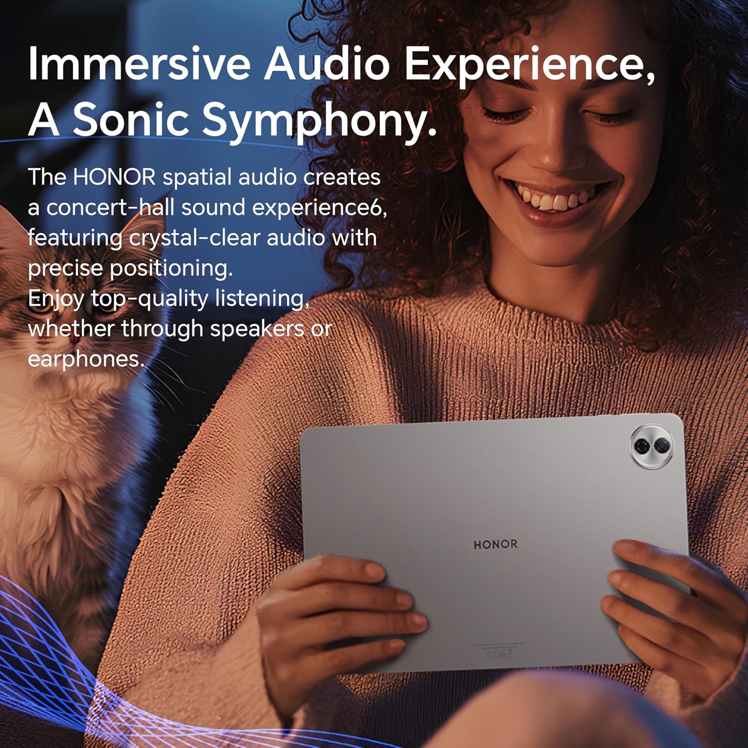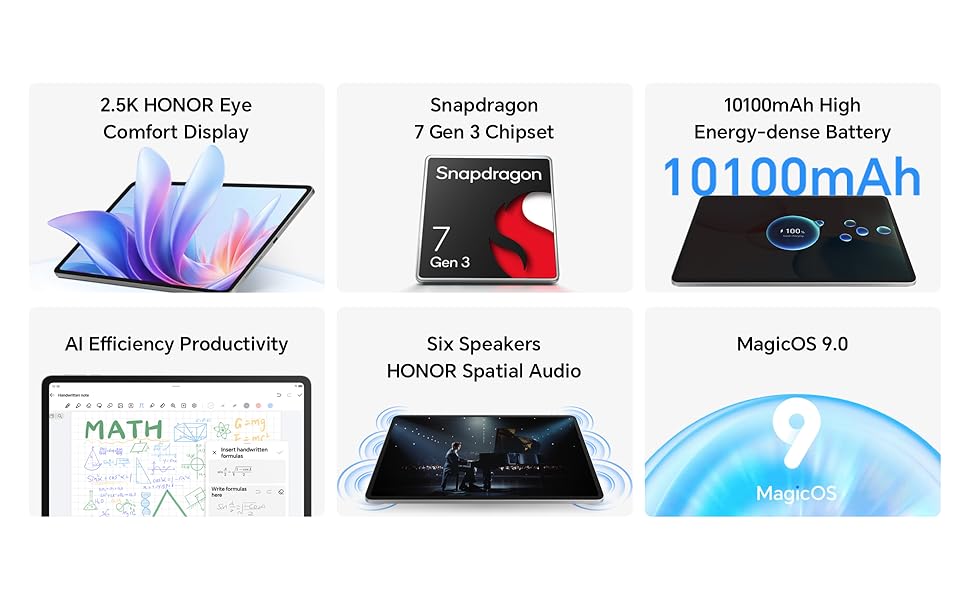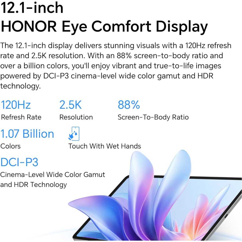 Key Features: ✅ [12.1″ 2.5K HONOR EYE COMFORT DISPLAY] – Large immersive screen with HDR, 120Hz refresh rate, and TÜV Rheinland low blue light certification — perfect for reading, streaming, or working long hours. [SNAPDRAGON 7 GEN 3 PERFORMANCE] – Equipped with an advanced 4nm chipset and 8GB RAM for smooth multitasking, app usage, and gaming. [FREE DETACHABLE KEYBOARD CASE + HONOR CHOICE PENCIL] – Boost your productivity with a full-function keyboard that doubles as a protective stand, plus a precision stylus for sketching and note-taking. [IMMERSIVE 6-SPEAKER SURROUND SOUND] – Enhanced stereo setup for crystal-clear audio while watching content, attending calls, or listening to music. [MASSIVE 10100MAH BATTERY + 35W FAST CHARGING] – All-day usage powered by a long-lasting battery and fast USB Type-C charging — ideal for travel, study, or hybrid work.
