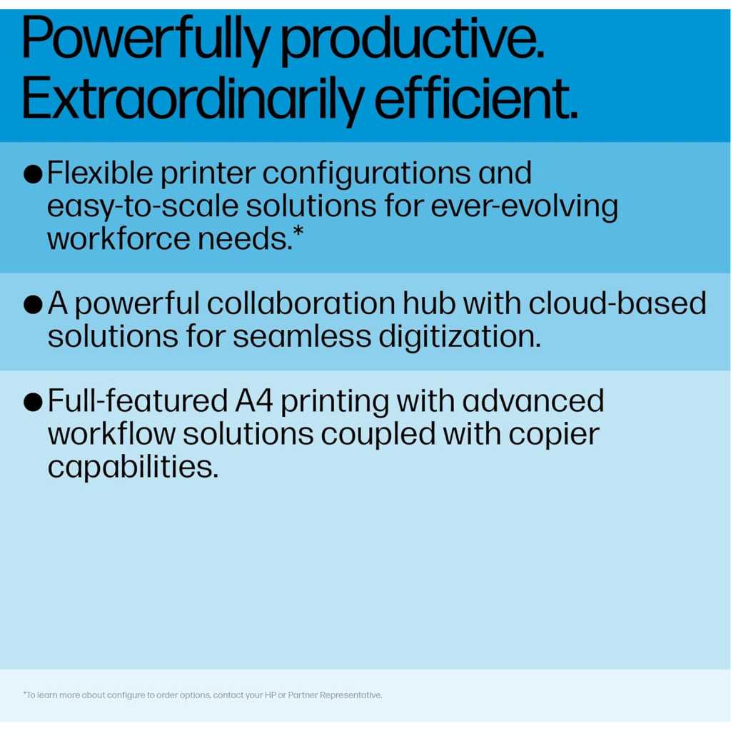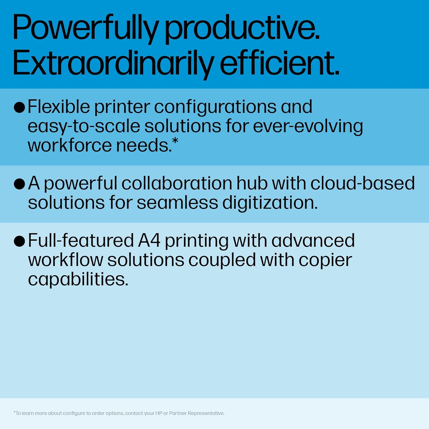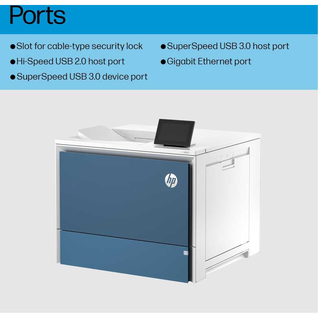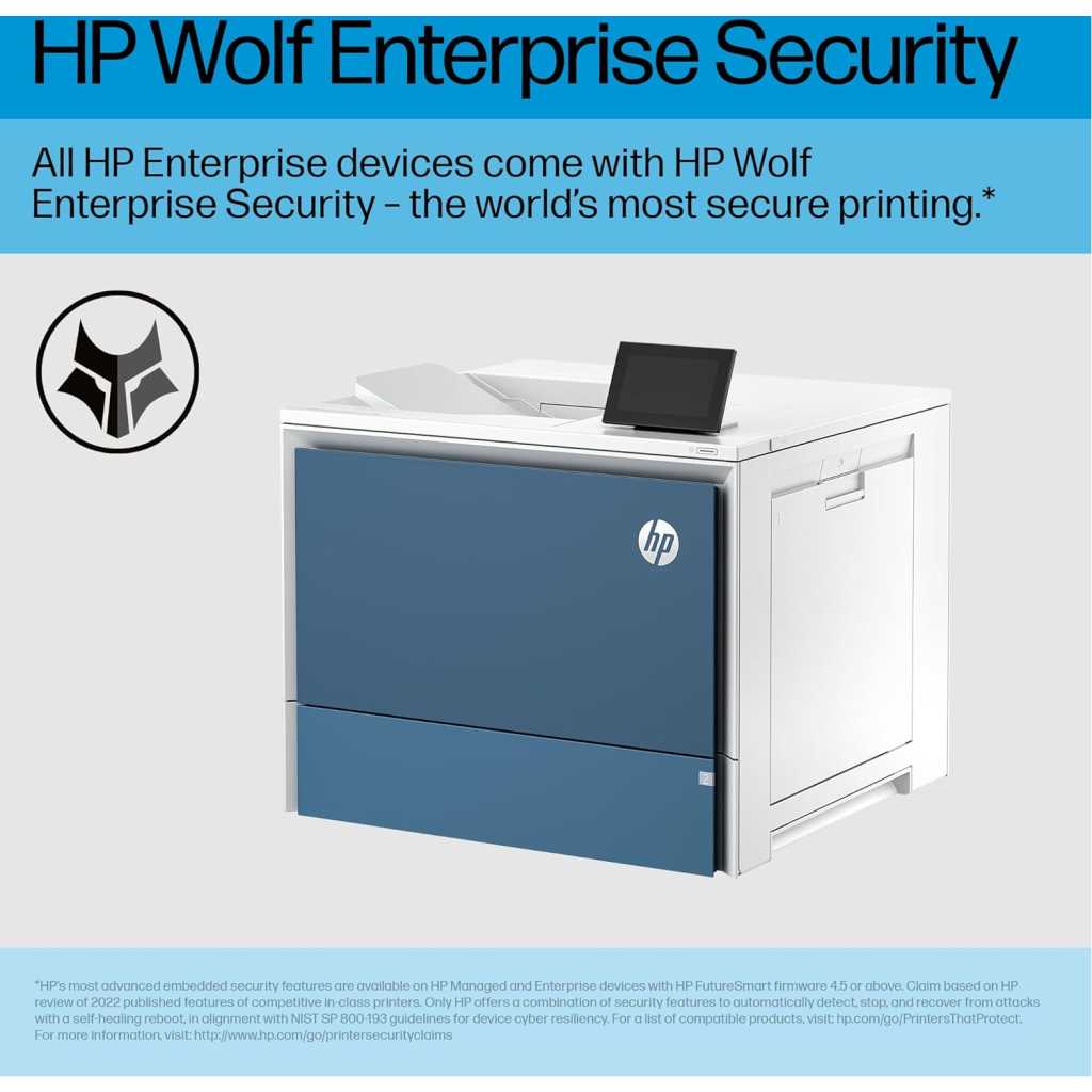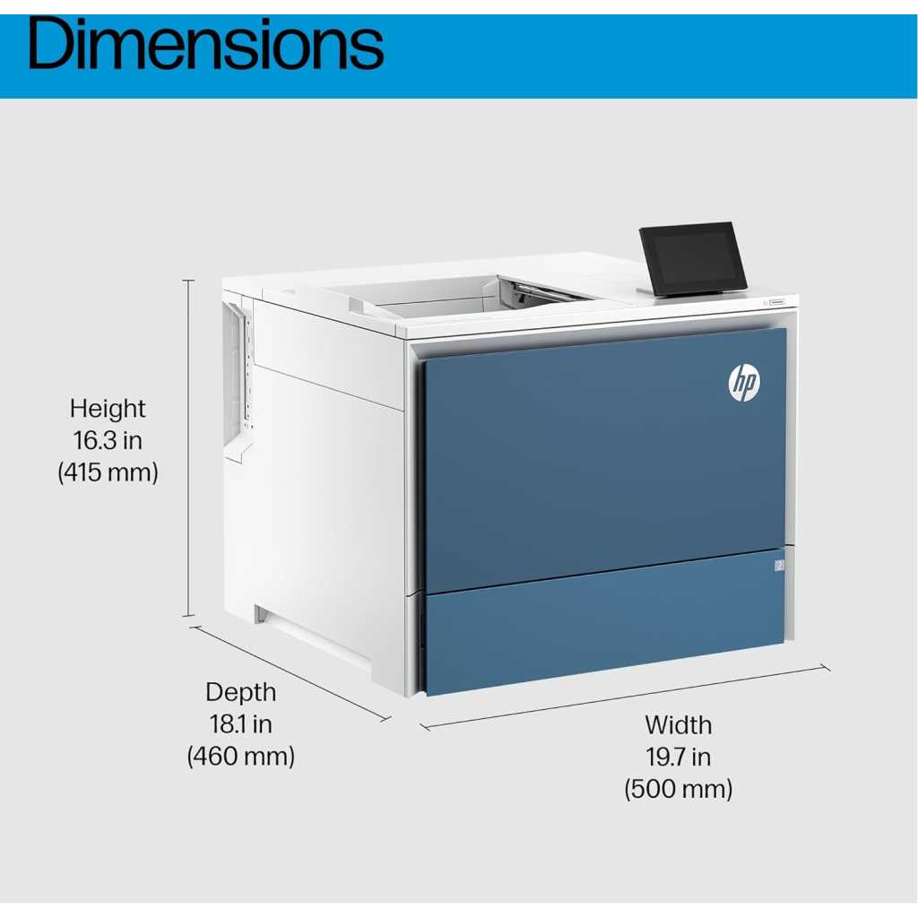 Key Features: Print Technology : Laser (Color) Processor : 1.2 GHz ARM Cortex-A9 Memory : 1.5 GB RAM Print Speed : Up to 55 ppm (black/color) First Page Out : As fast as 6.4 seconds Print Resolution : Up to 1200 x 1200 dpi Monthly Duty Cycle : Up to 100,000 pages Duplex: Automatic two-sided printing Recommended Monthly Volume : 5,000 to 25,000 pages Input Capacity : 650 sheets standard (expandable) Output Capacity : 500 sheets Display : 4.3-inch color touchscreen Connectivity : Gigabit Ethernet, USB 2.0, optional wireless Security : HP Wolf Enterprise Security Dimensions : 18.3 x 18.9 x 15.7 in Weight : Approx. 60.6 lbs (27.5 kg)
