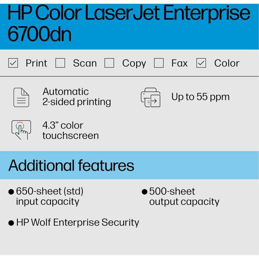 The HP Color LaserJet Enterprise 6700dn is a high-performance, secure, and scalable color laser printer designed for demanding business environments. Replacing the HP 652dn, this model delivers exceptional speed, robust security, and professional-quality color output, making it ideal for workgroups that require reliable and efficient document handling. With a print speed of up to 55 pages per minute (ppm) in both black and color, and first-page-out times as fast as 6.4 seconds , the 6700dn ensures minimal wait times and maximum productivity. Its 1200 x 1200 dpi resolution ensures crisp text and vibrant graphics, while HP ImageREt 3600 technology enhances image quality for professional-grade results. The printer features automatic duplex printing , reducing paper usage and supporting sustainability goals. Its 650-sheet input capacity (expandable) and 4.3-inch color touchscreen make it easy to manage large print jobs and navigate settings. Powered by a 1.2 GHz Cortex-A9 processor and 1.5 GB RAM, it handles complex documents and workflows with ease. Security is a cornerstone of the 6700dn, with HP Wolf Enterprise Security providing real-time threat detection and firmware integrity checks. The printer supports HP FutureSmart firmware , allowing for feature upgrades and consistent fleet management. Whether you’re printing marketing materials, reports, or high-volume office documents, the HP 6700dn delivers speed, quality, and reliability in a compact, energy-efficient design. Technical Specifications Print Technology : Laser (Color) Processor : 1.2 GHz ARM Cortex-A9 Memory : 1.5 GB RAM Print Speed : Up to 55 ppm (black/color) First Page Out : As fast as 6.4 seconds Print Resolution : Up to 1200 x 1200 dpi Monthly Duty Cycle : Up to 100,000 pages Duplex: Automatic two-sided printing Recommended Monthly Volume : 5,000 to 25,000 pages Input Capacity : 650 sheets standard (expandable) Output Capacity : 500 sheets Display : 4.3-inch color touchscreen Connectivity : Gigabit Ethernet, USB 2.0, optional wireless Security : HP Wolf Enterprise Security Dimensions : 18.3 x 18.9 x 15.7 in Weight : Approx. 60.6 lbs (27.5 kg)