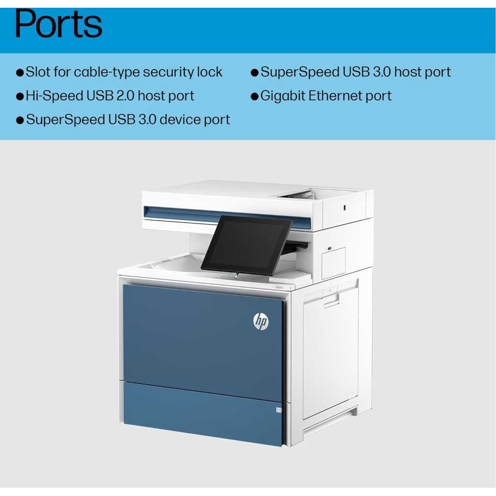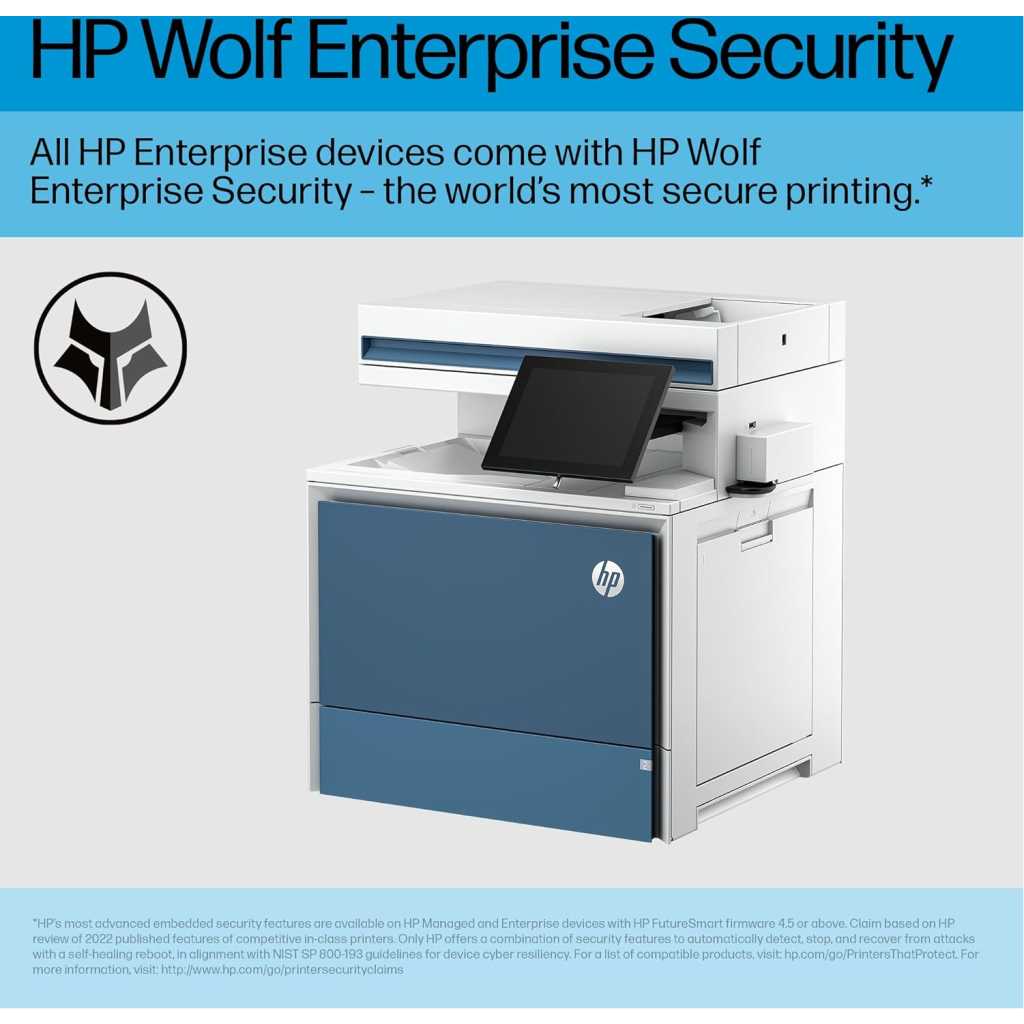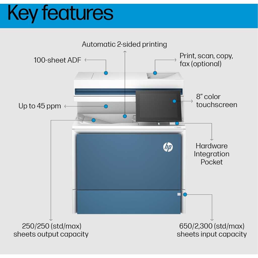 Key Features: Functions: Print, copy, scan Print Speed: Up to 45 ppm (black and color) First Page Out: As fast as 8.5 sec (black) Print Resolution: Up to 1200 x 1200 dpi Duplex Printing: Automatic Mobile Printing: Apple AirPrint, Mopria-certified Connectivity: Gigabit Ethernet, USB Scanner Type: Flatbed, ADF Scan Speed: Up to 100 ipm (duplex) Scan Resolution: Up to 1200 x 1200 dpi Scan to: Email, network folder, USB Copy Speed: Up to 45 cpm (black and color) Copy Resolution: Up to 600 x 600 dpi Input Capacity: 650 sheets (standard), up to 3,250 sheets (with optional trays) Output Capacity: 250 sheets Display: 8-inch color touchscreen Processor: 1.2 GHz Memory: 2 GB Duty Cycle: Up to 175,000 pages Dimensions: 22.9 x 20.1 x 22.6 inches Weight: 72.8 lbs Security Features: HP Wolf Pro Security, secure boot, password protection