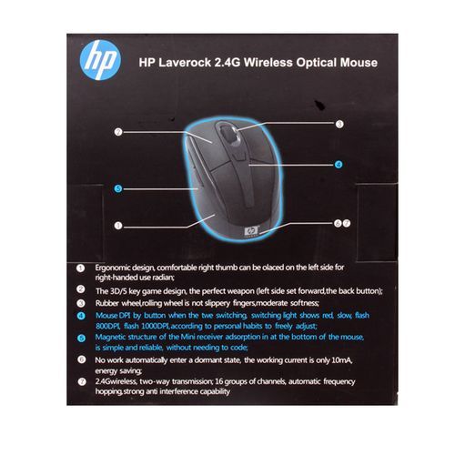 HP Laverock 2.4G Wireless Optical Mouse HP Laverock Wireless Optical Mouse allows you to enjoy the precision, style & comfort and is the perfect companion for the person on the go! And our incomparably low prices sweeten the offer for this exceptional product! Features Ergonomic design, suitable for right-handed use 5 button design: A online gamer’s best tool (A forward and backward button is set on the left) Rubber scroll wheel, which can be scrolled without slipping; Moderate hardness and softness It goes into sleep mode automatically when not in use; Energy saving – The electric current for working is only 10mA 2.4GHZ wireless technology; Two-way transmission; 16 groups working channels; Automatic frequency-hopping; Anti-jamming capability