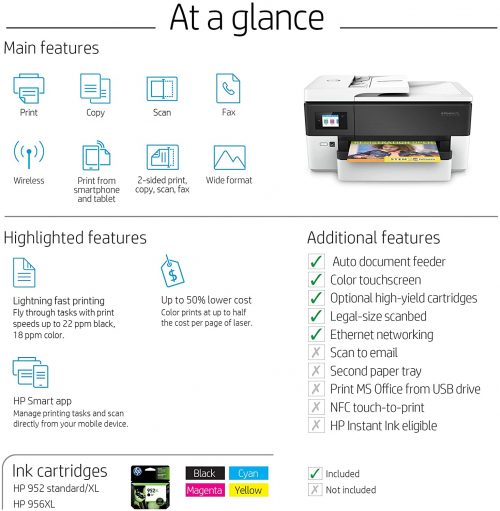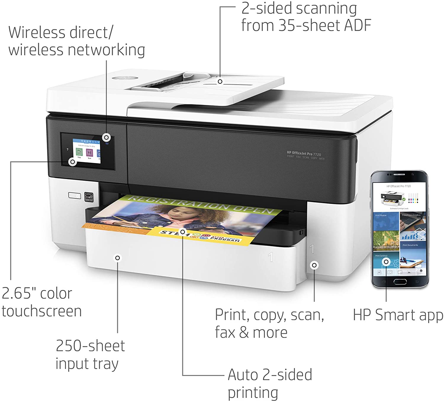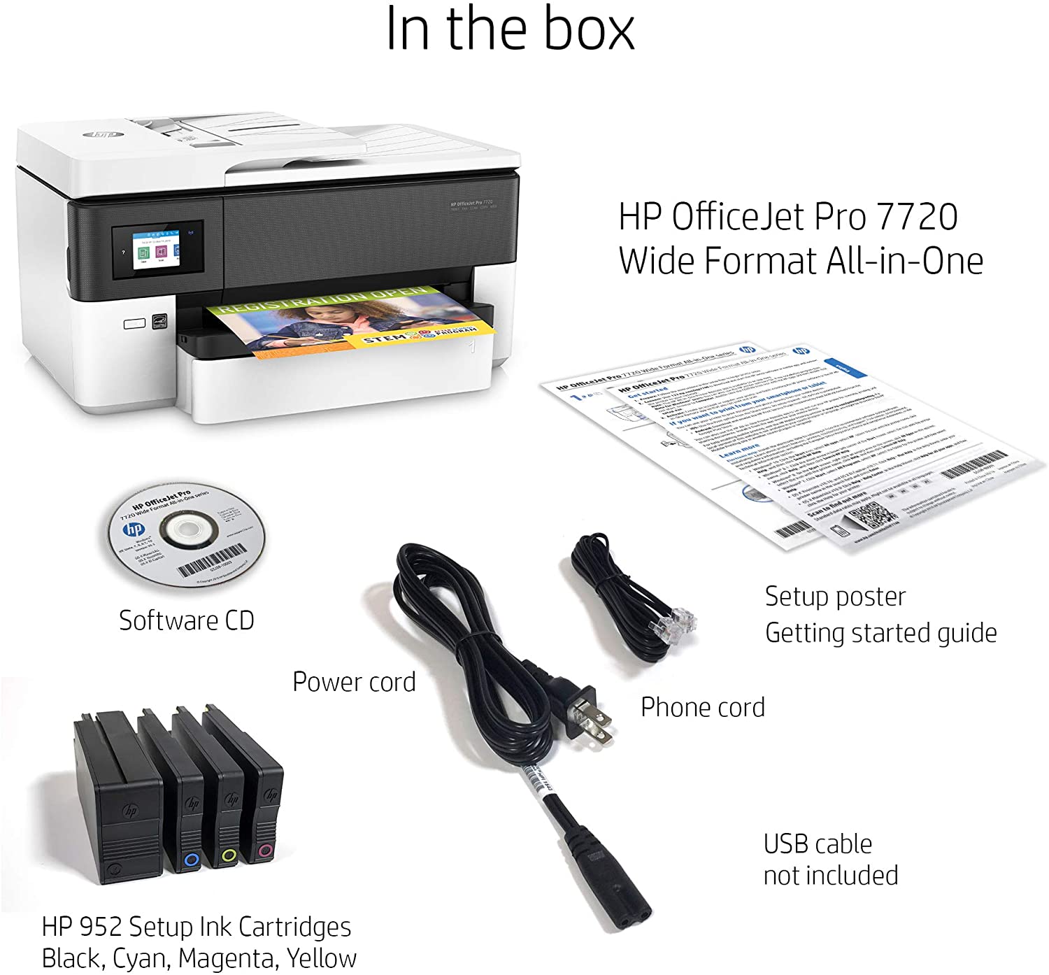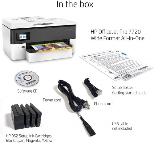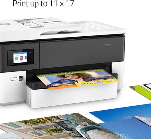 Key Features: HP Officejet Pro 7720 Printer, All In One Wide Format Printer with Wireless Printing Printer (11 x 17) for the office, print up to 11 x 17, scan and copy up to legal size with this all-in-one, high volume printer. Easily print from your mobile device; Just connect your iOS or Android device and print with Wi-Fi or AirPrint with the HP Officejet Pro 7720 printer. Professional color prints, borderless printing, brochures, posters and more with stunning vibrant color. Our most powerful printing application, the HP Smart Printer APP is intuitively designed making it easy to set up, scan business documents with your camera, and print through online services like iCloud, Google Drive, and Dropbox. Glide through tasks. Take control of printing, scanning, copying and faxing using automatic duplexing with a self-feeder, color touchscreen, and time-saving shortcuts. Use Original HP 952 & HP 952XL ink cartridges for great results after printing. Supported paper sizes include letter, legal, executive, tabloid, statement, super B, envelopes, cards, 3×5, 4×6, 5×7, 5×8, 8×10, 11×14, 12×12.