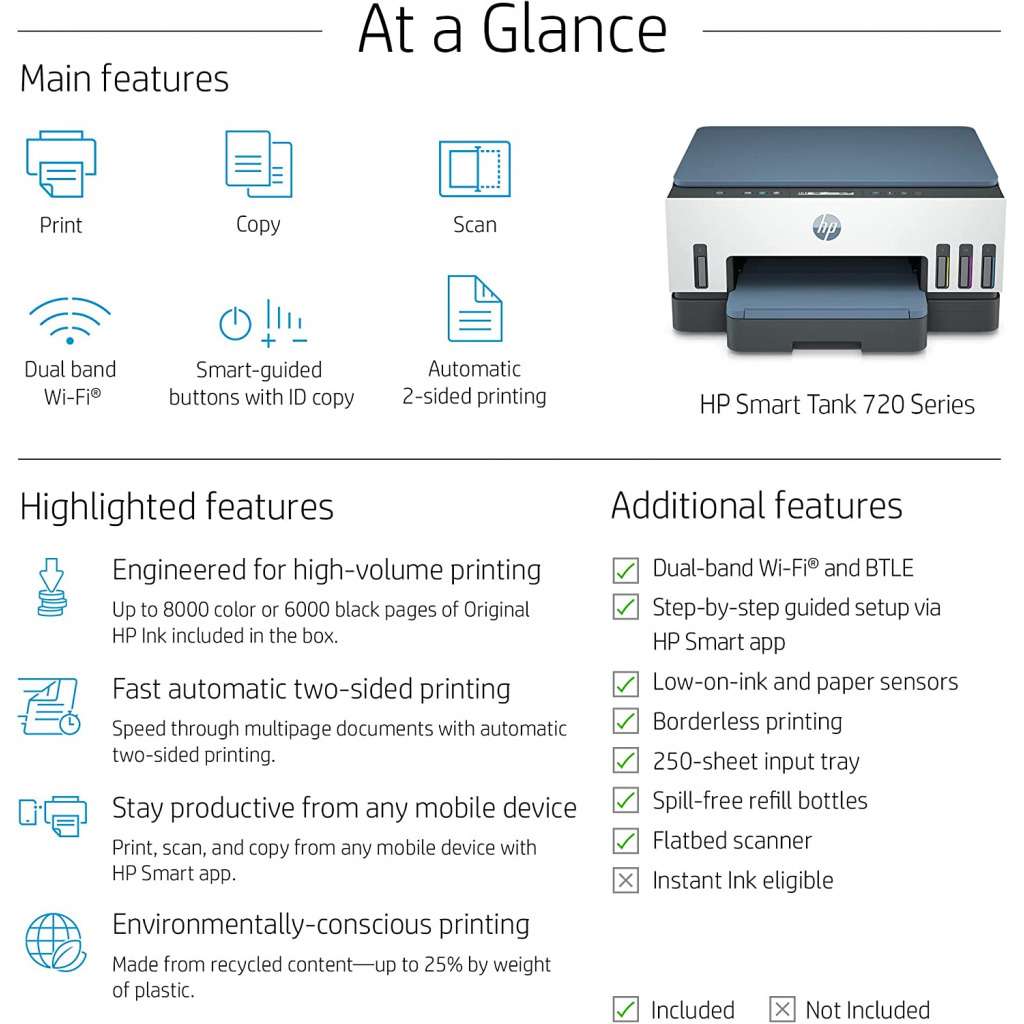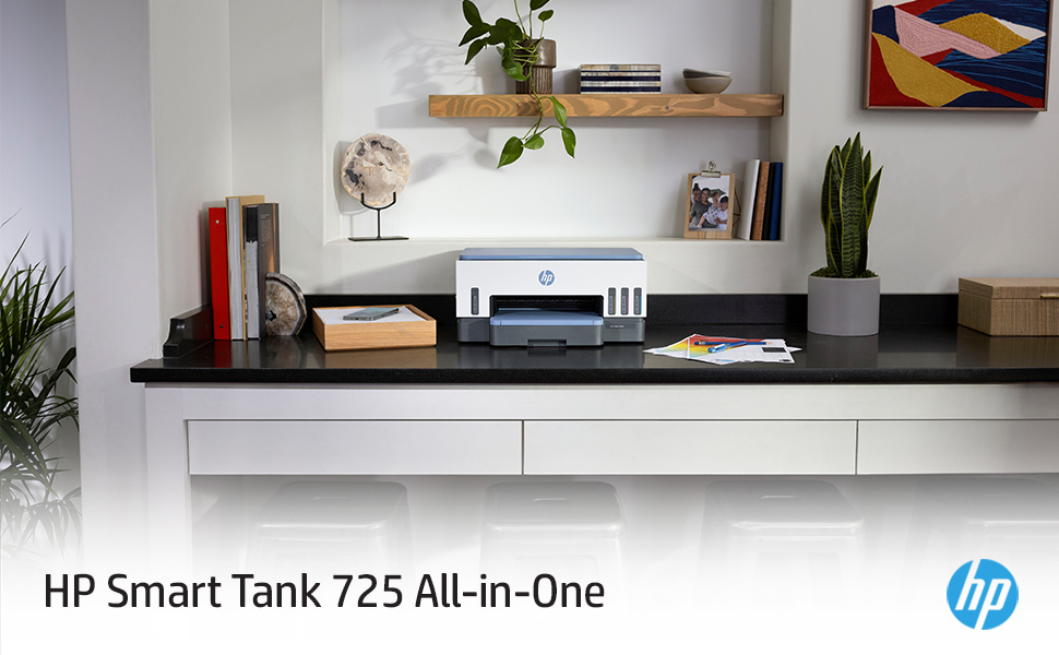 Key Features: HP Smart Tank 725 All-in-One Printer wireless, Print, Scan, Copy, Auto Duplex Printing, Print up to 18000 black or 8000 color pages, White/Blue [28B51A] Engineered for high-volume printing : Get up to 18,000 black or 8,000 colour pages of Original HP Ink included in the box. More easily copy IDs : Easily detects and copy IDs, and print on one page. Exceptional HP quality : Count on dark, crisp text, and get vibrant colour graphics for all your prints. Automatic two-sided printing : Speed through multi-page documents with automatic two-sided printing. Environmentally conscious printing : This printer is made from recycled printers and other electronics – more than 25% by weight of plastic.