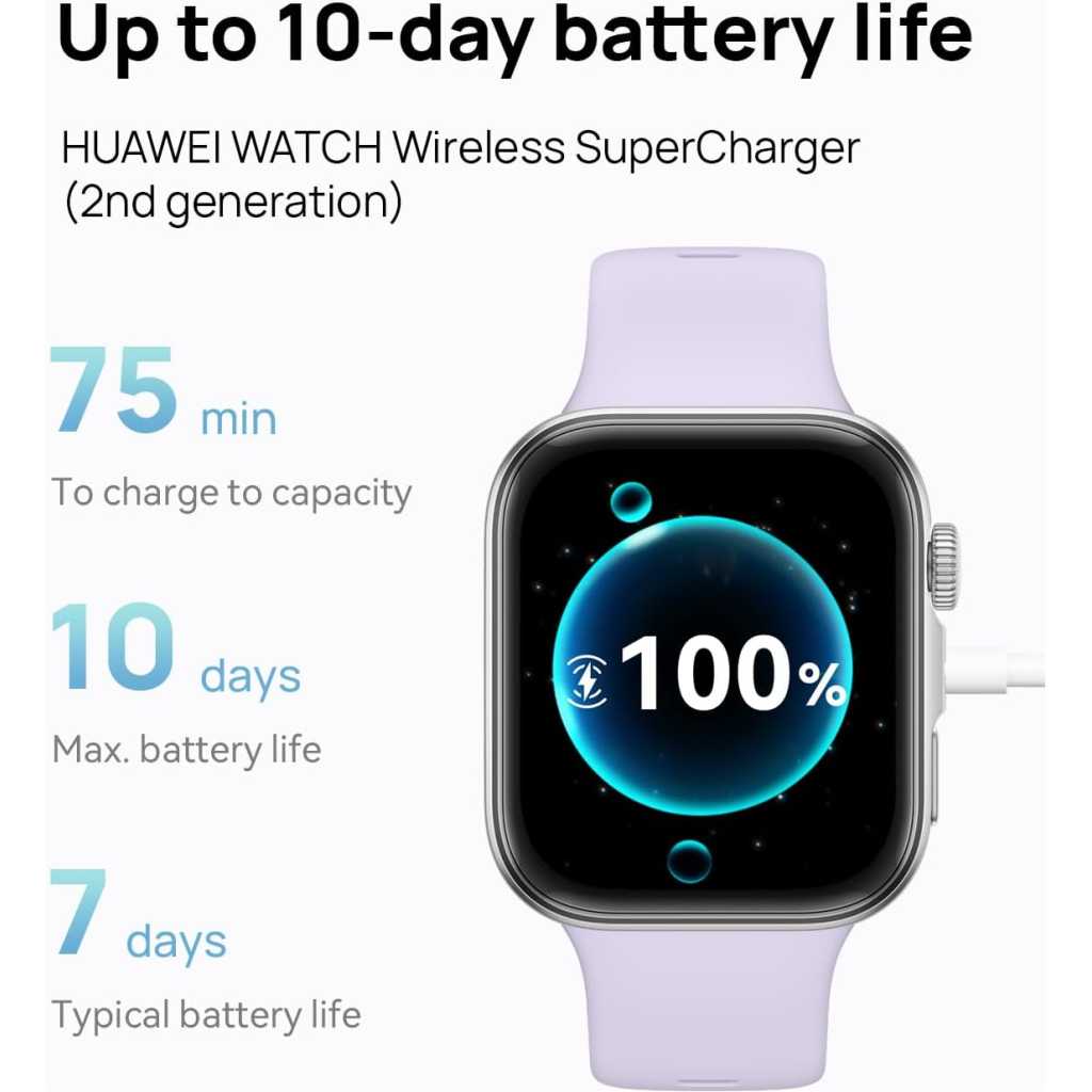 Key Features: Slimmed-down Design for Comfort: Sleek, stylish, and featherlight at just 27 g and 9.5 mm thick. The 3D wing-like design adds a touch of elegance that moves with you, whether you’re at work or working out Up to 10-day Battery Life: Charge for just 10 minutes to get a full day’s use. With the 2nd-gen Wireless SuperCharger, you’ll enjoy up to 10 days of battery life for uninterrupted performance Broadly Compatible: Pair with both iOS and Android devices to stay connected on your terms. Receive notifications, sync your data, and track fitness goals with ease Wrist-based Health Insights: Access HUAWEI’s Health Insights app for tailored guidance—from stress and recovery tips to sleep and workout optimisation—all based on your real-time health data Precise Positioning: The advanced Sunflower Positioning System detects your activity type and delivers ultra-precise tracking for walking, running, cycling, hiking and more