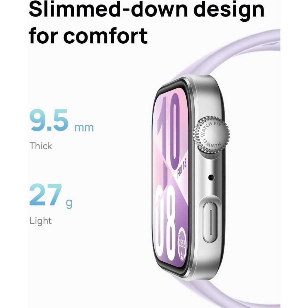 Slimmed-down Design for Comfort: Sleek, stylish, and featherlight at just 27 g and 9.5 mm thick. The 3D wing-like design adds a touch of elegance that moves with you, whether you’re at work or working out Up to 10-day Battery Life: Charge for just 10 minutes to get a full day’s use. With the 2nd-gen Wireless SuperCharger, you’ll enjoy up to 10 days of battery life for uninterrupted performance Broadly Compatible: Pair with both iOS and Android devices to stay connected on your terms. Receive notifications, sync your data, and track fitness goals with ease Wrist-based Health Insights: Access HUAWEI’s Health Insights app for tailored guidance—from stress and recovery tips to sleep and workout optimisation—all based on your real-time health data Precise Positioning: The advanced Sunflower Positioning System detects your activity type and delivers ultra-precise tracking for walking, running, cycling, hiking and more Operating System HarmonyOS Memory Storage Capacity 4 GB Special Feature Touchscreen, Lightweight, Multisport Tracker, Activity Tracker, Always On Display Battery Capacity 400 Milliamp Hours Connectivity Technology Bluetooth Wireless Communication Standard Bluetooth Battery Cell Composition Lithium Polymer GPS Built-in GPS Screen Size 1.82 Inches Brand HUAWEI