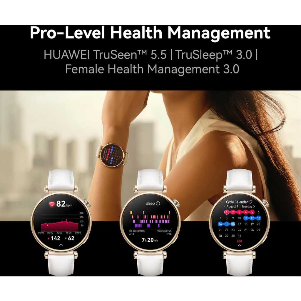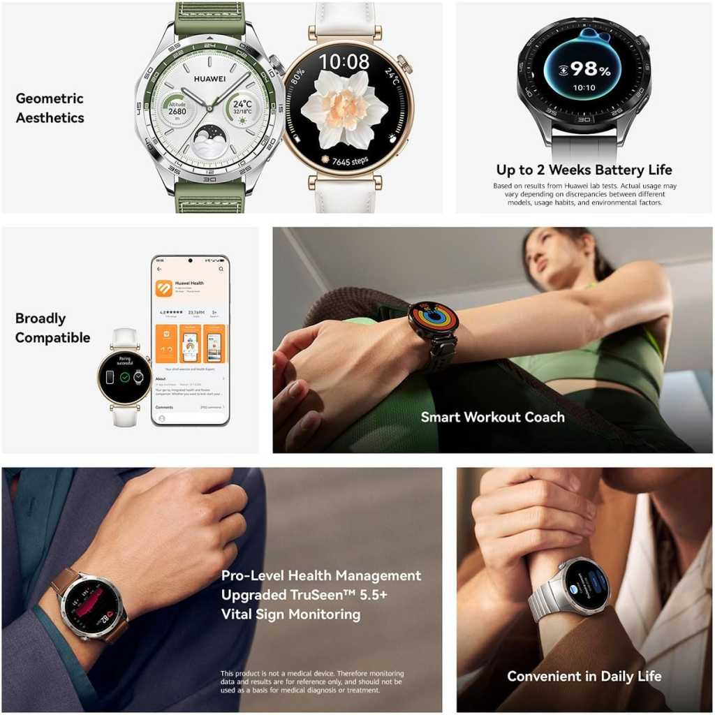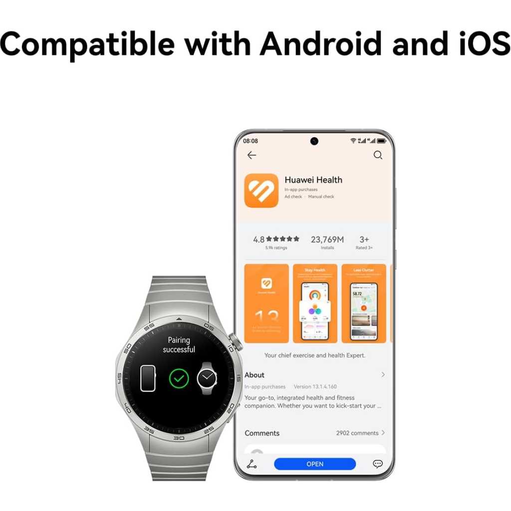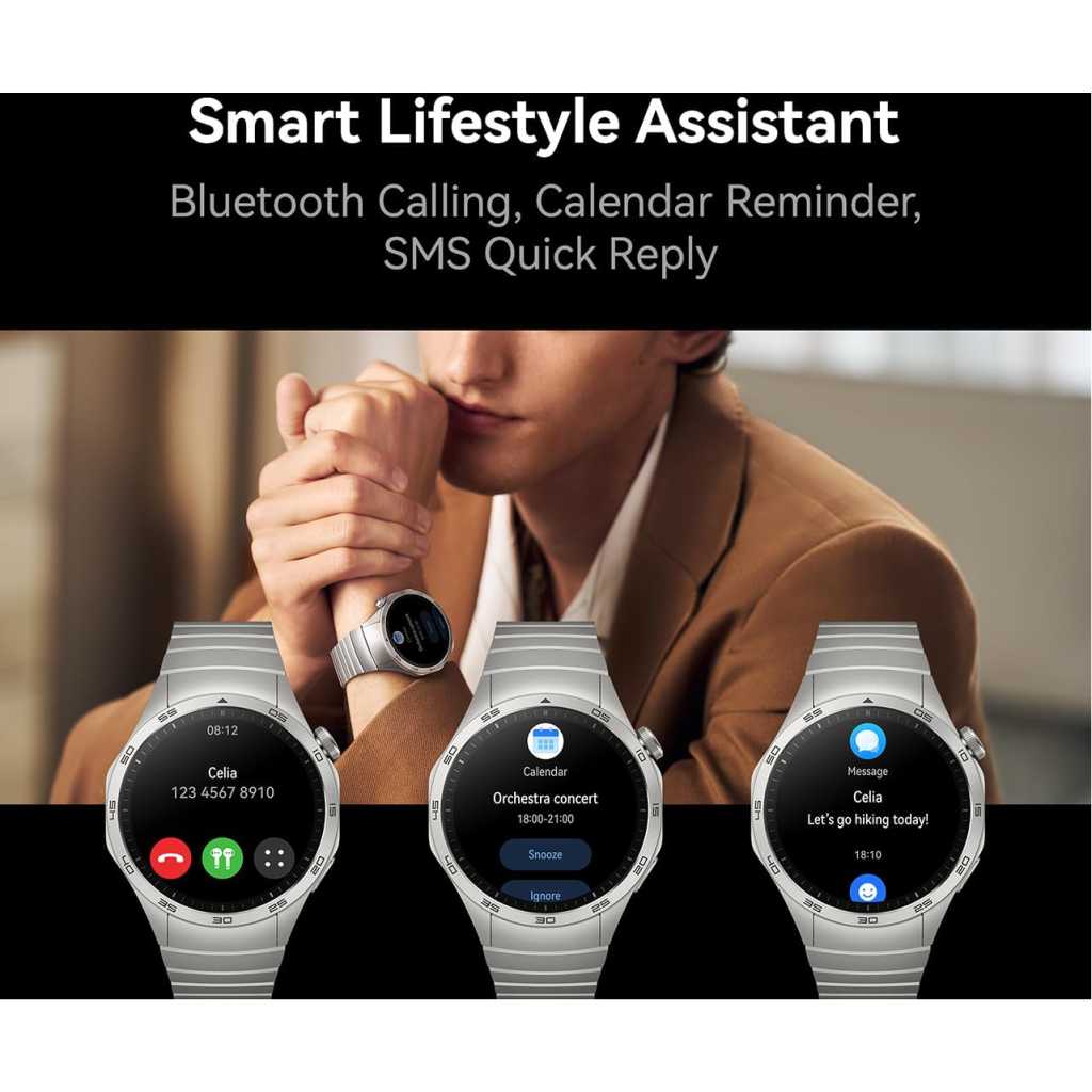 Key Features: A smart satellite antenna array boosts the accuracy of huawei watch gt 4 46 mm’s gnss signals by 30% to keep you on track in avenues parks or residential units and with a smart fusion positioning algorithm The new stay fit app backed by huawei truseen™ 55+ tech helps you keep track of how many calories you’re consuming at a glance with high level metrics like real time calorie intake active calories resting calories and calorie deficit Pro level health management pulse wave arrhythmia analysis upgraded huawei truseen™ 55+ heart rate monitoring spo2 monitoring intelligent cycle tracking trusleep™ sleep breathing 14 day battery life you can enjoy 8 day battery life for typical usage and up to 14 day battery life for given special conditions Convenient in daily life and broadly compatible bluetooth calling calendar reminder sms quick reply watch face store huawei watch gt 4 is compatible with both ios and android for greater ease of use