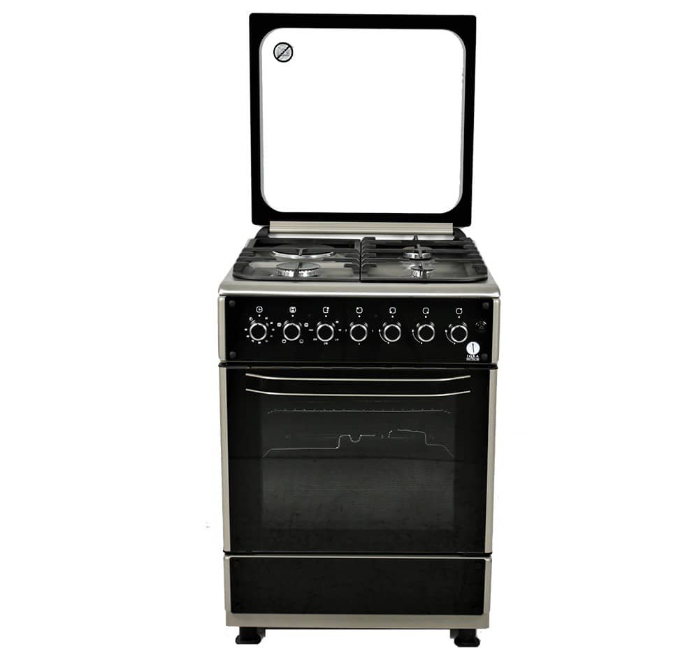 IQRA 60x60cm Cooker IQ-FC6011SS; 3 Gas Burners + 1 Electric Plate With Electric Oven and Grill, Oven Timer, Auto Ignition, Grill & Rotisserie – Stainless Steel. 3 Multigas (Euro Type Pool) Burners + 1 Hot Plate (145mm-1000Watts) WxDxH; 60x60x85cm Electric Oven with Up and Down Heating Elements Thermostat, Electric Grill, Enameled Pan Support, Push Button Ignition for Hob Burners, Metal Top Lid, Oven Lamp, Rotisserie, Timer, Cool Door II(Removable inner Glass), 1 Oven Tray, 1 Oven Grid, Adjustable Feet, Hob Stainless Steel/Rest Silver Color(Glass Panels Elite Design) 1-year warranty